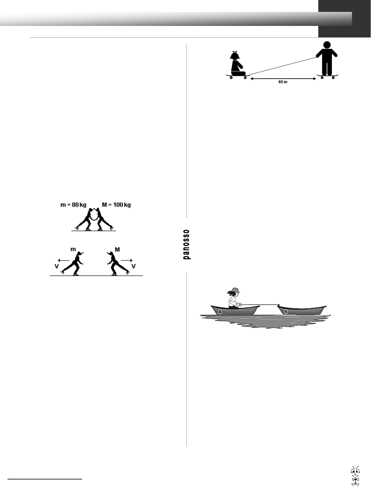 Sistema mecânico isolado www.professorpanosso.com.br 1 Prof. Panosso Exercícios de Física 1) Um canhão, inicialmente em repouso, de massa 600 kg, dispara um projétil de massa 3 kg com velocidade horizontal de 800 m/s. Desprezando todos os atritos, podemos afirmar que a velocidade de recuo do canhão é de: a) 2 m/s b) 4 m/s c) 6 m/s d) 8 m/s e) 12 m/s 2) Dois astronautas, A e B, encontram-se livres na parte externa de uma estação espacial, sendo desprezíveis as forças de atração gravitacional sobre eles. Os astronautas com seus trajes espaciais têm massas mA = 100 kg e mB = 90 kg, além de um tanque de oxigênio transportado pelo astronauta A, de massa 10 kg. Ambos estão em repouso em relação à estação espacial, quando o astronauta A lança o tanque de oxigênio para o astronauta B com uma velocidade de 5,0 m/s. O tanque choca-se com o astronauta B que o agarra, mantendo-o junto a si, enquanto se afasta. a) Calcule a velocidade de recuo do astronauta A, após jogar o tanque de oxigênio. b) Qual a velocidade do astronauta B, após agarrar o tanque de oxigênio? 3) Dois patinadores, um de massa 100kg e outro de massa 80kg, estão de mãos dadas em repouso sobre uma pista de gelo, onde o atrito é desprezível. Eles empurram-se mutuamente e deslizam na mesma direção, porém em sentidos opostos. O patinador de 100kg adquire uma velocidade de 4m/s. A velocidade relativa de um dos patinadores em relação ao outro é, em módulo, igual a: a) 5 m/s b) 4 m/s c) 1 m/s d) 9 m/s e) 20 m/s 4) Um casal de patinadores pesando 80 kg e 60 kg, parados um de frente para o outro, empurram-se bruscamente de modo a se movimentarem em sentidos opostos sobre uma superfície horizontal sem atrito. Num determinado instante, o patinador mais pesado encontra-se a 12 m do ponto onde os dois se empurraram. Calcule a distância, em metros, que separa os dois patinadores neste instante. 5) Uma flecha de massa 100g, a uma velocidade de 24m/s encontra uma ave, com massa de 900g, livre, em repouso sobre um galho. A ave ferida mais a flecha passam a ser um único corpo, com velocidade final, em m/s, de a) zero. b) 0,6. c) 1,2. d) 2,4. e) 6. 6) Um skatista, sabendo que sua massa é de 45 kg, deseja saber a massa de sua irmãzinha menor. Sendo ele um bom conhecedor das leis da Física, realiza o seguinte experimento: ele fica sobre um skate e coloca sua irmãzinha sentada em outro skate, distante 40 m de sua posição, conforme figura a seguir. Uma corda muito leve é amarrada no skate da irmãzinha e o skatista exerce um puxão na corda, trazendo o skate e a irmãzinha em sua direção, de forma que ambos se encontram a 10 m da posição inicial do skatista. Sabendo-se que cada skate possui massa de 1 kg e, desprezando o peso da corda e o atrito das rodas dos skates com o chão, após alguns cálculos o skatista conclui que a massa de sua irmãzinha é de a) 11,25 kg. b) 5,1 kg. c) 15,0 kg. d) 14,3 kg. 7) Um trenó, com massa total de 250kg, desliza no gelo à velocidade de 10 m/s. Determine a velocidade do trenó se o seu condutor atirar para trás 50 kg de carga à velocidade de 10m/s. 8) Imagine a seguinte situação: um dálmata corre e pula para dentro de um pequeno trenó, até então parado, caindo nos braços de sua dona. Em consequência, o trenó começa a se movimentar. Considere os seguintes dados: I. a massa do cachorro é de 10kg; II. a massa do conjunto trenó + moça é de 90kg; III. a velocidade horizontal do cachorro imediatamente antes de ser seguro por sua dona é de 18km/h. a) Desprezando-se o atrito entre o trenó e o gelo, determine a velocidade horizontal do sistema trenó + moça + cachorro, imediatamente após o cachorro ter caído nos braços de sua dona. b) Determine a variação de energia cinética no processo. 9) Na situação apresentada na figura a seguir desconsidere o efeito do atrito. Estando todas as partes em repouso no início, uma pessoa puxa com sua mão uma corda que está amarrada ao outro barco. Considere que o barco vazio (B) tenha a metade da massa do barco mais a pessoa que formam o conjunto (A). Assinale a(s) proposição(ões) CORRETA(S). (01) Após a pessoa puxar a corda, ambos os barcos se moverão com a mesma velocidade. (02) Após o puxar da corda, o módulo da velocidade de B será o dobro do módulo da velocidade de A. (04) É impossível fazer qualquer afirmação sobre as velocidades das partes do sistema ao se iniciar o movimento. (08) Após o puxar da corda, as quantidades de movimento dos barcos apresentarão dependência entre si. (16) Ao se iniciar o movimento, a energia cinética de A é sempre igual à energia cinética de B. 10) Todo caçador, ao atirar com um rifle, mantém a arma firmemente apertada contra o ombro evitando assim o "coice" da mesma. Considere que a massa do atirador é 95,0 kg, a massa do rifle é 5,00 kg e a massa do projétil é 15,0 g a qual é disparada a uma velocidade de 3,00 × 104 cm/s. Nestas condições, a velocidade de recuo do rifle (Vr) quando se segura muito frouxamente a arma e a velocidade de recuo do atirador (Va) quando ele mantém a arma firmemente apoiada no ombro serão, respectivamente: a) 0,90 m/s; 4,7 × 10² m/s Sistema mecânico isolado www.professorpanosso.com.br 2 Prof. Panosso Exercícios de Física b) 90,0 m/s; 4,7 m/s c) 90,0 m/s; 4,5 m/s d) 0,90 m/s; 4,5 × 10² m/s e) 0,10 m/s; 1,5 × 10² m/s 11) Uma pessoa de 40 kg patina agachada em uma superfície plana e lisa com velocidade constante de 2 m/s para a esquerda, quando é atingida por uma bola de 1,6 kg que vem em sentido contrário ao seu, com velocidade de 10 m/s. Sabendo que a pessoa agarra a bola, podemos afirmar que ambas se movem para a: a) direita, com velocidade de aproximadamente 8 m/s. b) direita, com velocidade de aproximadamente 1,5 m/s. c) esquerda, com velocidade de aproximadamente 2,3 m/s. d) esquerda, com velocidade de aproximadamente 1,5 m/s. 12) Dois patinadores de mesma massa deslocam-se numa mesma trajetória retilí