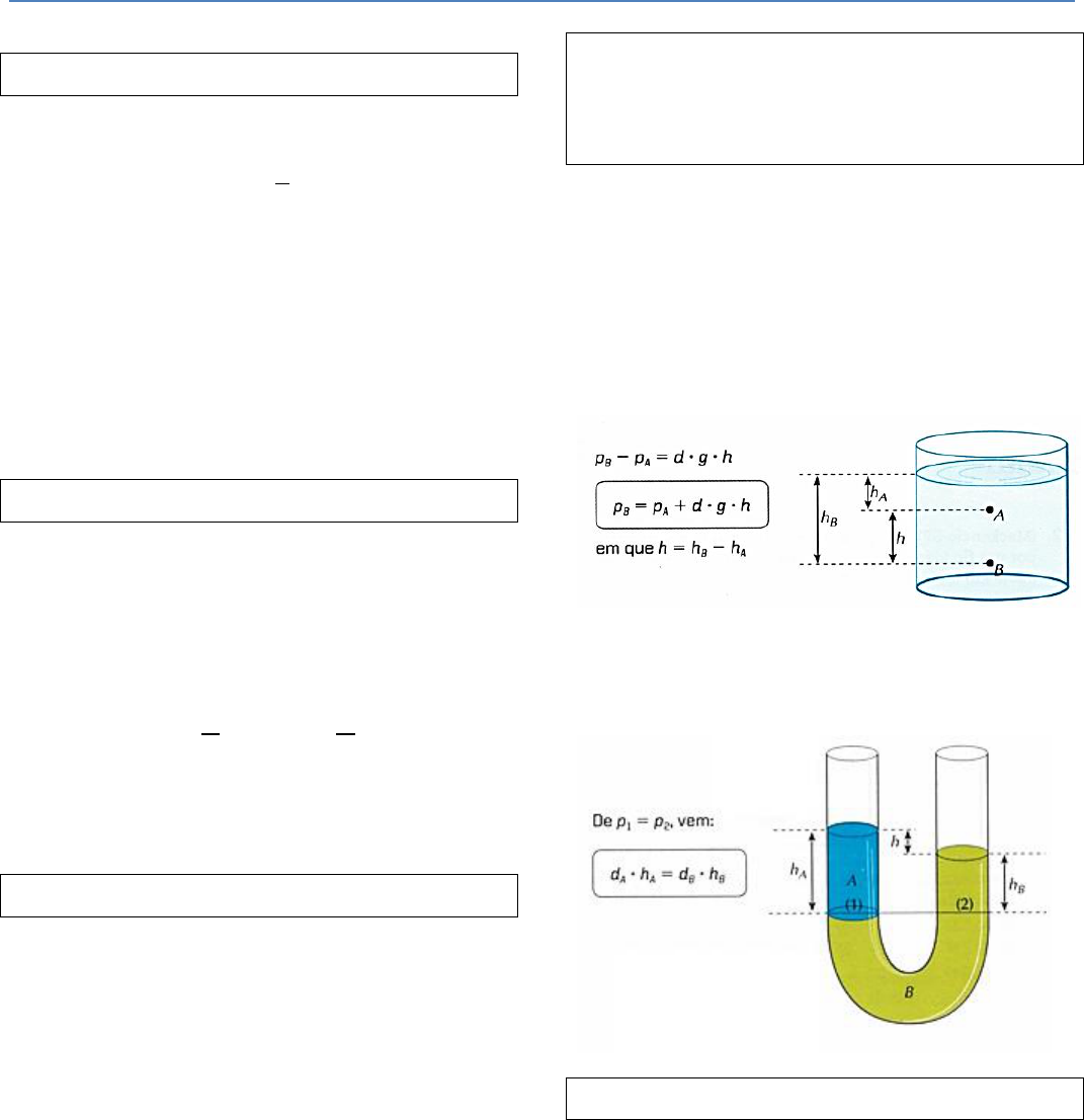 FÍ SÍCA: HÍDROSTA TÍCA PRESSÃO (sólidos) É a relação entre a intensidade da força que atua perpendicularmente e a área em que ela se distribui. Onde p é a pressão, em newton por metro quadrado (N/m2), apelidada de pascal (Pa), F é a força, em newtons (N) e A é a área em metros quadrados (m2). Todas essas unidades pertencem ao SI. Lembrando que: 1 kg = 1000 g e 1 m = 100 cm. Então: 2 g = 2 x 10-3 kg; 5 cm = 5 x 10-2 m; 5 cm2 = 5 x 10-4 m2. DENSIDADE E MASSA ESPECÍFICA Tanto a densidade quanto a massa específica são calculadas dividindo a massa pelo volume. A diferença é que a densidade é definida para um corpo e massa específica para uma substância. Quando um corpo é maciço os valores coincidem. Nos líquidos, não é necessário fazer essa distinção. Pode usar qualquer unidade para massa e para volume. A combinação mais comum é o g/cm3. TEOREMA DE STEVIN PRESSÃO DE LÍQUIDOS Os líquidos em equilíbrio estático exercem pressão no fundo do recipiente que os contém. Essa pressão não depende nem do formato nem do tamanho do recipiente, mas da altura da coluna líquida h. A pressão da coluna líquida depende da densidade do líquido d, da aceleração da gravidade g e da profundidade h em que o ponto que queremos calcular a pressão se encontra. Essa pressão é denominada pressão hidrostática. A pressão efetiva (total) no fundo do recipiente é a soma da pressão atmosférica com a pressão da coluna líquida: A pressão atmosférica vale 1 atm = 760 mmHg ≈ 1 x 105 N/m2. A densidade da água é 1 g/cm3 = 103 kg/m3. A diferença de pressão entre dois pontos de um líquido homogêneo e em equilíbrio é dada pela pressão exercida pela coluna líquida entre os dois pontos: Pontos situados na mesma superfície horizontal e pertencentes ao mesmo líquido têm pressões iguais. Uma das aplicações desse princípio são os vasos comunicantes com dois ou mais líquidos imiscíveis. PRINCÍPIO DE PASCAL Um acréscimo de pressão em um ponto de um dado fluido é transmitido integralmente a todos os pontos desse fluido. Assim, numa prensa hidráulica, êmbolos com área diferentes suportam a mesma pressão. Logo, as forças exercidas pelos êmbolos têm de ser diferentes. PRINCÍPIO DE ARQUIMEDES EMPUXO Quando um corpo é imerso em um fluido, pontos diferentes de sua superfície são submetidos a diferentes pressões. Os pontos mais profundos estão sob uma pressão maior que os mais rasos. O efeito total dessa variação de pressões é uma força vertical para cima, denominada empuxo. Todo corpo total ou parcialmente imerso num fluido e que se encontra em equilíbrio estático recebe uma força vertical para cima, cujo módulo equivale ao peso da porção de líquido deslocada pelo corpo. EQUILÍBRIO DE CORPOS FLUTUANTE No equilíbrio temos que o empuxo é igual ao peso do corpo. Logo: