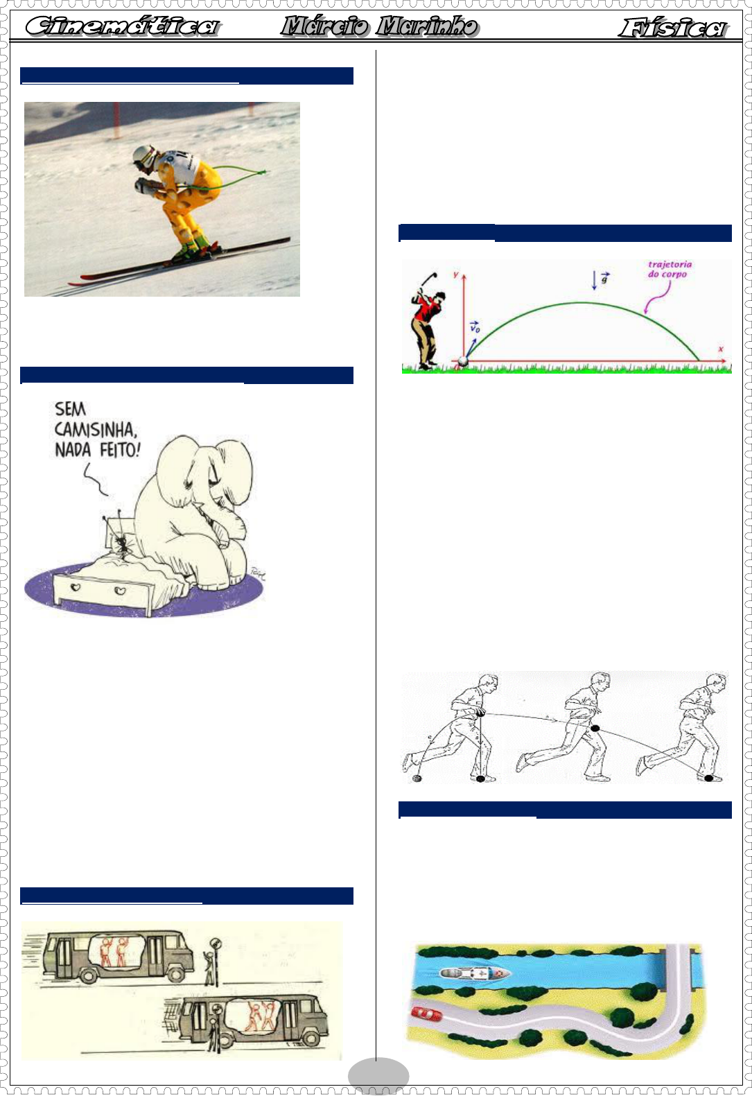 1 CINEMÁTICA - CONCEITOS INICIAIS REFERENCIAL: é o ponto ou corpo tomado como referência para o estudo do movimento. 1- PARTÍCULA OU CORPO EXTENSO PONTO MATERIAL: é todo corpo cujas dimensões não interferem no estudo de um determinado fenômeno. É também chamado de partícula. CORPO EXTENSO: é todo corpo cujas dimensões interferem no estudo de um determinado fenômeno. Exemplo: Um automóvel que transita por uma estrada entre uma determinada cidade até outra é considerado ponto material, ao passo que, se estiver manobrando para ocupar um lugar no estacionamento é considerado corpo extenso 2- REPOUSO OU MOVIMENTO REPOUSO E MOVIMENTO: Um ponto material éstá em movimento quando sua posição varia no decorrer do tempo em relação a um referencial. Se a posição não muda, então o corpo está em repouso. Ex.: Quando estamos sentados num ônibus que está andando, o mesmo está em repouso em relação a nós mas está em movimento em relação à rua, casas, postes, etc. 3- TRAJETÓRIA É a linha determinada pelas diversas posições que um corpo ocupa no decorrer do tempo. Ex.: As marcas deixadas pelos esquis de um esquiador em movimento, que representa o caminho percorrido pelo esquiador em relação a uma pessoa parada no solo. A trajetória depende do referencial adotado. De acordo com a trajetória, os movimentos recebem os seguintes nomes: - movimento retilíneo: a trajetória é uma reta - movimento curvilíneo: a trrajetória é uma curva 4- POSIÇÃO ESCALAR ESPAÇO (POSIÇÃO ESCALAR): é a medida da distância do corpo até a origem das posições, num determinado instante. - As posições à direita da origem tem sinal positivo - As posições à esquerda da origem tem sinal negativo 2 5 - DESLOCAMENTO E CAMINHO PERCORRIDO - Deslocamento de um móvel num dado intervalo de tempo é a diferença entre a posição final e a posição inicial que ocupa nos extremos desse intervalo. - Caminho percorrido, também chamado, espaço percorrido é e distância efetivamente percorrida (andada) pelo móvel. Ex.: Um aluno saiu de sua casa, às 7h, foi até a escola e às 12h voltou para sua casa, pelo mesmo caminho. A distância entre a casa e a escola é de 450m. Qual foi o deslocamento desde o instante em que saiu de casa até o instante em que retornou? Qual foi a distância percorrida pelo aluno? 6 - VELOCIDADE ESCALAR MÉDIA: É o quociente entre a variação do espaço do móvel, no decorrer do tempo, e o intervalo de tempo necessário para essa variação. Onde: ∆S = S – S0 e ∆t = t – t0 A unidade de velocidade no Sistema Internacional (SI) é o metro por segundo e se indica por m/s. Podemos, também, utilizar o quilômetro por hora, que se indica km/h. Obs.: - o velocímetro de um carro nos fornece o valor absoluto da velocidade escalar em cada instante. Essa velocidade é denominada velocidade escalar instatânea. - se o carro se movimentar no sentido positivo da trajetória teremos v > 0 - se o carro se movimentar no sentido negativo da trajetória teremos v < 0 - 1m/s = 3,6km/h - Movimento Progressivo: móvel caminha no sentido positivo da trajetória/ sua velocidade é positiva. - Movimento Retrógrado (Regressivo): móvel caminha no sentido negativo da trajetória/ sua velocidade é negativa. PROBLEMAS 1) Um trem anda sobre trilhos horizontais retilíneos com velocidade constante igual a 80 km/h. No instante em que o trem passa por uma estação, cai um objeto, inicialmente preso ao teto do trem. A trajetória do objeto, vista por um passageiro parado dentro do trem, será: 2) Em relação à situação descrita no teste anterior, qual será a trajetória do objeto vista por um observador parado na estação? (A seta imediatamente abaixo representa o sentido do movimento do trem para esse observador.) 3) Numa corrida de Fórmula 1 a volta mais rápida foi feita em 1 min e 20 s a uma velocidade média de 180 km/h. 3 Pode-se afirmar que o comprimento da pista, em m, é de: a) 180 b) 4000 c) 1800 d) 14400 e) 2160 4) A velocidade escalar média de um atleta que corre 100 m em 10 s é, em km/h: a) 3 b) 18 c) 24 d) 30 e) 36 5) Um automóvel passou pelo marco 24 km de uma estrada às 12 horas e 7 minutos. A seguir, passou pelo marco 28 km da mesma estrada às 12 horas e 11 minutos. A velocidade média do automóvel, entre as passagens pelos dois marcos, foi de aproximadamente: a) 12 km/h b) 24 km/h c) 28 km/h d) 60 km/h e) 80 km/h 6) Uma moto de corrida percorre uma pista que tem o formato aproximado de um quadrado com 5 km de lado. O primeiro lado é percorrido a uma velocidade média de 100 km/h, o segundo e o terceiro a 120 km/h e o quarto a 150 km/h. Qual a velocidade média da moto nesse percurso? a) 110 km/h b) 120 km/h c) 130 km/h d) 140 km/h e) 150 km/h 7) Após chover na cidade de São Paulo, as águas da chuva descerão o rio Tietê até o rio Paraná, percorrendo cerca de 1000 km. Sendo de 4 km/h a velocidade média das águas, o percurso mencionado será cumprido pelas águas da chuva em aproximadamente: a) 30 dias. b) 10 dias. c) 25 dias. d) 2 dias. e) 4 dias. 8) Ao fazer uma viagem de carro entre duas cidades, um motorista observa que sua velocidade média foi de 70 km/h, e que, em média, seu carro consumiu 1,0 litro de gasolina a cada 10 km. Se, durante a viagem, o motorista gastou 35 litros de gasolina, quantas horas demorou a viagem entre as duas cidades? a) 3 h b) 3 h 30 min c) 4 h d) 4 h 30 min e) 5 h 9) Um atleta em treinamento percorre uma distância de 4000 m em 20 minutos, procurando manter a velocidade constante e o ritmo cardíaco em 100 batidas por minuto. A distância que ele percorre no intervalo entre duas batidas sucessivas de seu coração é, em m, de: a) 2 b) 4 c) 10 d) 20 e) 40 10) Um menino sai de sua casa e caminha para a escola, dando, em média, um passo por segundo. Se o tamanho médio do seu passo é 0,5 m e se ele gasta 5 minutos no trajeto, a distância entre a sua casa e a escola, em m, é de: a) 15 b) 25 c) 100 d) 15