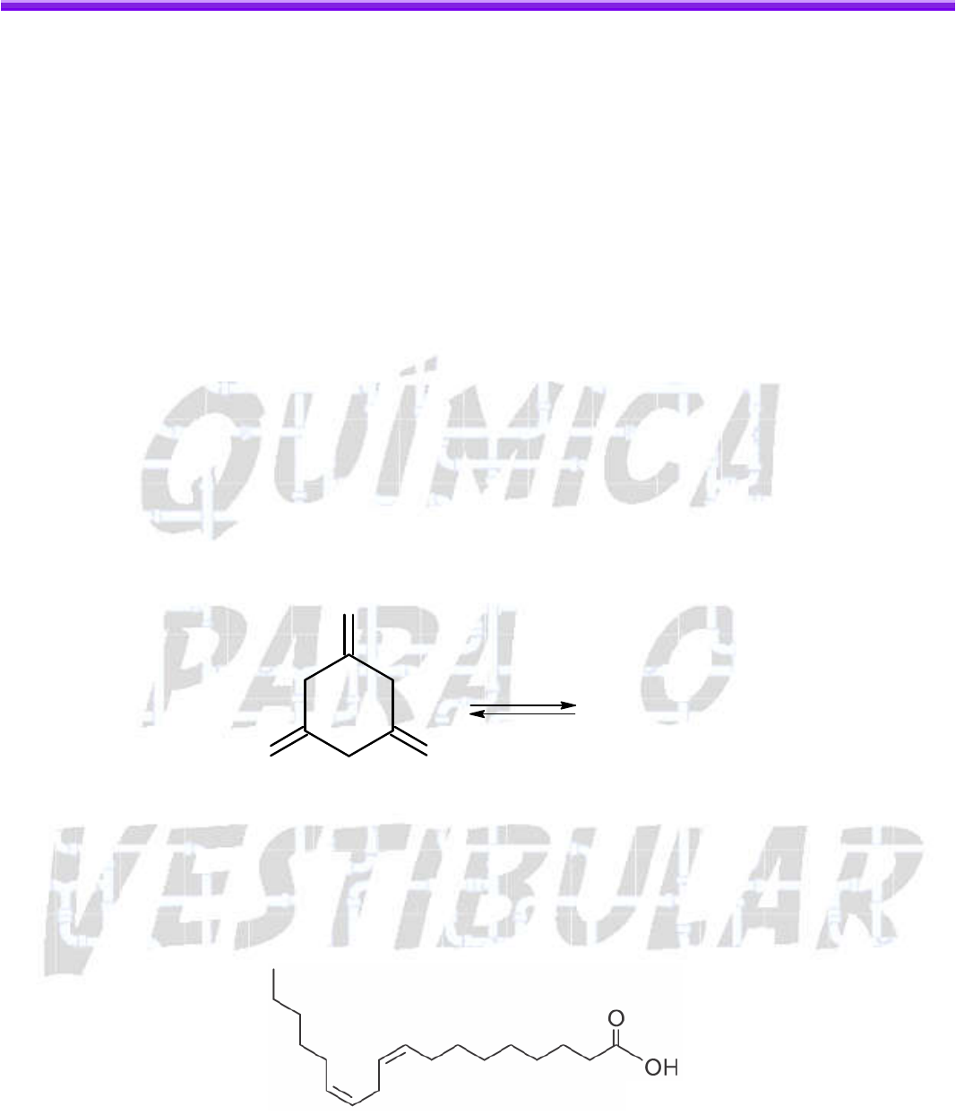 Professora Sonia www.quimicaparaovestibular.com.br contatoqpv@gmail.com 1 Exercícios sobre isomeria espacial geométrica 01. (UFRGS) Assinale a alternativa que preenche corretamente as lacunas do enunciado abaixo, na ordem em que aparecem. O cis-1,2-dicloroeteno é uma molécula __________, e o seu isômero trans apresenta __________ ponto de ebulição por ser uma molécula __________. a) apolar – maior – polar b) apolar – menor – polar c) polar – mesmo – polar d) polar – maior – apolar e) polar – menor – apolar 02. (UFPR) Isomeria é o fenômeno associado quando mais de uma substância apresenta a mesma fórmula molecular, mas difere estruturalmente quanto à disposição dos átomos na molécula. Entre as possibilidades de ocorrência desse fenômeno, as isomerias de função e geométrica são muito importantes na química orgânica. A tautomeria é um caso particular de isomeria de função, envolvendo um enol (R CH C(OH) R) que se encontra em equilíbrio com seu tautômero carbonilado 2(R CH C(O) R). A isomeria geométrica, por sua vez, depende da disposição espacial dos átomos, como é o caso da posição relativa dos átomos ligados aos carbonos de uma ligação dupla carbono-carbono, conhecido como isomeria cis-trans. a) A ciclohexan-1,3,5-triona, mostrada a seguir, possui um tautômero. Apresente a estrutura do composto presente em equilíbrio. O O O tautômero b) Os ácidos fumárico e maleico são isômeros geométricos que possuem fórmula molecular 2 2HO C HC CH CO H. O ácido fumárico é o isômero trans. Apresente as fórmulas estruturais espaciais (notação em bastão) dos ácidos fumárico e maleico. Indique claramente a geometria e identifique as moléculas do ácido fumárico e do maleico. 03. (UERJ) O ácido linoleico, essencial à dieta humana, apresenta a seguinte fórmula estrutural espacial: Como é possível observar, as ligações duplas presentes nos átomos de carbono 9 e 12 afetam o formato espacial da molécula. As conformações espaciais nessas ligações duplas são denominadas, respectivamente: a) cis e cis b) cis e trans c) trans e cis d) trans e trans Professora Sonia www.quimicaparaovestibular.com.br contatoqpv@gmail.com 2 04. (ENEM) A busca por substâncias capazes de minimizar a ação do inseto que ataca as plantações de tomate no Brasil levou à síntese e ao emprego de um feromônio sexual com a seguinte fórmula estrutural: Uma indústria agroquímica necessita sintetizar um derivado com maior eficácia. Para tanto, o potencial substituto deverá preservar as seguintes propriedades estruturais do feromônio sexual: função orgânica, cadeia normal e a isomeria geométrica original. A fórmula estrutural do substituto adequado ao feromônio sexual obtido industrialmente é: a) b) c) d) e) 05. (Mackenzie) Durante o processo de transpiração, o ser humano elimina secreções, ricas em proteínas e lipídeos, por intermédio das glândulas sudoríparas. Bactérias presentes nas axilas utilizam tais secreções como “alimento” e produzem compostos malcheirosos como o ácido 3 metil hex 2 enoico. Assim, é correto afirmar que o ácido 3 metil hex 2 enoico é uma substância química a) de cadeia carbônica insaturada e que apresenta um carbono quiral. b) que pode reagir com o etanol, em meio ácido, e formar um éter. c) que apresenta isomeria geométrica. d) que possui 2 átomos de carbono híbridos 2sp . e) que apresenta ligações covalentes polares e iônicas. 06. (UFRGS) O fulvinol, cuja estrutura é mostrada abaixo, foi isolado de uma esponja marinha presente na costa da Espanha. Professora Sonia www.quimicaparaovestibular.com.br contatoqpv@gmail.com 3 I. É um hidrocarboneto acíclico insaturado. II. Apresenta ligações duplas trans e cis. III. Apresenta 4 carbonos com geometria linear. Quais estão corretas? a) Apenas I. b) Apenas II. c) Apenas III. d) Apenas II e III. e) I, II e III. 07. (UFPR) A retina do olho humano contém dois tipos de células especializadas: os cones e os bastonetes. Nos bastonetes acontece uma transformação química fundamental para a química da visão. Trata-se da conversão do retinol (Vitamina A) em retinal que, na sequência, sofrerá outras transformações. Sobre o tema, considere as seguintes afirmativas: I. O grupo funcional álcool no retinol é convertido a aldeído no retinal. II. A ligação dupla entre os carbonos 11 e 12 sofre uma reação de isomerização. III. A molécula do retinal apresenta um grau de oxidação superior ao do retinol. IV. A molécula do retinol apresenta um centro quiral no carbono 15. Assinale a alternativa correta. a) Somente a afirmativa I é verdadeira. b) Somente a afirmativa III é verdadeira. c) Somente as afirmativas I, II e III são verdadeiras. d) Somente as afirmativas I e IV são verdadeiras. e) Somente as afirmativas II, III e IV são verdadeiras. 08. (UFPR) Armadilhas contendo um adsorvente com pequenas quantidades de feromônio sintético são utilizadas para controle de população de pragas. O inseto é atraído de grandes distâncias e fica preso no artefato por meio de um adesivo. O verme invasor do milho europeu utiliza o acetato de cis-11-tetradecenila (figura) como feromônio de atração sexual. Isômeros de posição e geométrico desse composto têm pouco ou nenhum efeito de atração. Responda: a) A que função orgânica pertence o composto orgânico? b) Forneça o nome oficial pela norma IUPAC do isômero geométrico do feromônio da figura. Professora Sonia www.quimicaparaovestibular.com.br contatoqpv@gmail.com 4 09. (FUVEST) A reação do tetracloroetano 2 2 4C H C com zinco metálico produz cloreto de zinco e duas substâncias orgânicas isoméricas, em cujas moléculas há dupla ligação e dois átomos de cloro. Nessas moléculas, cada átomo de carbono está ligado a um único átomo de cloro. a) Utilizando fórmulas estruturais, mostre a diferença na geometria molecular dos dois compostos orgânicos isoméric
