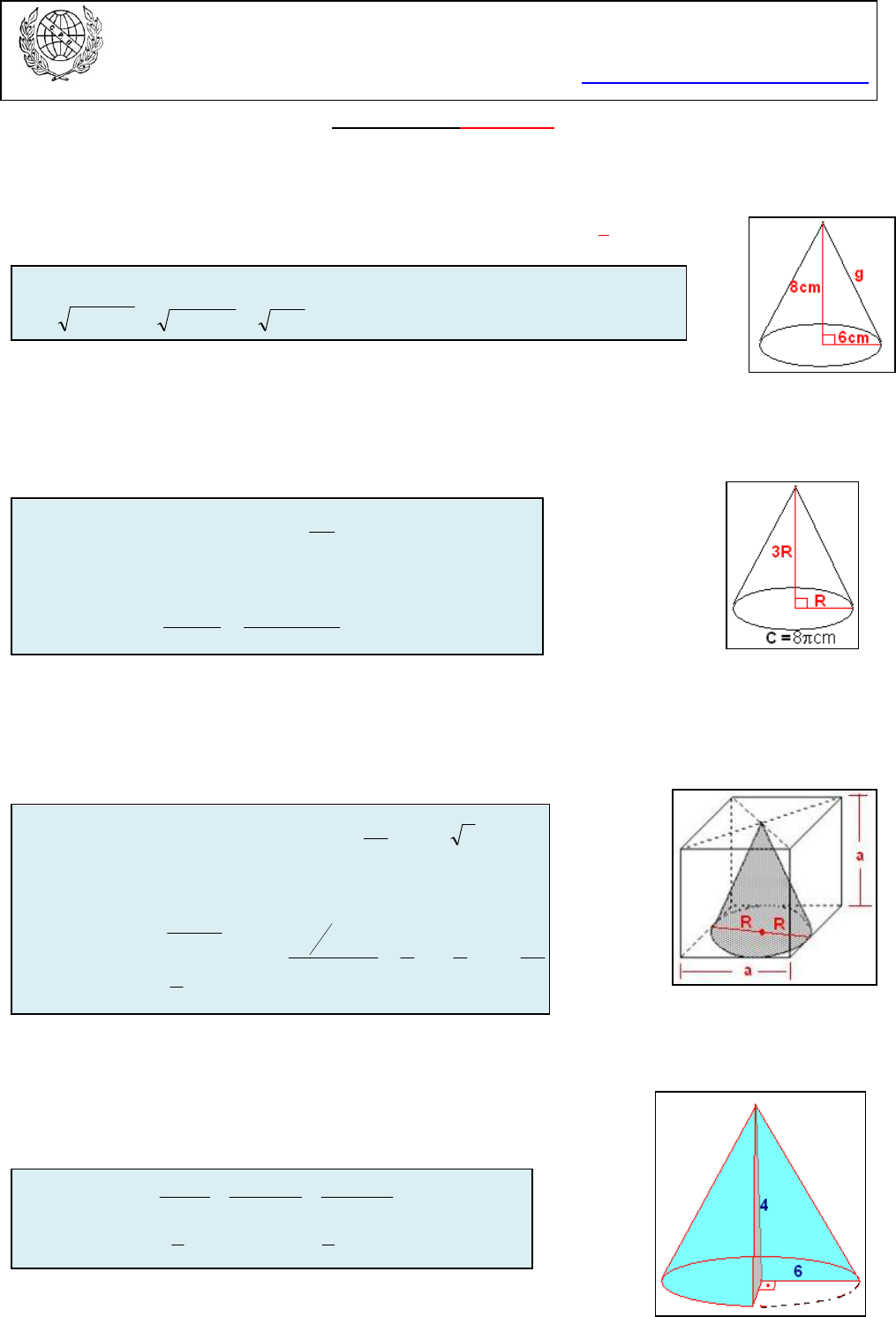 COLÉGIO PEDRO II - CAMPUS SÃO CRISTÓVÃO III 3ª SÉRIE – MATEMÁTICA II – PROF. WALTER TADEU www.professorwaltertadeu.mat.br Cones – 2013 - GABARITO 1. (UEL) Um cone circular reto tem altura de 8cm e raio da base medindo 6cm. Qual é, em centímetros quadrados, sua área lateral? a) b) c) d) e) Solução. A área lateral do cone é dada pela fórmula AL = (.R.g, onde g é a geratriz do cone. Calculando a geratriz pela Relação de Pitágoras, vem: . 2. (FATEC) A altura de um cone circular reto mede o triplo da medida do raio da base. Se o comprimento da circunferência dessa base é , então o volume do cone, em centímetros cúbicos, é: a) b) c) d) e) Solução. Calculando o raio da base e o volume, temos: . 3. (MACK) Na figura, a base do cone reto está inscrita na face do cubo. Supondo , se a área total do cubo é 54, então o volume do cone é: a) 81/2 b) 27/2 c) 9/4 d) 27/4 e) 81/4 Solução. A altura do cone possui a mesma medida da aresta do cubo. O mesmo ocorre com o diâmetro da base do cone. Utilizando a fórmula da área total do cubo, temos: . 4. Na rotação triângulo ABC da figura abaixo em torno da reta r, o lado AB descreve um ângulo de 270°. Desta forma, o sólido obtido tem volume: a) 48( b) 144( c) 108( d) 72( e) 36 ( Solução. Com a rotação de 270º (3/4 de 360º), o volume do sólido obtido vale formado possui 3/4 do volume do cone de revolução. . 5. Um cone circular reto está inscrito em um paralelepípedo reto retângulo, de base quadrada, como mostra a figura. A razão entre as dimensões do paralelepípedo é e o volume do cone é (. Então, o comprimento g da geratriz do cone é: a) b) c) d) e) Solução. A altura do cone vale b e o diâmetro da base do cone vale a. Estabelecendo as relações, temos: . 6. Um abajur em formato de cone equilátero está sobre uma escrivaninha, de modo que, quando aceso, projeta sobre esta um círculo de luz (veja figura abaixo). Se a altura do abajur, em relação à mesa, for H = 27 cm, a área do círculo iluminado, em cm2, será igual a: a) 243( b) 270( c) 250( d) 225( Solução. Se o cone é equilátero, então a geratriz possui a mesma medida do diâmetro da base do cone (g = 2R). Isto significa que a altura do cone será a altura do triângulo equilátero de lado 2R. . 7. Uma tulipa de chopp tem a forma cônica, como mostra a figura abaixo. Sabendo-se que sua capacidade é de 100( ml, a altura h é igual a: a) 20cm b) 16cm c) 12cm d) 8cm e) 4cm Solução. O raio da circunferência do topo da tulipa vale 5cm. Relacionando ao volume informado, temos: . 8. (UNIOESTE) Na figura ABCDE, tem-se: AB = 1 unidade, BC = 6 unidades, AE = 3 unidades e DE = 2 unidades. Sabendo-se, ainda, que o segmento AB é paralelo ao segmento DE e perpendicular aos segmentos BC e AE, determine: a) A área do polígono ABCDE. Solução. A área será a soma das áreas de um triângulo retângulo isósceles de catetos medindo 3 unidades e de um retângulo 1 x 3. . b) O volume do sólido gerado pela rotação de ABCDE em torno de BC. Solução. O volume do sólido será a soma do volume do cone com o volume do cilindro. . 9. Uma caixa d'água tem a forma de um cone circular reto como ilustrado na figura a seguir. Foram retirados da caixa 7329 litros de água ocasionando um abaixamento de um metro no nível da água. Quantos litros de água existiam inicialmente na caixa? Para os cálculos utilize . Solução. O volume retirado corresponde à diferença entre o volume inicial e o volume atual. O ângulo de 45º indica que o triângulo retângulo de catetos representados pelo raio e a altura é isósceles. Lembrando que 1 litro = 1dm3, temos: . 10. (UFPA) Num cone reto, a altura e 3m e o diâmetro da base mede 8m. Então, a área total, em metros quadrados, vale: a) 52 b) 36 c) 20 d) 16 e) 12 Solução. A área total do cone é dada pela fórmula AT = (R2 + (.R.g, onde g é a geratriz do cone e R o raio da base. Calculando a geratriz pela Relação de Pitágoras, vem: . 11. (UFES) Com um setor circular, cujo ângulo central mede 120°, constrói-se um cone circular reto de raio igual a 3cm. Determine o volume do cone assim obtido. Solução. O comprimento do arco C no setor possui a mesma medida do perímetro da base do cone. . 12. Com um semicírculo de papel, com raio igual a 20cm, um pipoqueiro faz saquinhos para vender pipocas, com a forma de cone circular reto. O volume desses saquinhos, usando 3, é mais próximo de: a) 1100cm3 b) 1300cm3 c) 1500cm3 d) 1700cm3 e) 1900cm3 Solução. O comprimento do arco C no setor possui a mesma medida do perímetro da base do cone. . 13. (UFPEL) Duas substancias, A e B, que não se misturam, são colocadas num recipiente de forma cônica, de modo que a substancia A ocupe até a metade da altura do cone e a substancia B, o restante (conforme a figura). A razão entre o volume de A e o volume de B e: a) b) c) d) e) 7 Solução. Estabelecendo a relação entre os volumes dos cones maior, altura h, e menor V(A), com altura h/2, temos: . 14. Fernando utiliza um recipiente em forma de um cone circular reto, para encher com água um aquário em forma de um paralelepípedo retângulo. As dimensões do cone são: 20cm de diâmetro de base e 20cm de altura, e as do aquário são: 120cm, 50cm e 40cm, conforme ilustração mostrada. Cada vez que Fernando enche o recipiente na torneira do jardim, ele derrama 10% de seu conteúdo no caminho e despeja o restante no aquário. Estando o aquário inicialmente vazio, qual é o número mínimo de vezes que Fernando deverá encher o recipiente na torneira para que a água despejada no aquário atinja 1/5 de sua capacidade? (use ) Solução. Calculando os volumes, temos: i) O volume do paralelepípedo é VP = (120).(40).(50) = 24000cm3. O objetivo é encher a quinta parte dessa capacidade: 24000 ÷ 5 = 4800cm3. ii) O volume do cone é . iii) O aquário recebe 90% do volume do cone: . iv) Número de vezes que Fernando precisa encher para atingir 4800cm3: . Logo, 26 ve
