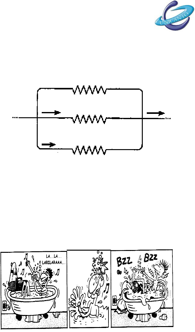Exercícios de Física – Lei de Ohm Questão 01 - A intensidade da corrente i, e a resistência R do circuito abaixo valem: a) 8 A e 500 Ω b) 4 A e 250 Ω c) 1 A e 150 Ω d) 5 A e 100 Ω Questão 02 - Observe a tira: Para estudarmos o fenômeno da energia elétrica, é necessário conhecermos bem três variáveis: tensão, corrente e resistência. Os elementos passivos de um circuito elétrico são denominados resistores ôhmicos por obedecerem à Lei de Ohm. O indivíduo da figura é percorrido por uma forte corrente elétrica porque seu corpo está molhado, diminuindo o valor da resistência elétrica do corpo. A lei de Ohm afirma que: a) Mantida constante a temperatura do resistor, sua resistência elétrica é constante, independente da tensão aplicada. b) A resistência elétrica do resistor é igual à razão entre a tensão que lhe é aplicada e a corrente que o atravessa. c) A potência dissipada pelo resistor é igual ao produto da tensão que lhe é aplicada pela corrente que o atravessa. d) A resistência elétrica do resistor diminui com o aumento de sua temperatura e aumenta com a diminuição de sua temperatura. Questão 03 - Os choques elétricos produzidos no corpo humano podem provocar efeitos que vão desde uma simples dor ou contração muscular até paralisia respiratória ou fibrilação ventricular. Tais efeitos dependem de fatores como a intensidade da corrente elétrica, duração, resistência da porção do corpo envolvida. Suponha, por exemplo, um choque produzido por uma corrente de apenas 4 mA e a resistência da porção do corpo envolvida seja de 3.000ΩΩΩΩ. Então podemos afirmar que o choque elétrico pode ter sido devido ao contato com: a) Uma pilha grande de 1,5 V. b) Os contatos de uma lanterna contendo uma pilha grande de 6,0 V. c) Os contatos de uma bateria de automóvel de 12V. d) Uma descarga elétrica produzida por um raio num dia de chuva. R 1 A 5 A 100 ΩΩΩΩ 250 ΩΩΩΩ i Droga! Entrou sabão no meu olho... Toalha, Toalha... Exercícios de Física – Lei de Ohm Questão 04 - Dois fios, um de cobre com resistividade 1,7 x 10-8 ΩΩΩΩ . m e outro de alumínio com resistividade 2,8 x 10-8ΩΩΩΩ.m, possuem mesmo comprimento e mesmo diâmetro. Se ambos forem percorridos pela mesma corrente i, pode-se afirmar que: a) As resistências ôhmicas dos dois fios são iguais. b) A ddp é menor no fio de cobre. c) O fio de cobre fica submetido a um campo elétrico maior do que o do fio de alumínio. d) A perda de energia pelo efeito Joule é menor no fio de alumínio. Questão 05 - Um resistor de 100 ΩΩΩΩ é percorrido por uma corrente elétrica de 20 A. A diferença de potencial (ddp ou tensão) nos terminais do resistor, em volts, é igual a: a) 2 b) 5 c) 200 d) 2000 Questão 06 - O choque elétrico é causado por uma corrente elétrica que passa através do corpo humano. A intensidade da corrente é, entretanto o fator mais relevante nas sensações e conseqüências do choque elétrico. Estudos cuidadosos deste fenômeno permitiram chegar aos seguintes valores aproximados: � Uma corrente de 1 mA a 10 mA provoca apenas sensação de formigamento; � Correntes de 10 mA a 20 mA causam sensações dolorosas; � Correntes superiores a 20 mA e inferiores a 100 mA causam, em geral, grandes dificuldades respiratórias; � Correntes superiores a 100 mA são extremamente perigosas, podendo causar a morte da pessoa , provocar contrações rápidas e irregulares do coração (este fenômeno é conhecido como fibrilação cardíaca); � Correntes superiores a 200 mA não causam fibrilação, porém dão origem a graves queimaduras e conduzem à parada cardíaca. Se a resistência do corpo humano, para determinada posição, for de 1000 Ω, e a tensão a qual ele está submetido for de 120 V, a corrente que o atravessará será de : a) 0,24 A b) 0,12 A c) 8,33 A d) 0,10 A Exercícios de Física – Lei de Ohm Questão 07 - Pela primeira vez, uma copa do mundo será realizada em dois países diferentes. O Japão e a Coréia do Sul tem mostrado muito empenho para a realização desta copa em conjunto . Apesar das diferenças culturais, esses dois países têm um excelente nível de tecnologia e desenvolvimento. Um dos trunfos da tecnologia nos gramados está nos grandes telões de alta definição. Alimentado por um circuito elétrico, esses telões estão presente em todos os estádios. Entretanto a FIFA proibiu as imagens de replay durante o jogo, para evitar constrangimentos para os árbitros. Se este telão é alimentado por uma tensão de 110V, possuindo uma resistência elétrica total de 50 Ω, a corrente elétrica que o atravessa será: a) 2,2 A b) 2 A c) 0,5 A d) 1,2 A Questão 08 - Se a corrente que atravessa o telão for de 5,0 A, então o número de elétrons que passa por segundo será de : 62,5 X 1018 elétrons 31,25 X 1018 elétrons 1,6 X 10-19 elétrons 5,0 X 1019 elétrons Questão 09 - Se dois cabos que ligam o telão for de 6 mm2, qual a resistência elétrica que ambos terão , se o comprimento de cada cabo é de 20 metros e a resistividade do material em que são feitos é ρ = 1,7 X 10-8 Ω.m. a) 0,056 Ω b) 0,113 Ω c) 0,226 Ω d) 0,028 Ω Questão 10 - Um chuveiro elétrico é submetido a uma d.d.p de 220 V, sendo percorrido por uma corrente elétrica de intensidade 10A. A resistência elétrica do chuveiro é: a) 210 Ω b) 40 Ω c) 22 Ω d) 60 Ω Questão 11 - Um fio de cobre tem comprimento de 120 m e a área da seção transversal é 0,50 mm2. Sabendo–se que a resistividade do cobre a 0 ºC é de 1,72 x10-2 ΩΩΩΩ .mm2/m. Então a sua resistência elétrica a 0 ºC será de : a) 5,2 Ω b) 4,1 Ω c) 8,2 Ω d) 6,2 Ω Questão 12 - Uma associação em série de dois resistores, R1 = 2 ΩΩΩΩ e R2 = 4 ΩΩΩΩ está submetida a uma d.d.p de 24 V. A intensidade da corrente elétrica em cada resistor vale, respectivamente: Exercícios de Física – Lei de Ohm a) 12 A e 6 A b) 10 A e 8 A c) 4 A e 4 A d) 8 A e 10 A Ques