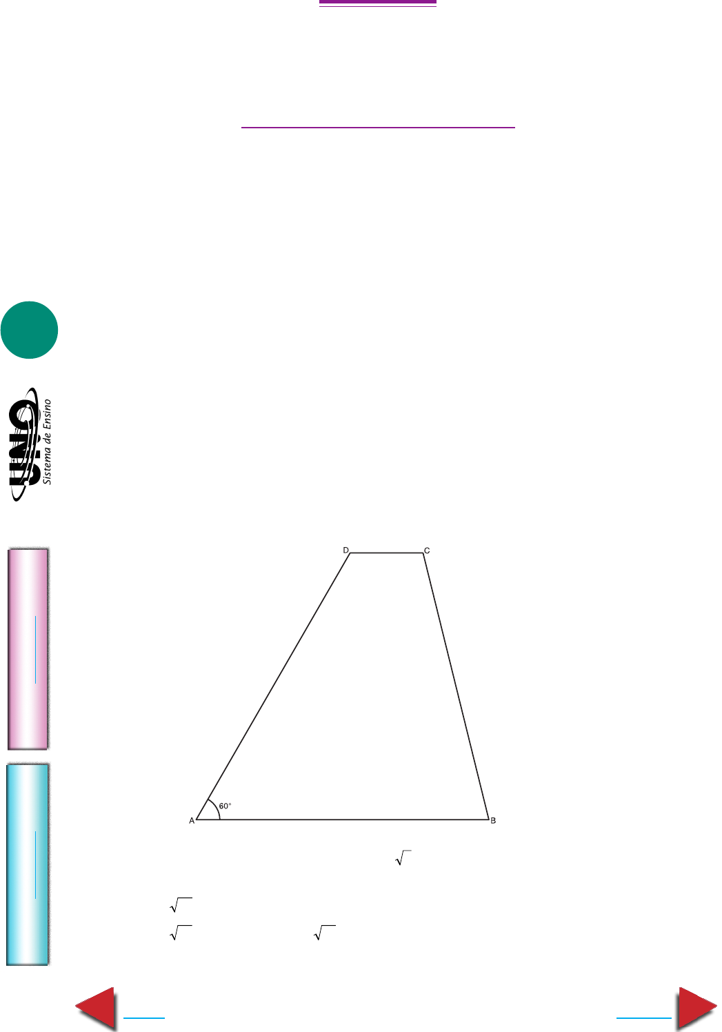 MATEMÁTICA - Quadriláteros e polígonos IM PR IM IR Voltar GA BA RI TO Avançar 1 QUADRILÁTEROS EQUADRILÁTEROS E POLÍGONOSPOLÍGONOS MATEMÁTICA 1. AEU-DF Julgue os itens seguintes relativos aos quadriláteros planos. ( ) Um retângulo é um paralelogramo. ( ) As diagonais de todo paralelogramo são congruentes. ( ) Todo paralelogramo é dividido em dois triângulos congruentes por uma de suas diagonais. ( ) Um paralelogramo que possui todos os lados congruentes é um losango. ( ) Por um ponto P de uma das diagonais de um paralelogramo são traçadas retas paralelas a seus lados. Tais retas dividem a região interna do paralelogramo em quatro paralelogramos menores dos quais dois têm áreas iguais. 2. UFGO O número de diagonais de um polígono regular de n lados é dado pela função d(n) = (n2 – 3n)/2, definida para todo número natural n ≥ 4. De acordo com essa afirmação, julgue os itens abaixo. ( ) Não existe polígono regular com 99 diagonais. ( ) O conjunto imagem da função d(n) é o conjunto de todos os números naturais. ( ) O conjunto dos números naturais n ≥ 4, tais que d(n + 1) > 2 d(n), possui infinitos elementos. ( ) O conjunto de valores d(n), para n = 4, 5, 6, ..., nesta ordem, forma uma progressão aritmética. 3. UFMG Observe a figura: Nessa figura, o trapézio ABCD tem altura 2 3 e bases AB = 4 e DC = 1. A medida do lado BC é: a) 14 c) 4 b) 13 d) 15 MATEMÁTICA - Quadriláteros e polígonos IM PR IM IR Voltar GA BA RI TO Avançar 2 4. PUC-RJ ABCD é um paralelogramo, M é o ponto médio do lado CD, e T é o ponto de intersecção de AM com BD. O valor da razão DT BD é: a) 1 2 b) 1 3 c) 2 5 d) 1 4 e) 2 7 5. UERJ Observe o desenho ao lado: Ele representa uma folha retangular com 8 cm x 13 cm, que foi recortada formando duas figuras I e II, que, apesar de distintas, possuem a mesma área. A diferença entre o perímetro da figura I e da figura II, em cm, corresponde a: a) 0 b) 2 c) 4 d) 6 6. UFRS Considere a figura abaixo: Se os retângulos ABCD e BCEF são semelhantes, e AD = 1, AF = 2 e FB = x, então x vale: a) − +1 2 b) 1 c) 2 d) 1 + 2 e) 2 7. PUC-PR Unindo-se três a três os vértices de um polígono regular obteve-se 120 triân- gulos. Qual era o polígono? a) icoságono b) decágono c) octógono d) hexágono e) pentágono 8. Mackenzie-SP Os lados do retângulo da figura, de área 48, foram divididos em partes iguais pelos pontos assinalados. A área do quadrilátero desta- cado é: a) 32 b) 24 c) 20 d) 16 e) 22 9. Fuvest-SP Na figura abaixo, os quadrados ABCD e EFGH têm, ambos, lado a e centro O. Se EP = 1, então a é: a) 2 d) 2 b) 2 e) 2 c) 2 figura I figura II A B CD O F H 1 P E G 2 – 1 3 – 1 2 2 – 1 E C BF 2 D A 1 x MATEMÁTICA - Quadriláteros e polígonos IM PR IM IR Voltar GA BA RI TO Avançar 3 10. UEGO Analise e julgue os itens abaixo: ( ) Um triângulo que tem seus lados medindo 3 cm, 5 cm e 7 cm é obtusângulo. ( ) Duas barreiras eletrônicas encontram-se em lados opostos de uma avenida. O ângulo entre as linhas de visão de um observador que as vê é de 120°. As distâncias entre o observador e as barreiras são: 7 m e 4 m. Então a distância entre as barreiras é menor que 9 m. ( ) Um triângulo ABC está inscrito em um círculo de raio 2 cm. O triângulo ABC tem um lado igual a 3 cm. Podemos afirmar que o ângulo oposto a este lado mede 45° ou 135°. ( ) O quadrilátero ABCD abaixo é um retângulo de lados x e y. Então a relação entre x e y é y = x 3 3 . ( ) Na figura abaixo r // s, v // u e t ⊥ u. Seja AC = 1 m, então, BC = 2 3 3 m 11. I.E. Superior de Brasília-DF Considere uma folha de papel de forma retangular com um dos lados maior do que outro. Dobrando a folha de modo que um dos lados menores recaia sobre um dos lados maiores encontramos a forma de um trapézio retângulo com ângulo agudo de 45°. Dobra-se, então, novamente a folha, dessa vez sobre a mediatriz da base maior do trapézio citado. Considerando que a razão entre as medidas dos lados maior e menor da folha original seja menor do que 2, julgue os itens seguintes. ( ) A figura resultante é um quadrilátero não regular. ( ) Considerados os vincos visíveis na folha dobrada nenhum dos ângulos nela deter- minados mede 45º. ( ) Os vincos e bordas visíveis na figura final permitem visualizar um trapézio retân- gulo que é semelhante àquele citado na questão. ( ) Se usarmos os vincos e bordas do papel como réguas para traçar segmentos de retas sobre a figura dobrada apenas um dos segmentos traçados será rompido ao desdo- brarmos a folha. ( ) As linhas de que trata o item anterior delimitam com as bordas da folha dobrada dois triângulos semelhantes. 12. UERJ Se um polígono tem todos os lados iguais, então todos os seus ângulos internos são iguais. Para mostrar que esta proposição é falsa, pode-se usar como exemplo a figura denominada: a) losango b) trapézio c) retângulo d) quadrado MATEMÁTICA - Quadriláteros e polígonos IM PR IM IR Voltar GA BA RI TO Avançar 4 13. UFF-RJ A figura abaixo representa o quadrado MNPQ de lado l = 4 cm. Sabendo que os retângulos NXYZ e JKLQ são congruentes, o valor da medida do seg- mento YK é: a) 3 2 cm b) 2 3 cm c) 2 2 cm d) 2 cm e) 2 2 cm 14. U.E. Maringá-PR Neste problema, considere que qualquer trajetória do ciclista é feita em linha reta e com velocidade constante e igual a 10 m/s. Duas rodovias H e R cruzam-se em um ponto A, segundo um ângulo de 60°. Um ciclista parte do ponto A pela rodovia H e, após um terço de hora, atinge um ponto B, de onde é possível seguir para a rodovia R, percorrendo o menor caminho, atingindo-a no ponto C. Para retornar de C ao ponto A de origem, pela rodovia R, a distância que o ciclista deve percorrer, em quilômetros, é... 15. PUC-PR Unindo-se três a três um certo número de pontos de um plano, obtiveram-se 110 triângulos. Sabendo-se que, desses pontos, 5 estavam alinhados, quantos eram os pontos? a) 10 b) 11 c) 12 d) 13 e) 14 16. Unicamp
