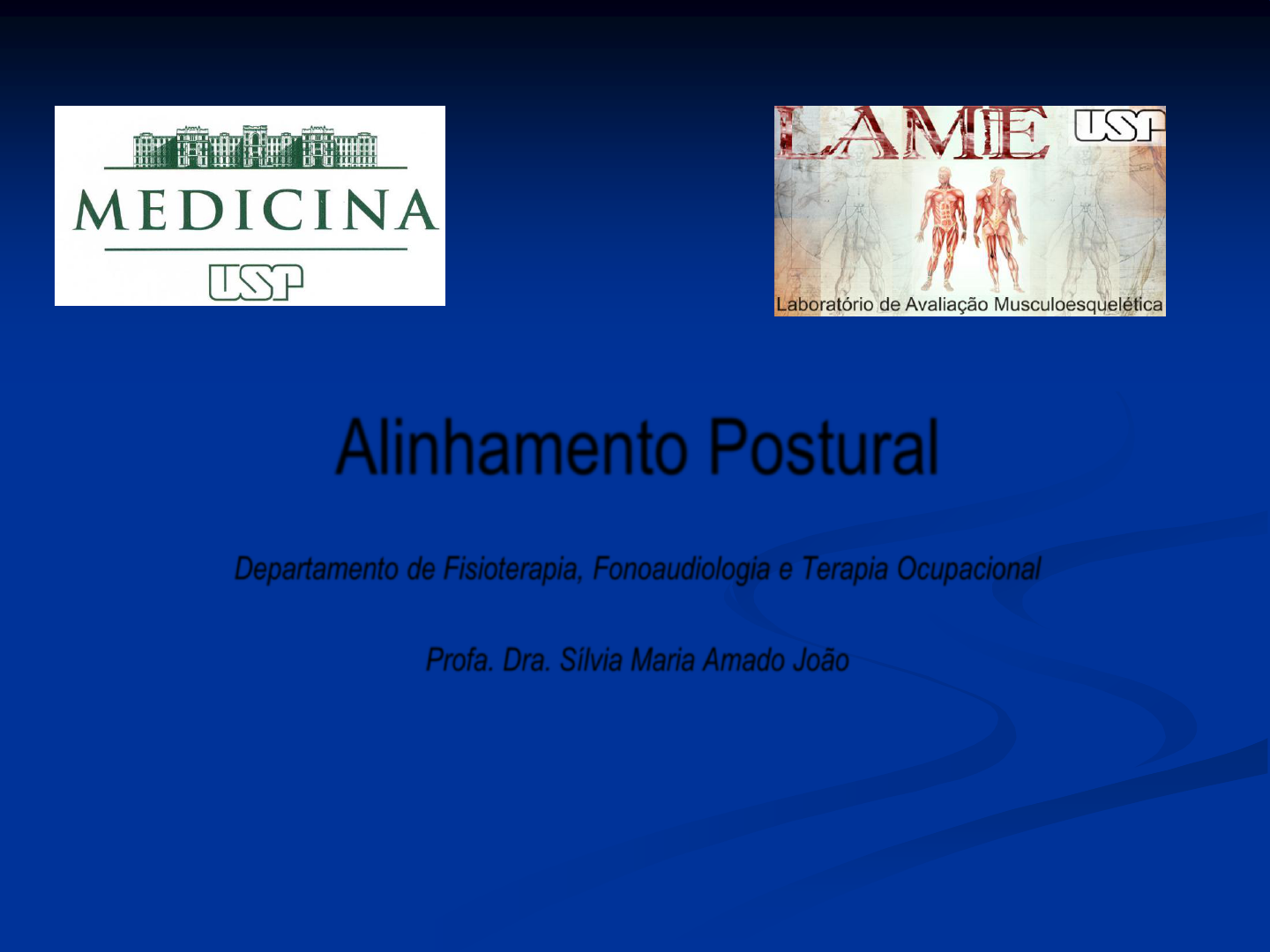 smaj@usp.br * smaj@usp.br Alinhamento Postural Departamento de Fisioterapia, Fonoaudiologia e Terapia Ocupacional Profa. Dra. Sílvia Maria Amado João smaj@usp.br * smaj@usp.br smaj@usp.br 1. Desenvolvimento Postural Vantagens e desvantagens da postura ereta; Curvas primárias da coluna vertebral; Curvas secundárias da coluna vertebral; Alterações posturais com a idade. smaj@usp.br * smaj@usp.br smaj@usp.br smaj@usp.br * smaj@usp.br smaj@usp.br smaj@usp.br * smaj@usp.br smaj@usp.br 2. Definição de Postura “Postura é uma composto das posições das diferentes articulações do corpo num dado momento”. “Postura correta é a posição na qual um mínimo de estresse é aplicado em cada articulação” (Magee, 2002). “A postura correta consiste no alinhamento do corpo com eficiências fisiológica e biomecânicas máximas, o que minimiza os estresses e as sobrecargas sofridas ao sistema de apoio pelos efeitos da gravidade” (Palmer & Apler, 2000). smaj@usp.br * smaj@usp.br smaj@usp.br 3. Postura Padrão A “Postura Padrão” refere-se a uma postura “ideal” ao invés de uma postura média; O alinhamento esquelético ideal utilizado como padrão é consiste com princípios científicos válidos, envolve uma quantidade mínima de esforço e sobrecarga, e conduz à eficiência máxima do corpo. smaj@usp.br * smaj@usp.br smaj@usp.br Avaliação Fisioterapêutica e Postura Amado-João, SM.Métodos de Avaliação Clínica e Funcional em Fisioterapia, 2006 smaj@usp.br * smaj@usp.br smaj@usp.br 4. Análise da Postura Envolve a identificação e a localização dos segmentos corpóreos relativos a linha de gravidade; A avaliação postural deve determinar se um segmento corporal ou articulação desvia-se de um alinhamento postural ideal. smaj@usp.br * smaj@usp.br smaj@usp.br smaj@usp.br * smaj@usp.br smaj@usp.br Postura Padrão Alinhamento esquelético ideal envolve uma quantidade mínima de esforço e sobrecarga, e conduz à eficiência máxima do corpo. Linha de gravidade: intersecção dos planos médios sagital e frontal do corpo. Fio de prumo: linha vertical-padrão para medir desvios. Ponto fixo da postura em pé: base onde os pés estão em contato com o solo. (Kendall et al., 1995) smaj@usp.br * smaj@usp.br smaj@usp.br Avaliação Postural Qualitativa Método Clássico: análise visual (observação) (Kendall et al., 1995; Watson e MacDonncha, 2000); Postura Natural (Fedorak et al., 2003) smaj@usp.br * smaj@usp.br smaj@usp.br 4.1 Vista Lateral: Alinhamento ideal Na vista lateral, a linha de referência vertical, divide o corpo em secções anterior e posterior de igual peso; Na vista lateral, o ponto de referência fixo é levemente anterior ao maléolo externo e representa o ponto básico do plano médio-coronal do corpo em alinhamento ideal. (Kendall et al., 1995) smaj@usp.br * smaj@usp.br smaj@usp.br 4.2 Vista Posterior: Alinhamento ideal Na vista posterior, a linha de referência vertical, divide o corpo em secções direita e esquerda; Na vista posterior, o ponto fica a meio caminho entre os calcanhares e representa o ponto básico do plano médio sagital do corpo em alinhamento ideal. smaj@usp.br * smaj@usp.br smaj@usp.br 4.3 Vista Anterior: Alinhamento ideal Na vista anterior, a linha de referência vertical, divide o corpo em secções direita e esquerda; Na vista anterior, o ponto fica a meio caminho entre os calcanhares e representa o ponto básico do plano médio sagital do corpo em alinhamento ideal. smaj@usp.br * smaj@usp.br smaj@usp.br 4.4 Alinhamento Postural Articulação do tornozelo: está na posição neutra, entre a dorsiflexão e a flexão plantar. A linha de gravidade cai levemente anterior ao maléolo lateral e anterior ao eixo da articulação do tornozelo. Pés: os calcanhares estão separados cerca de 7,5 cm e a parte posterior de cada pé está abduzida cerca de 8 a 10 graus da linha mediana. Articulação do joelho: está em extensão e a linha da gravidade passa anterior à linha média do joelho e posterior à patela. smaj@usp.br * smaj@usp.br smaj@usp.br 4.4 Alinhamento Postural Posição neutra da pelve: as EIAS ficam no mesmo plano horizontal, existe uma curvatura anterior normal na coluna lombar. Articulação do quadril: o quadril está em posição neutra a linha gravitacional passa através do trocânter maior e posterior ao eixo da articulação do quadril. smaj@usp.br * smaj@usp.br smaj@usp.br 4.4 Alinhamento Postural Coluna vertebral: quando as curvas vertebrais estão em ótimo alinhamento, a linha de gravidade passa através da linha média do tronco. A linha de gravidade passa posterior ao eixo de rotação das vértebras cervicais e lombares, anterior às vértebras torácicas e através do corpo da quinta vértebra lombar. smaj@usp.br * smaj@usp.br smaj@usp.br 4.4 Alinhamento Postural Articulação do ombro e cintura escapular: a linha de referência ideal lateral passa a meio da articulação as escápulas ficam planas contra a coluna torácica. Cabeça: a linha de gravidade da cabeça passa através do meato auditivo externo, posterior à sutura coronal e através do processo odontóide. smaj@usp.br * smaj@usp.br smaj@usp.br 5. Avaliação Postural Abordagem organizada e sistemática; O paciente deve sentir-se à vontade e evitar rigidez e posições não-naturais; Deve ser visualizado o equilíbrio global do corpo; O fio de prumo situa-se no ponto ântero-posterior anterior ao maléolo lateral e, para os desvios laterais, entre os calcanhares. É importante verificar as alterações de tempos em tempos para certificar-se dos dados, se a posição não mudou, porque o paciente pode "corrigir" sua alteração momentaneamente. smaj@usp.br * smaj@usp.br smaj@usp.br smaj@usp.br * smaj@usp.br smaj@usp.br 5. Avaliação Postural 5.1 Vista Lateral 1) Articulações dos tornozelos: Ângulo tíbio-társico ( ) Preservado; ( ) Aumentado D / E; ( ) Diminuído D / E. 2) Articulações dos joelhos: ( ) Alinhados; ( ) Fletidos D / E; ( ) 