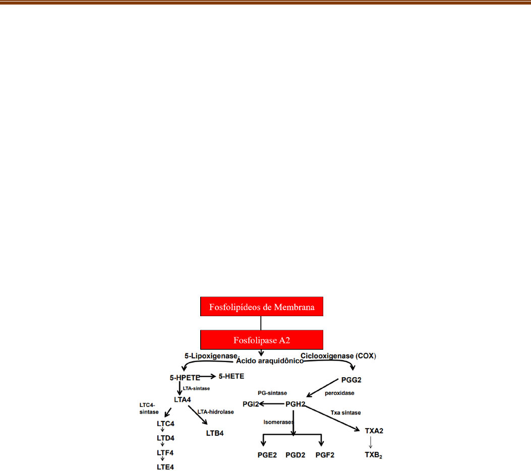 Roteiro de Estudo Farmacologia AINES: Substâncias exógenas que são produzidas em laboratórios ou extraídas de plantas e aplicados em humanos contra a inflamação A inflamação se caracteriza como uma resposta do organismo em favor da proteção contra uma agressão que esteja localizada em tecidos vascularizados, principalmente os tecidos conjuntivos. A artrite reumatoide é uma doença de difícil tratamento porque ataca as articulações, e as articulações não são muito vascularizadas, então os agentes anti-inflamatórios não conseguem alcançar lá dentro. Outro motivo é por ser uma doença autoimune. Sinais cardinais da inflamação: rubor, calor, dor, tumor e perda da função Com a inflamação, existe a liberação de uma série de mediadores inflamatórios, que faz com que haja uma maior permeabilidade vascular e isso também causa uma vasodilatação (tumor, edema), que vai comprimir as terminações nervosas, causando dor. Além disso, há maior influxo de sangue no local, com hiperemia ativa, gerando calor e rubor. Tudo isso junto, leva a perda de função. Proteína G ativa fosfolipase A2, que por meio dos fosfolipídeos de membrana geram ácido araquidônico. O ácido araquidônico pode sofrer ação de duas enzimas no organismo: as lipoxigenases ou as cicloxigenases (COX). Quando ele é alvo das lipoxigenases, ele produz leucotrienos. E quando elas são alvo das cicloxigenases, produz prostaglandinas ou tromboxanos. Os AINES agem pela via da cicloxigenase, impedindo a cascata da inflamação. Existem dois tipos de cicloxigenase no nosso corpo, a COX do tipo 1 e a COX do tipo 2. A COX 1 é constitutiva, ou seja, ela faz parte de estruturas fisiológicas do nosso organismo, como participando da agregação plaquetária (tromboxanos TXA2), associada ao endotélio do estômago na produção do muco que protege o estômago do suco gástrico, e participa da fisiologia renal durante os processos de filtração do sangue. A COX 2 é induzida, porque ela só é produzida durante o processo inflamatório. Pode ser produzida por macrófagos, mastócitos ou células endoteliais. Uma vez produzidas, vão gerar inflamação. Citocinas são peptídeos de baixo peso molecular, glicoproteínas, ou seja, estão sempre associadas a uma molécula de glicídio, e participam da resposta imune, sendo produzidas e ativadas por diversos tipos celulares, especialmente, macrófagos, linfócitos e neutrófilos, mas também podem ser produzidas por células epiteliais, endoteliais e por fibroblastos, como é o caso da interleucina 1A. Podem ter atuação local ou sistêmica, e atuam sobre os receptores de membrana específicos (receptores do tipo 3). Apresentam uma grande rede de interação no organismo. Diversos tipos de citocinas: Interleucinas, fator de necrose tumoral, interferons (resposta primária a vírus), quimiocinas (fatores de crescimento de colônias celulares) Fármacos anti-inflamatórios Dentre os fármacos anti-inflamatórios, temos os glicocorticóides, os DAINES, imunossupressores, drogas para tratamento de gota e drogas para tratamento de artrite reumatoide. Roteiro de Estudo Farmacologia AINES: fármacos que inibem a produção de prostanoides pelo bloqueio das cicloxigenases (COX’s). A capacidade de inibir a COX do tipo 1 ou do tipo 2 é que vai diferir as classes de AINES. Mecanismo de ação: AINES se liga a cicloxigenase e a bloqueia, impedindo que haja a cascata de inflamação e produção de mediadores inflamatórios (tromboxanos e prostaglandinas). Os AINES diferem em relação as diferenças estruturais das COX’s. Existem três diferenças características: 1. Ausência de bolsa lateral hidrofílica na COX1. A COX2 tem bolsa lateral hidrofílica. Fármacos que são projetados pra se ligar a esses canais vão ser mais específicos para COX2. Ou seja, se eu projeto um AINE para se ligar somente à COX2, não vou ter efeito colateral ou efeitos colaterais mínimos, pois o fármaco vai agir somente sobre a inflamação e não sobre o organismo. Lembrar que a COX1 é constitutiva, fisiológica. 2. Isoleucina na posição 523 na COX1. Na COX2 é valina e não isoleucina. Então se tiver um fármaco que se ligue a valina, ele vai direto para COX2. 3. Tamanho do canal hidrofóbico na COX2 é maior do que o da COX1, isso também me faz projetar AINES que sejam de estrutura molecular maior, assim não caberia no canal da COX1. COX1= efeitos colaterais! Essas diferenças, portanto, impactam diretamente no mecanismo de ação dos AINES. Em geral, os efeitos dos AINES são: 1) efeito anti-inflamatório pois ao inibir produção das prostaglandinas (PGE2 e PGI2), não há vasodilatação, e sem vasodilatação não há chegada de células no local inflamado; 2) efeito anti- pirético, pois o AINE inibe a produção das COX, inibindo produção das prostaglandinas (PGEs) que agem no eixo hipotálamo-adrenal e impede o ajuste da temperatura corporal, assim a temperatura não fica elevada; 3) efeito analgésico, AINE inibe a produção da COX, que inibe a produção das prostaglandinas (PGEs e PGIs) e assim, não agem sobre nociceptores nos locais inflamados, impedindo ou diminuindo a dor. Efeitos colaterais Estômago: AINE que inibe a COX1 vai diminuir a produção de muco que protege o estômago do suco gástrico. Assim, pode apresentar dispepsia, náusea, vômito, doença ulcerosa, distúrbios gastrointestinais, hemorragias, etc. Rim: deficiência no processo de filtração do sangue. Pode ocorrer insuficiência renal aguda, distúrbios no sistema renina angiotensina, nefropatia analgésica, nefrite crônica e necrose papilar renal. Plaquetas: deficiência na agregação plaquetária com risco de hemorragia grave (AAS). Pacientes que tem hemofilia não podem usar AINES. Roteiro de Estudo Farmacologia Classificação de acordo com a seletividade para as COX’s: AAS por ser pequena, entra primeiro na COX1. Em maiores quantidades se agrupam e vão também para COX2, mas