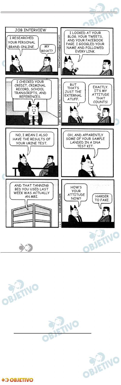 IINNGGLLÊÊSS As questões de 1 a 4 referem-se à tirinha a seguir: 1 CC No contexto em que se insere, “external stuff”, no quarto quadro da tirinha, foi interpretado, pelo entrevistado, como a) funcionários terceirizados. b) exames de rotina para contratação. c) informações de menor importância. d) dados de veracidade questionável. e) dados investigados externamente. Resolução “External stuff” foi interpretado, pelo entrevistado, como informações de menor importância. Segundo ele o que importa é sua atitude. II TTAA ((22ºº DDII AA )) —— DDEEZZEEMMBBRROO//22001122 2 AA Segundo a tirinha, em uma entrevista de trabalho a) está cada vez mais difícil falsear informações pessoais. b) a empresa contratante exige uma série de exames clínicos que atestem a saúde do candidato. c) a atitude do candidato é comprovada através de detalhada investigação laboratorial. d) o desempenho do entrevistado é de suma importância para a construção de sua imagem. e) as informações sobre o entrevistado, disponíveis online, não são mais importantes do que sua atitude e apresentação pessoal. Resolução Segundo a tirinha, está cada vez mais difícil falsear informações pessoais em uma entrevista de trabalho. * to fake = falsear, fingir, tapear, camuflar 3 AA “Tanning bed”, no penúltimo quadro da tirinha a) foi mencionado para ocultar um MRI. b) refere-se a uma atitude do entrevistado. c) refere-se a um tipo de cama utilizada para relaxamento. d) é um sinônimo de MRI. e) é um tipo de exame. Resolução “Tanning bed”, no penúltimo quadro da tirinha foi mencionado para ocultar um MRI (Ressonância Magnética). A “tanning bed” (cama de bronzeamento) era, na verdade, um aparelho de ressonância magné - tica, possibilitando ao entrevistador obter mais uma dentre as várias informações acerca do entrevistado. No texto: “And that tanning bed you used last week was actually an MRI.” Tradução: “E aquela cama de bronzemento que você usou na semana passada era, na verdade, uma ressonânca magnética.” 4 BB A palavra “landed”, na sentença “apparently some of your sample landed […]”, no sexto quadro da tirinha, pode ser substituída por a) stopped. b) ended up. c) was included. d) arrived. e) was caught. Resolução landed = ended up Tradução do trecho: “… aparentemente parte de sua amostra terminou (acabou)…” II TTAA ((22ºº DDII AA )) —— DDEEZZEEMMBBRROO//22001122 As questões de 5 a 12 referem-se ao texto a seguir: 5 Ways To Turn Fear Into Fuel Editor’s note: This is a guest post from Jonathan Fields, author of Uncertainty: Turning Fear and Doubt Into Fuel for Brilliance. 1 Uncertainty. It’s a terrifying word. Living with it, dangling over your head like the sword of Damocles, day in day out, is enough to send anyone spiraling into a state of anxiety, fear and paralysis. 5 Like it or not, though, uncertainty is the new normal. We live in a time where the world is in a state of constant, long-term flux. And, that’s not all. If you want to spend your time on the planet not just getting-by, but consistently creating art, experiences, 10 businesses and lives that truly matter, you’ll need to proactively seek out, invite and even deliberately amplify uncertainty. Because the other side of uncertainty is opportunity. Nothing great was ever created by waiting around 15 for someone to tell you it’s all going to be okay or for perfect information to drop from the sky. Doesn’t happen that way. Great work requires you to act in the face of uncertainty, to live in the question long enough for your true potential to emerge. There is no 20 alternative. When you find the strength to act in the face of uncertainty, you till the soil of genius. Problem is, that kills most people. It leads to unease, anxiety, fear and doubt on a level that snuffs 25 out most genuinely meaningful and potentially revolutionary endeavors before they even see the light of day. Not because they wouldn’t have succeeded, but because you never equipped yourself to handle and even harness the emotional energy of the journey. 30 But, what if it didn’t have to be that way? What if there was a way to turn the fear, anxiety and self-doubt that rides along with acting in the face of uncertainty–the head-to-toe butterflies–into fuel for brilliance? 35 Turns out, there is. Your ability to lean into the unknown isn’t so much about luck or genetics, rather it’s something entirely trainable. I’ve spent the past few years interviewing world-class creators across a wide range of fields and pouring over research that 40 spans neuroscience, decision-theory, psychology, creativity and business. Through this work, a collection of patterns, practices and strategies have emerged that not only turbocharge insight, creativity, innovation and 45 problem-solving, but also help ameliorate so much of the suffering so often associated with the pursuit of any creative quest. Fonte: http://zenhabits.net/fearfuel. Acesso em 07/12/2011. Texto adaptado. II TTAA ((22ºº DDII AA )) —— DDEEZZEEMMBBRROO//22001122 5 CC De acordo com a ideia central do texto, a incerteza a) é comum nos dias de hoje e leva a um estado de ansiedade e medo paralisante. b) é normal nos dias de hoje e impede o desenvolvimento das potencialidades. c) é normal nos dias de hoje mas também pode proporcionar oportunidades. d) embora natural nos dias de hoje, pode até levar à morte. e) embora seja objeto de estudo de diversas áreas de conhecimento, nenhuma desenvolveu mecanismos para sua total superação. Resolução De acordo com a ideia central do texto, a incerteza é normal nos dias de hoje, mas também pode propor - cionar oportunidades. No texto: (Linha 31) “ What if there was a way to turn the fear, anxiety and self-doubt that rides along with acting in the face of uncertainty–the head-to-toe butterflies– into fuel for brilliance? Turns out, there is.” (Linha 35) 6 DD Na