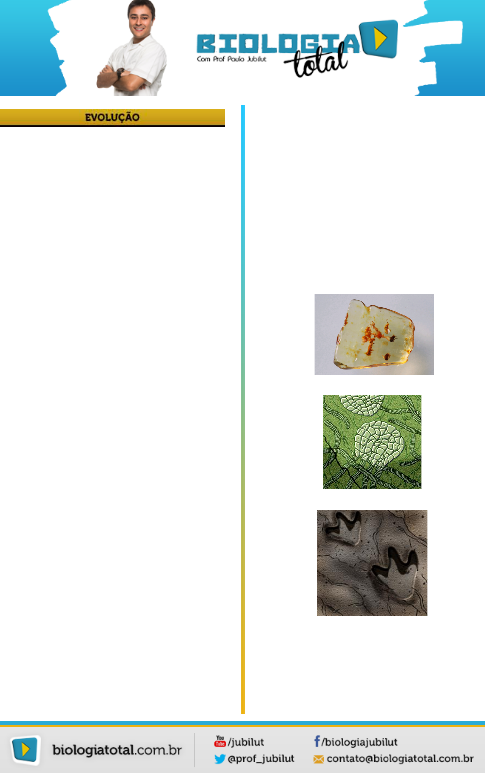 Adaptação: É o conjunto de características estruturais, fisiológicas e comportamentais que podem determinar a sobrevivência e a reprodução de uma espécie em seu ambiente. Explica o fato de o Brasil apresentar vários tipos de ambientes que abrigam uma imensa biodiversidade. O jacaré-de-papo-amarelo, por exemplo, apresenta olhos e narinas localizados acima da superfície da água, quando o animal se desloca em rio. Com isso, ele pode se aproximar de uma presa sem ser notado e, além disso, pode respirar sem maiores restrições. Fixismo ou Criacionismo: Essa corrente sempre foi vinculada à visão religiosa de mundo, apoiada no Gênesis bíblico: os seres vivos teriam sido criados por Deus (daí “criacionismo”), que os fez já adaptados ao ambiente; desde o início da vida, os seres vivos permaneceriam sem maiores alterações (o que justifica o termo “fixismo”, de fixo, imutável). Evolução: Com o tempo, os cientistas – geólogos, principalmente – começaram a notar que o planeta passou e passa por muitas mudanças. Algumas alterações são lentas e outras, bastante bruscas. Hoje, confirma-se uma hipótese já antiga de afastamento de massas continentais; Brasil e África, por exemplo, afastam-se alguns centímetros por ano. Alguns naturalistas do século XIX começaram a elaborar hipóteses acerca da ocorrência de alterações também nos seres vivos ao longo do tempo. Trata-se da corrente de pensamento conhecida como evolucionismo ou transformismo, o mecanismo através do qual os seres vivos se modificam ao longo do tempo. Evidências de Evolução: Muitos biólogos procuraram embasar seus argumentos acerca da ocorrência de evolução por meio de dados concretos. Assim, foram sendo reunidas várias evidências evolutivas, entre as quais se destacam: fósseis, semelhanças entre seres vivos e, também, a existência de órgãos vestigiais. A. Fósseis: A morte de um organismo não significa que ele vai necessariamente desintegrar-se de maneira completa. Plantas e animais podem ser encobertos por lava vulcânica e uma parte significativa de seus corpos acaba sendo preservada. Cientistas podem obter informações valiosas sobre o passado do nosso planeta quando encontram esses verdadeiros tesouros científicos, os restos ou vestígios de seres vivos de épocas remotas. Entende-se por resto, como sendo qualquer estrutura que sobrou do organismo após sua morte, como escamas, cascos, ossos e conchas. Há casos mais raros de preservação de organismos inteiros, como o de mamutes no gelo e de insetos em âmbar. Outros fósseis são constituídos apenas por marcas preservadas, como a de pegadas em placas de lama endurecida. Somente são considerados como fósseis os restos ou vestígios de organismos que tenham vivido antes do surgimento da escrita. Insetos em âmbar Crinóides – equinodermos Pegadas de dinossauro Fóssil de um Crustáceo B. Semelhanças e Parentesco - Quando consideramos um gato e um ser humano, notamos uma série de diferenças externas. No entanto, um estudo anatômico revelará grandes semelhanças internas, por exemplo, em relação aos ossos dos membros superiores. Comparação entre braço humano e pata de gato Essa notável semelhança interna é interpretada como resultado de um processo evolutivo: seres humanos e gatos são mamíferos que tiveram um ancestral comum; ao longo do tempo esse ancestral originou espécies que se modificaram profundamente, mas que mantiveram uma semelhança anatômica. Quando se procede a uma análise de desenvolvimento embrionário de animais bastante diferentes, como tartaruga, galinha e homem, notam-se semelhanças surpreendentes. Para os evolucionistas, representam, também, uma evidência de parentesco, ou seja, de um ancestral comum. Semelhanças no desenvolvimento embrionário de alguns vertebrados. Atualmente, os cientistas analisam as semelhanças entre as espécies de modo muito mais refinado, com a comparação de suas moléculas de DNA e de proteínas. São as chamadas evidências bioquímicas da evolução. C. Órgãos Vestigiais - São órgãos normalmente com tamanho reduzido ou aparentemente sem função em uma espécie. Esses mesmos órgãos em outras espécies são bem desenvolvidos e com função importante para o organismo. Esses órgãos, como aparecem em espécies diferentes, podem ser utilizados como indicativo de ancestralidade comum. Como exemplo de órgão vestigial, podemos citar o apêndice vermiforme, que é reduzido e aparentemente sem função no homem e nos animais carnívoros, e desenvolvido nos animais herbívoros. Nos herbívoros, o apêndice vermiforme é importante no processo de digestão da celulose, realizada por microorganismos (bactérias e protozoários) que vivem nesse apêndice. Comparação entre Apêndices de Carnívoro e Herbívoro As principais idéias evolucionistas foram propostas por dois grandes cientistas do século XIX, uma em 1809 e outra em 1859. Analisadas por contemporâneos e por biólogos posteriores, foram refutadas ou revistas. No entanto, essas explicações constituem, atualmente, verdadeiros alicerces das ciências biológicas. Um ousado cientista francês, Jean Baptiste Lamarck, publicou, em 1809, uma obra considerada pioneira em evolução biológica: Filosofia zoológica. Nessa obra, Lamarck defendia a idéia de que os seres vivos poderiam se modificar ao longo do tempo, a partir de necessidades geradas pelo ambiente. Assim, por exemplo, coelhos ancestrais dos atuais poderiam ter tido orelhas curtas, apresentando necessidade de ouvir a aproximação de predadores. Isso determinaria por parte dos coelhos um esforço para ouvir melhor, movimentando freqüentemente as orelhas. A partir daí podem ser enunciados dois fundamentos do lamarckismo: 1) Lei do Uso e Desuso: Estruturas muito utilizadas apresentam a tendência de se desenvolver e as menos utilizadas tendem a se atrofiar. As estruturas do coelho mais utilizadas seriam suas orelhas e patas