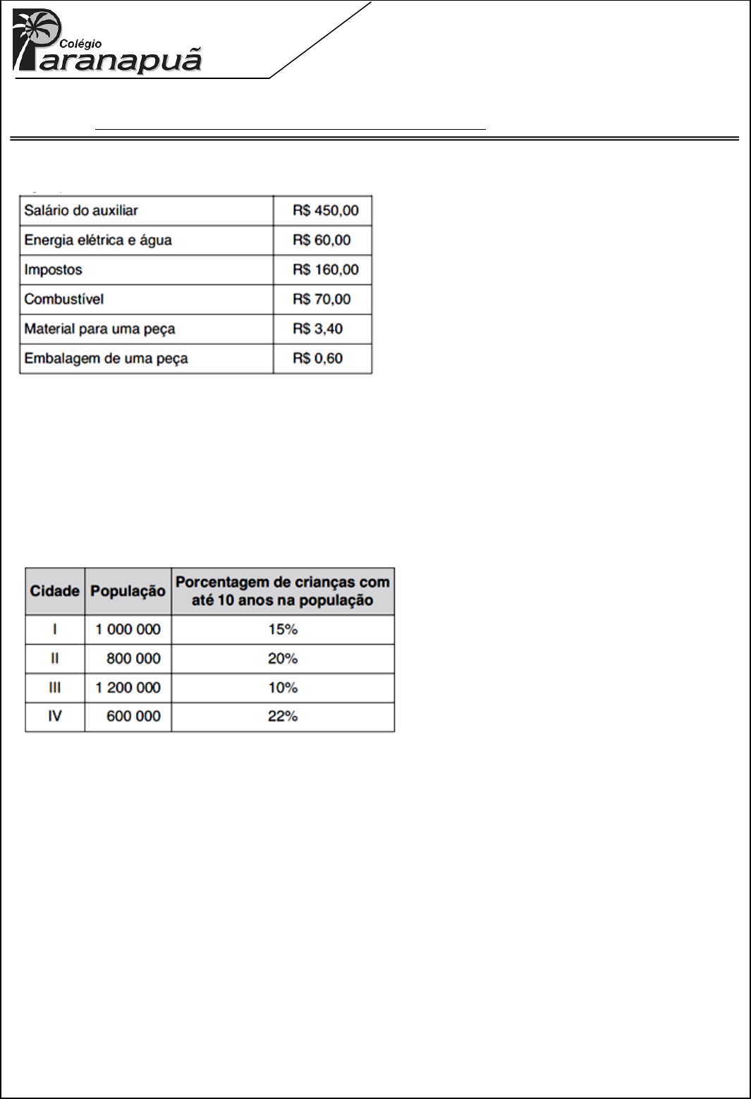 LISTA ENEM 7 Rio de Janeiro, ________ de _____________________________ de 2018. MATÉRIA: MATEMÁTICA PROF.(A).: EMANUEL SÉRIE: PV ALUNO(A): TURMA: TURNO: COLÉGIO PARANAPUÃ Rua Jaime Perdigão, 438 – Moneró Tel.: 2462-4946 1) Uma artesã que produz pequenas esculturas em argila, pensando em ampliar seu negócio, elaborou a tabela a seguir para calcular seus custos mensais. Utilizando-se os dados da tabela, a relação entre o custo C e o número de peças N produzidas mensalmente pode ser estabelecida na sentença matemática dada por: A) C = 740N B) C = 4 + 740N C) C = 740 – 4 D) C = 4N + 740 E) C = 4N + 820 2) O governo de determinado Estado liberou verbas para a construção de um hospital para o tratamento de uma doença que atinge, na maioria dos casos, crianças de até 10 anos. Quatro cidades ofereceram terrenos para a construção do hospital. A tabela abaixo mostra dados sobre as populações dessas cidades. A Secretaria de Saúde do Estado decidiu construir o novo hospital na cidade que tem o maior número de crianças com idade até 10 anos. O hospital deverá ser construído na cidade: A) I. B) II. C) III. D) IV. E) III ou IV. 3) Carlos paga R$ 1.000,00 mensais de aluguel por uma máquina copiadora que faz cópias coloridas e em preto e branco. Considere que o custo de uma cópia colorida é R$ 0,20 e o de uma em preto e branco é R$ 0,01 e que Carlos recebe R$ 1,00 por cópia colorida e R$ 0,10 por cópia em preto e branco. Com base nessas informações e sabendo-se que, em certo mês, o total de cópias foi 11000 e a receita proveniente dessas cópias foi R$ 2.000,00, é correto afirmar que o lucro de Carlos com essa copiadora, nesse mês, foi: A) R$ 300,00. B) R$ 600,00. C) R$ 700,00. D) R$ 1000,00. E) R$ 1700,00. Texto para as questões 4 e 5. Numa escola pública do Estado de São Paulo, verificou-se que apenas 60% dos alunos são moças e, destas, 25% são loiras, 50% têm cabelos castanhos e 25% têm cabelos pretos. Dos rapazes, 20% são loiros, 30% têm cabelos castanhos e 50% têm cabelos pretos. Escolheu-se, ao acaso, um dos alunos dessa escola. 4) A probabilidade de a pessoa escolhida ser loira é: A) 20%. B) 23%. C) 35%. D) 40%. E) 45%. 5) A probabilidade de a pessoa escolhida ser moça, sabendo-se que tem cabelo preto, é: A) 1/7 B) 2/7 C) 3/7 D) 4/7 E) 5/7 6) ABCD é um quadrado cujo lado mede a e M e o ponto médio de AB. M e o centro da semicircunferência que contem o ponto A e A e o centro da semicircunferência que contem o ponto D. Se S1 for o valor da área da região hachurada e S2 a da região pontilhada, então 7) A figura indica uma sequência de quadrados brancos e escuros formados a partir de um quadrado maior de lado x cm. Nas condições dadas, somando-se os perímetros de todos os quadrados escuros obteremos, em centímetros, resultado igual a 8) A figura a seguir é delimitada por três lados de um quadrado de medida a = 5 cm, dois lados de um triângulo equilátero de medida b = 3 cm e o arco de uma semicircunferência cujo diâmetro faz um ângulo reto com um dos lados do triângulo. O perímetro da figura em cm é igual a: 9) A proprietária de uma banca de artesanatos registrou, ao longo de dois meses de trabalho, a quantidade diária de guardanapos bordados vendidos (g) e o preço unitário de venda praticado (p). Analisando os dados registrados, ela observou que existia uma relação quantitativa entre essas duas variáveis, a qual era dada pela lei: O preço unitário pelo qual deve ser vendido o guardanapo bordado, para que a receita diária da proprietária seja máxima, é de a) R$ 12,50. b) R$ 9,75. c) R$ 6,25. d) R$ 4,25. e) R$ 2,00. 10) O sólido da figura abaixo é composto pela pirâmide quadrangular PQRST e pelo cubo ABCDEFGH, cuja aresta mede 2. Sabendo que os vértices da base da pirâmide são pontos médios dos lados do quadrado ABCD e que a distância do ponto P ao plano (ABC) é igual a 6, então o volume do sólido é igual a A) 12 B) 16 C) 18 D) 20 E) 24