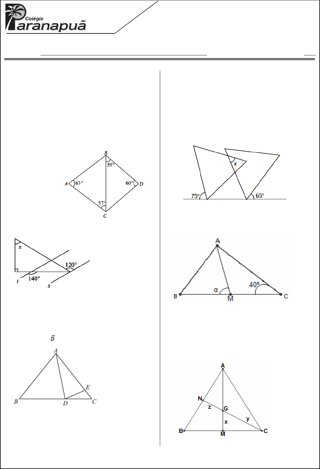 MATÉRIA: MATEMÁTICA PROF.(A).: Emanuel Jaconiano SÉRIE: ALUNO(A): TURMA: PV TURNO: � 1) Dados os números abaixo, verifique se podem representar triângulos e, em caso afirmativo, classifique quanto aos lados e aos ângulos. a) 6, 8, 14 b) 4, 5, 10 c) 19, 20, 21 d) 8, 15, 17 e) 3, 4, 6 f) 3, 3, 2 2) (PUC) O maior dos segmentos desenhados na figura abaixo é: a) AB b) AC c) BC d) BD e) CD 3) (Fuvest) As retas t e s são paralelas. A medida do ângulo x, em graus, é: a) 30 b) 40 c) 50 d) 60 e) 70 4) Na figura a seguir, AB = AC, AD = AE e BÂD = 48º . O valor do ângulo C E é: a) 12° b) 18° c) 24° d) 36° e) 48° 5) A distância entre o circuncentro e o baricentro de um triângulo retângulo de hipotenusa 42 cm é: a) 14 cm b) 12 cm c) 9 cm d) 7 cm e) 6 cm 6) Na figura, os dois triângulos são equiláteros. Qual é o valor do ângulo x? 7) Na figura, o triângulo ABC é retângulo em A e M é o ponto médio do lado BC. Então a medida de ( , em graus, é: a) 80º b) 90º c) 100º d) 110º e) 120º 8) No triângulo ABC, da figura, AM e CN são medianas que se interceptam em G. Sendo AG = 10 cm e CN = 18 cm, calcule x, y e z. 9) Na figura, M é o ponto médio do lado BC e CN é a bissetriz interna. Então a medida ( , em graus, é: a) 80º b) 75º c) 70º d) 65º e) 60º 10) Um ponto P, interno a um triângulo, eqüidista dos vértices de um triângulo ABC. O ponto P é: a) O baricentro do triângulo ABC. b) O incentro do triângulo ABC. c) O circuncentro do triângulo ABC. d) O ortocentro do triângulo ABC. e) Um ex-incentro do triângulo ABC. 11) Um ponto Q pertence à região interna de um triângulo DEF e eqüidista dos lados desse triângulo.O ponto Q é: a) O baricentro do triângulo DEF. b) O incentro do triângulo DEF. c) O circuncentro do triângulo DEF. d) O ortocentro do triângulo DEF. e) Um ex-incentro do triângulo DEF. 12) Qual dos pontos notáveis do triângulo pode ser um de seus vértices? a) baricentro b) incentro c) circuncentro d) ortocentro e) ex-incentro. 13) Quais pontos notáveis de um triângulo nunca se posicionam externamente em relação à sua região triangular? a) Baricentro e Ortocentro b) Incentro e Circuncentro c) Baricentro e Circuncentro d) Incentro e Ortocentro e) Baricentro e Incentro 14) (UNITAU) O segmento da perpendicular traçada de um vértice de um triângulo à reta suporte do lado oposto é denominado: a) Mediana b) Mediatriz c) Bissetriz d) Altura e) Base. 15) (ESAM) O segmento da perpendicular traçada de um vértice de um triângulo à reta do lado oposto é denominada altura. O ponto de intersecção das três retas suportes das alturas do triângulo é chamado: a) Baricentro b) Incentro c) Circuncentro d) Ortocentro e) Mediano 16) (CESESP) Dentre os quatro centros principais do triângulo qualquer, há dois deles que podem se situar no seu exterior, conforme o tipo de triângulo. Assinale a alternativa em que os mesmos são citados. a) O baricentro e o ortocentro. b) O baricentro e o incentro. c) O circuncentro e o incentro. d) O circuncentro e o ortocentro. e) O incentro e o ortocentro. 17) No triângulo ABC da figura = 60º e = 20º. Qual o valor do ângulo HÂS formado pela altura e a bissetriz? 18) No triângulo ABC da figura é altura e é a bissetriz do ângulo AC. Determine BC, sendo dados BÂH = 30º e AB = 40°. LISTA DE EXERCÍCIOS 3 TRIÂNGULOS �EMBED PBrush��� Rio de Janeiro, ________ de _____________________________ de 2016 �