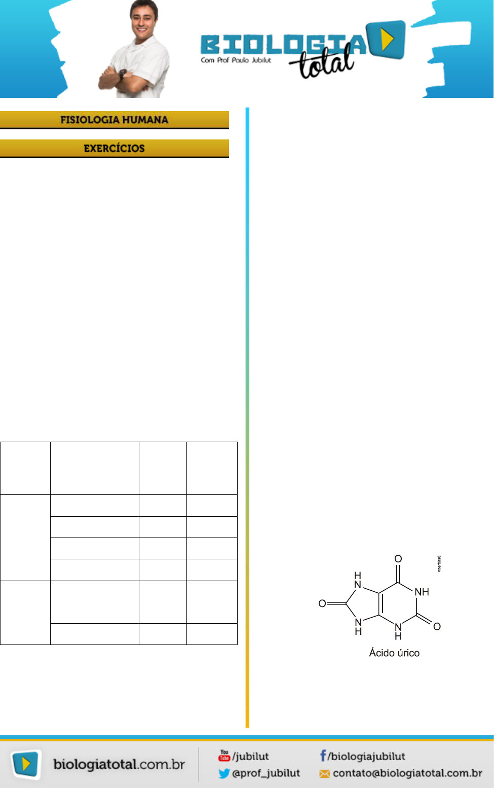 1. (PUCSP) A prática de esportes promove modificações orgânicas significativas no corpo dos atletas, o que leva à necessidade de ajustes metabólicos e fisiológicos que atendam à grande demanda por energia e permitam a rápida remoção de metabólitos desnecessários. O organismo de um atleta que apresenta bom condicionamento físico realiza tais ajustes de modo eficiente, mesmo em condições de esforço intenso, como, por exemplo, no caso das longas provas de maratona. As alterações nas concentrações sanguíneas de lipídios apresentadas na tabela abaixo são condizentes com vários outros estudos que apontam os efeitos benéficos do exercício físico na prevenção de doenças cardiovasculares, especialmente o infarto do miocárdio. Um estudo realizado com maratonistas revelou alterações bioquímicas substanciais decorrentes do esforço. Neste estudo, foi solicitado a vinte maratonistas do sexo masculino que percorressem os 21 km equivalentes a uma meia maratona. Amostras de sangue e urina desses atletas foram coletadas antes e depois da prova, a partir das quais foram medidos parâmetros bioquímicos. Alguns resultados estão dispostos na tabela a seguir. Tipo de amostra Parâmetros bioquímicos Antes da prova (valores médios) Após a prova (valores médios) SANGUE Triglicerídeos (mg/dL)] 86 69 Colesterol LDL (mg/dL) 155 110 Colesterol HDL (mg/dL) 43 47 Ácido úrico sanguíneo (mg/dL) 5 3,5 URINA Ácido úrico urinário (mg/mg de creatinina) 0,3 0,6 Aspecto/turbidez da urina* 0,0 1,0 Dados obtidos a partir de Siqueira e cols. (2009). Análise de parâmetros bioquímicos séricos e urinários em atletas de meia maratona. Arq Bras Endocrinol Metab. 53(7): 844-52. * A turbidez urinária permite deduzir o grau de diluição da urina: quanto mais turva, menos diluída e vice-versa Com base em seus conhecimentos de Biologia e Química, responda: a) Explique o mecanismo fisiológico responsável pela variação na concentração (turbidez) da urina nos atletas durante a prova de meia maratona mencionada no texto. Considere, em sua resposta, a intensa sudorese dos atletas ocorrida durante a prova e a ação do hormônio ADH. _____________________________________________ _____________________________________________ _____________________________________________ _____________________________________________ _____________________________________________ _____________________________________________ _____________________________________________ _____________________________________________ _____________________________________________ _____________________________________________ b) Estabeleça uma correlação entre colesterol e infarto do miocárdio. De que modo os valores de colesterol LDL e colesterol HDL apresentados na tabela demonstram um efeito benéfico da prática esportiva na prevenção do infarto? _____________________________________________ _____________________________________________ _____________________________________________ _____________________________________________ _____________________________________________ _____________________________________________ _____________________________________________ _____________________________________________ _____________________________________________ _____________________________________________ _____________________________________________ _____________________________________________ c) Escreva a fórmula molecular do ácido úrico e determine a porcentagem em massa de nitrogênio presente nessa substância. (Massas atômicas: H = 1; C = 12; N = 14; O = 16) _____________________________________________ _____________________________________________ _____________________________________________ _____________________________________________ _____________________________________________ _____________________________________________ d) Equacione a reação de hidrólise do triglicerídeo representado a seguir. Indique a função química a que pertence cada um dos produtos dessa reação. 2. (FUVEST) Em mamíferos saudáveis, a concentração de excreta nitrogenada difere na urina de herbívoros comedores de grama e de carnívoros estritos. a) Que excreta nitrogenada está presente na urina dos animais de cada um desses grupos? _____________________________________________ _____________________________________________ b) Em qual desses grupos de animais a concentração de excreta nitrogenada é maior? Justifique sua resposta. _____________________________________________ _____________________________________________ _____________________________________________ 3. (FUVEST) Logo após a realização de provas esportivas, parte da rotina dos atletas inclui a ingestão de água e de bebidas isotônicas; também é feita a coleta de urina para exames antidoping, em que são detectados medicamentos e drogas, eventualmente ingeridos, que o corpo descarta. As bebidas isotônicas contêm água, glicose e sais minerais, apresentando concentração iônica semelhante à encontrada no sangue humano. No esquema abaixo, os números de 1 a 4 indicam processos, que ocorrem em um néfron do rim humano. a) Qual(is) número(s) indica(m) processo(s) pelo(s) qual(is) passa a água? _____________________________________________ _____________________________________________ _____________________________________________ _____________________________________________ b) Qual(is) número(s) indica(m) processo(s) pelo(s) qual(is) passam as substâncias dissolvidas, detectáveis no exame antidoping? _____________________________________________ _____________________________________________ _____________________________________________ _____________________________________________ _____________________________________________ _____________________________________________ _____________________________________________ c) Após uma corrida, um atleta, em boas condições de saúde, eliminou muito suor e muita urina e, depois, ingeriu bebida isot