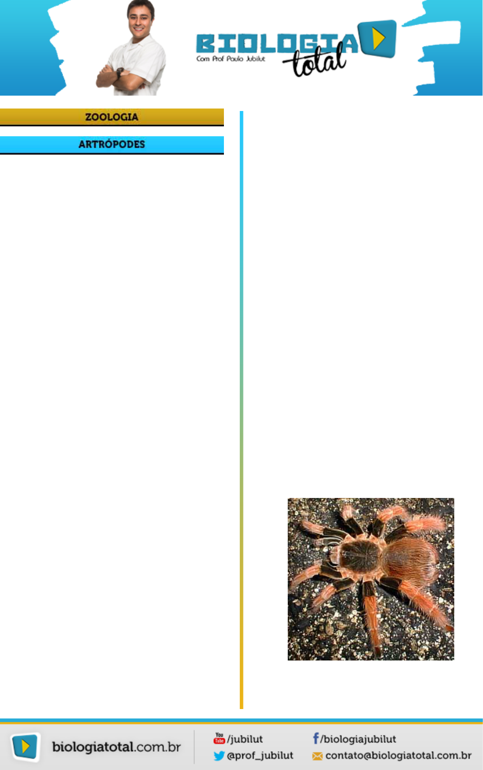 Os artrópodes formam o mais bem sucedido grupo de invertebrados, contando com mais de 1.000.000 de espécies descritas. São os primeiros animais que efetivamente conquistaram o meio terrestre. Isto se deu graças ao surgimento do exoesqueleto quitinoso impermeável que impede a desidratação e são os únicos invertebrados que possuem asas O exoesqueleto limita o crescimento dos representantes deste grupo. A grande maioria mede poucos centímetros, apesar de existirem espécies microscópicas e outras gigantes, como o caranguejo do Japão que pode medi 3,5 m de diâmetro ou a lagosta do Atlântico, que pode chegar a 60 cm de comprimento. A diversidade deste grupo é muito grande e permite a sobrevivência dos artrópodes em todos os ambientes. Crustáceos, insetos, aracnídeos, quilópodos e diplópodos formam um grupo muito heterogêneo de animais. Sua importância para o homem é muito grande, tanto para a alimentação como para a economia. Camarão, lagosta e caranguejo são consumidos às toneladas anualmente. Muitos povos alimentam-se de insetos e de suas larvas. O homem também utiliza produtos elaborados por algumas espécies, tais como o mel e a cera de abelhas, bem como a seda fabricada pela larva da borboleta Bombix mori. Características Gerais São animais triblásticos, celomados, esquizocélicos, protostômios, hiponeuros e de simetria bilateral. Apesar da enorme diversidade de formas que este filo apresenta, existem algumas características que são comuns a todos os seus membros: Ø Corpo segmentado Ø Exoesqueleto de quitina Ø Patas articuladas O corpo é sempre revestido por um exoesqueleto endurecido contendo quitina (um polissacarídeo), que é trocado periodicamente, permitindo o crescimento do animal; essas mudas recebem o nome de ecdise e são reguladas por hormônios. Desta forma, os artrópodes apresentam um crescimento descontínuo. Alguns artrópodes como as lagostas e a maioria dos caranguejos, continuam sofrendo mudas durante toda a vida. Outros, como os insetos e as aranhas, cessam as mudas quando atingem a maturidade sexual. A muda é controlada por hormônios, como a ecdisona, secretados por glândulas especiais, atuando diretamente sobre as células epidérmicas. Há inclusive hormônios encarregados de regular a produção de ecdisona. São segmentados, mas a metameria é mais evidente na fase embrionária, pois no adulto há tendência à fusão de segmentos, originando partes definidas do corpo, como cabeça, tórax e abdome. Apresentam patas e outros apêndices articulados (daí o nome do filo). O sistema nervoso apresenta um padrão básico em todos os artrópodes, variando muito pouco em cada classe. É formado por um gânglio cerebróide bem desenvolvido, situado na cabeça, de onde partem cordões nervosos longitudinais ventrais ao longo dos quais existe uma cadeia de gânglios. Desse conjunto partem ramificações que inervam todas as partes do corpo do animal. Desta forma, o sistema nervoso dos artrópodes é classificado como ganglionar ventral. CLASSIFICAÇÃO: Fisiologia e Reprodução A classificação dos artrópodes reflete a grande diversidade do filo. Vejamos a seguir uma simplificação desta classificação, na qual os artrópodes atuais podem ser divididos em: Classe Arachnida Os aracnídeos possuem quatro pares de patas e uma clara divisão corporal em cefalotórax e abdome. São desprovidos de antenas seus representantes mais destacados são: escorpiões, aranhas, carrapatos e ácaros. Tarântula Escorpião Ácaro Seu corpo consiste de um cefalotórax (cabeça fundida ao tórax) e um abdome. No cefalotórax encontramos um par de quelíceras usada para injetar o veneno na presa, com exceção do escorpião, que possui quelíceras reduzidas. Geralmente existem oito olhos simples e um par de pedipalpos, que são curtos e usados como apêndice gustativo, mas, em machos, podem atuar como estruturas copulatórias. Servem também como estruturas de percepção táctil. Nos escorpiões, os pedipalpos são grandes e terminam em pinças para prender suas presas. Os quatros pares restantes são patas locomotoras. Não há antenas. No abdome temos as aberturas corporais, com destaque para a abertura genital, as aberturas respiratórias, as fiandeiras, por onde saem os fios de seda para a construção da teia, e o ânus. Nos escorpiões, o último segmento do abdome, denominado télson, possui um aguilhão com o qual o animal injeta veneno na vítima. O sistema digestório é completo e observa-se a digestão extracorpórea em algumas espécies: enzimas digestivas são lançadas sobre o alimento, fora do corpo. Após algum tempo, o alimento amolecido é engolido e o processo de digestão termina dentro do tubo digestório. O sistema respiratório é do tipo filotraqueal, formado por um ou dois pares de cavidades internas, situadas no abdômen, que contém um grande número de lamelas foliáceas, semelhantes às páginas de um livro; o ar penetre através de aberturas existentes na superfície do corpo, situadas no abdome e circula entre as lamelas realizando as trocas gasosas com a hemolinfa. O sistema circulatório é aberto e o líquido que ali circula é considerado uma hemolinfa, que contém hemocianina para transportar o oxigênio para os tecidos do corpo e trazer o gás carbônico resultante da respiração aeróbica. Os excretas nitrogenados são eliminados através de glândulas coxais (metanefrídios modificados). Os aracnídeos são animais dióicos e o dimorfismo sexual é comum, sendo as fêmeas maiores que os machos. Em geral, o macho maduro fabrica um saquinho de seda, onde deposita espermatozóides. Ao encontrar uma fêmea adulta, ele introduz os espermatozóides no poro genital feminino com auxílio dos pedipalpos. A fecundação é interna e o desenvolvimento direto. Algumas fêmeas carregam os pacotes (ootecas) de ovos ns costas enquanto outras depositam na teia ou em ramos de árvores próximos ao local onde vivem. Classe