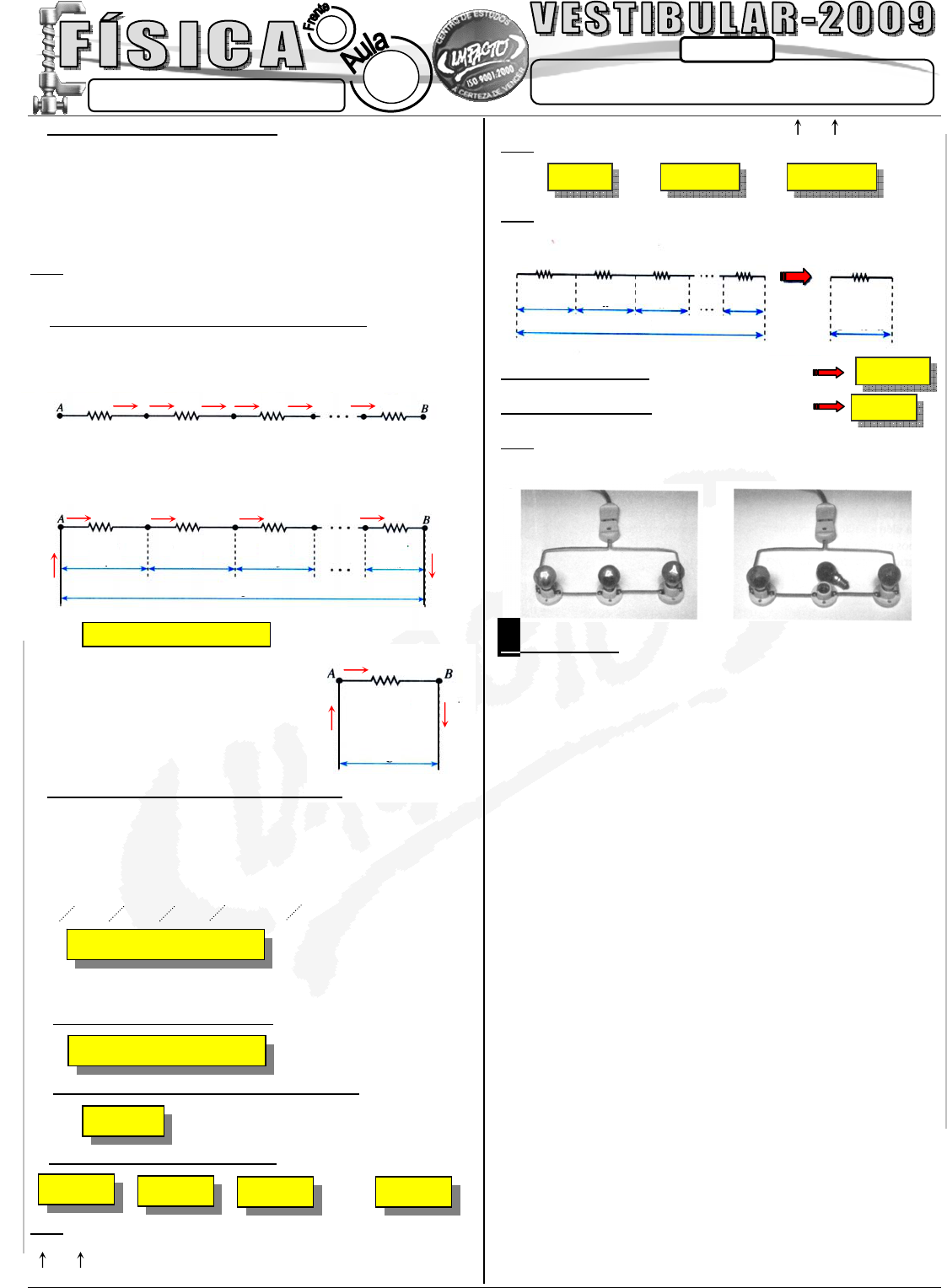 JACKY28/03/08 ASSOCIAÇÃO EM SÉRIE DE RESISTORES. FAÇO IMPACTO - A CERTEZA DE VENCER!!! PROFº: FARIAS Fa le c on os co w w w .p or ta lim pa ct o. co m .b r VE ST IB UL AR – 2 00 9 CONTEÚDO A Certeza de Vencer 05 3 r r r r u u u u U U Req R1 R2 R3 Rn Req = n.r U = n.u Req = R1 + R2 + R3 + ...+ Rn U1 = R1 . i U2 = R2 . i U3 = R3 . i Un = Rn . i , , , ... , i i i i i i R1 R2 R3 Rn U1 U2 U3 Un U U = U1 + U2 + U3 + ... + Un A) B) Req = R1 + R2 + R3 + ...+ Rn i Req i i U Req ou PT = Req.i2 PT = i.U ou PT = U2/Req 1. ASSOCIAÇÃO DE RESISTORES Uma associação de resistores consiste de vários resistores ligados eletricamente entre si. Numa residência, as lâmpadas e os diversos aparelhos elétricos ligados entre si constituem uma associação semelhante a dos resistores. Os resistores, dependendo de como são ligados, formam uma associação em série, paralelo ou mista. OBS: O resistor equivalente (Req) é aquele que pode substituir todos os resistores da associação. 2. ASSOCIAÇÃO EM SÉRIE DE RESISTORES: é aquela em que o terminal de saída do primeiro é ligado ao terminal de entrada do segundo; o terminal de saída do segundo é ligado ao terminal de entrada do terceiro e, assim, sucessivamente. Ao aplicarmos uma ddp U nos terminais A e B da associação em série, a corrente elétrica i, que vai para a associação, será a mesma para todos os resistores e a ddp U será dividida entre eles. Logo: O resistor equivalente da associação é o resistor que, submetido à mesma ddp U da associação, será percorrido pela mesma corrente i da associação. 3. CÁLCULO DO RESISTOR EQUIVALENTE (Req) Apliquemos a lei de Ohm a cada um dos resistores da associação e no resistor equivalente. Teremos: U1 = R1 . i , U2 = R2 . i , U3 = R3 . i , ... , Un = Rn . i e U = Req . i Substituindo na propriedade anterior, teremos: U = U1 + U2 + U3 + ... + Un Req . i = R1 . i + R2 . i + R3 . i + ... + Rn . i ¾ Na associação em série, siga esta ordem: 1º) Calcule o resistor equivalente. 2º) Calcule a corrente elétrica i da associação. 3º) Calcule a ddp em cada resistor. OBS1: Como a corrente é a mesma na associação em série, o resistor de maior resistência fica submetido à maior tensão ( U = R . i ) e dissipa a maior potência ( P = R . i 2 ). OBS2: Potência total dissipada numa associação (PT): OBS3: Na associação em série de n resistores iguais, de resistência r cada um, a ddp U nos terminais dessa associação divide-se igualmente, u para cada resistor. Resistor equivalente: Req = r + r + r + ... + r ddp U da associação: U = u + u + u + ... + u OBS4: As três lâmpadas da foto A estão associadas em série. Quando uma delas é retirada (foto B) ou “queima”, a corrente é interrompida no circuito e as outras duas se apagam. APLICAÇÕES 01. Numa associação em série de resistores, temos R1 = 20 Ω, R2 = 10 Ω e R3 = 30 Ω. Aplica-se uma tensão elétrica de 180 V nos extremos da associação. Pode-se afirmar que as tensões elétricas nos resistores R1, R2 e R3 serão, respectivamente, iguais a: a) 60 V, 30 V e 80 V. d) 90 V, 30 V e 80 V. b) 180 V, 180 V e 180 V. e) 60 V, 30 V e 90 V. c) 90 V, 30 V e 60 V. 02. Considere dois resistores R1 = 3 Ω e R2 = 6 Ω, ligados em série. Aplica-se a diferença de potencial V = 18 V aos extremos da ligação. Assinale a alternativa incorreta. a) R1 e R2 serão percorridos pela mesma corrente elétrica, cujo valor é 2 A. b) A resistência equivalente à associação em série vale 9 Ω. c) A diferença de potencial em R1 é diferente da diferença de potencial em R2. c) A potência dissipada pela associação é de 36 W. d) A potência dissipada no resistor R1 é maior que a potência dissipada em R2. 03. A corrente através de uma associação em série de resistências é igual a 5 A. Introduzindo-se no circuito uma nova resistência de 2 ohms em série, a corrente baixa para 4 A, mantida a ddp. O valor inicial da resistência do conjunto era, em ohms: a) 10 b) 8 c) 6 d) 4 e) 2 04. Para uma fileira de lâmpada de Natal, foram escolhidas lâmpadas de 20 Ω de resistência. Tal fileira de lâmpadas está dimensionada para uma intensidade de corrente igual a 0,3 A. Quantas lâmpadas desse tipo devem ser ligadas em série para que seja possível ligá-las a uma rede de tensão de 220 V? a) 47 lâmpadas d) 10 lâmpadas b) 27 lâmpadas e) 17 lâmpadas c) 37 lâmpadas U = Req . i FAÇO IMPACTO – A CERTEZA DE VENCER!!! Fa le c on os co w w w .p or ta lim pa ct o. co m .b r VE ST IB UL AR – 20 09 REVISÃO 01. Num circuito elétrico, dois resistores, cujas resistências são R1 e R2, com R1 > R2 , estão ligados em série. Chamando de i1 e i2 as correntes que os atravessam e de V1 e V2 as tensões a que estão submetidos, respectivamente, pode-se afirmar que: a) i1 = i2 e V1 = V2 d) i1 > i2 e V1 < V2 b) i1 = i2 e V1 > V2 e) i1 < i2 e V1 > V2 c) i1 > i2 e V1 = V2 02. Aplica-se uma diferença de potencial de 100V a um grupo de resistores ligados em série. Dos trechos AC, AD, BC, BD e CE, o que apresenta maior queda de potencial é: a) BD b) AC c) CE d) AD e) BC 03. No circuito temos três lâmpadas iguais ligadas a uma pilha. Analise as seguintes afirmações: I. A lâmpada A brilha mais que B. II. A lâmpada B tem um brilho menor que o de C. III. Se a lâmpada A queimar, apenas a lâmpada C brilhará. IV. Se a lâmpada B queimar, apenas a lâmpada A brilhará. V. Se a lâmpada A queimar, todas as outras apagarão. Qual a afirmativa correta? a) Somente a I. d) A II e a IV. b) A I e a III. e) Somente a V c) Somente a III. 04. O gráfico da ddp U em função da corrente elétrica i, para dois resistores R1 e R2, está esquematizado a seguir. Os resistores R1 e R2 estão ligados em série. Quando se estabelece uma ddp de 70 V, como mostra a figura, a corrente elétrica nos resistores, em ampères, é igual a: a) 7,0. 103 c) 3,5 .10-1 b) 1,0 .10 d) 1,4 .10-1 c) 1,0 .10-1 05. Considerando-se o circuito abaixo e sabendo-se que a diferenç