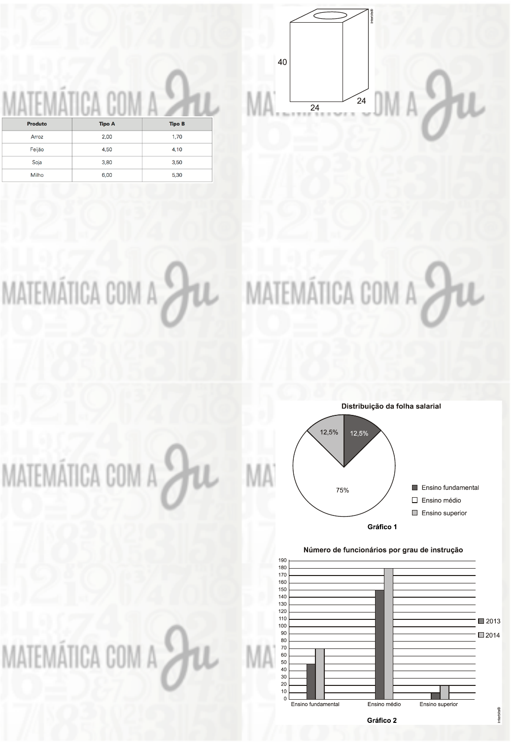 1) Um comerciante visita um centro de vendas para fazer cotação de preços dos produtos que deseja comprar. Verifica que se aproveita 100% da quantidade adquirida de produtos do tipo A, mas apenas 90% de produtos do tipo B. Esse comerciante deseja comprar uma quantidade de produtos, obtendo o menor custo/benefício em cada um deles. O quadro mostra o preço por quilograma, em reais, de cada produto comercializado. Os tipos de arroz, feijão, soja e milho que devem ser escolhidos pelo comerciante são, respectivamente, (A) A, A, A, A. (B) A, B, A, B. (C) A, B, B, A. (D) B, A, A, B. (E) B, B, B, B. 2) O tabagismo (vício do fumo) é responsável por uma grande quantidade de doenças e mortes prematuras na atualidade. O Instituto Nacional do Câncer divulgou que 90% dos casos diagnosticados de câncer de pulmão e 80% dos casos diagnosticados de enfisema pulmonar estão associados ao consumo de tabaco. Paralelamente, foram mostrados os resultados de uma pesquisa realizada em um grupo de 2 000 pessoas com doenças de pulmão, das quais 1 500 são casos diagnosticados de câncer e 500 são casos diagnosticados de enfisema. Com base nessas informações, pode-se estimar que o número de fumantes desse grupo de 2 000 pessoas é, aproximadamente: (A) 740 (B) 1 100 (C) 1 310 (D) 1 620 (E) 1 750 3) Um show especial de Natal teve 45000 ingressos vendidos. Esse evento ocorrerá em um estádio de futebol que disponibilizará 5 portões de entrada, com 4 catracas eletrônicas por portão. Em cada uma dessas catracas, passará uma única pessoa a cada 2 segundos. O público foi igualmente dividido pela quantidade de portões e catracas, indicados no ingresso para o show, para a efetiva entrada no estádio. Suponha que todos aqueles que compraram ingressos irão ao show e que todos passarão pelos portões e catracas eletrônicas indicados. Qual é o tempo mínimo para que todos passem pelas catracas? (A) 1 hora. (B) 1 hora e 15 minutos. (C) 5 horas. (D) 6 horas. (E) 6 horas e 15 minutos. 4) Uma lata de tinta, com a forma de um paralelepípedo retangular reto, tem as dimensões, em centímetros, mostradas na figura. Será produzida uma nova lata, com os mesmos formato e volume, de tal modo que as dimensões de sua base sejam 25% maiores que as da lata atual. Para obter a altura da nova lata, a altura da lata atual deve ser reduzida em (A) 14,4% (B) 20% (C) 32,0% (D) 36,0% (E) 64,0% 5) Uma empresa de alimentos oferece três valores diferentes de remuneração a seus funcionários, de acordo com o grau de instrução necessário para cada cargo. No ano de 2013, a empresa teve uma receita de 10 milhões de reais por mês e um gasto mensal com a folha salarial de R$400.000,00, distribuídos de acordo com o Gráfico 1. No ano seguinte, a empresa ampliará o número de funcionários, mantendo o mesmo valor salarial para cada categoria. Os demais custos da empresa permanecerão constantes de 2013 para 2014. O número de funcionários em 2013 e 2014, por grau de instrução, está no Gráfico 2. Qual deve ser o aumento na receita da empresa para que o lucro mensal em 2014 seja o mesmo de 2013? (A) R$114.285,00 (B) R$130.000,00 (C) R$160.000,00 (D) R$210.000,00 (E) R$213.333,00 6) Café no Brasil O consumo atingiu o maior nível da história no ano passado: os brasileiros beberam o equivalente a 331 bilhões de xícaras. Veja. Ed. 2158. 31 mar. 2010. Considere que a xícara citada na noticia seja equivalente a, aproximadamente, 120 mL de café. Suponha que em 2010 os brasileiros bebam ainda mais café, aumentando o consumo em 1 5 do que foi consumido no ano anterior. De acordo com essas informações, qual a previsão mais aproximada para o consumo de café em 2010? (A) 8 bilhões de litros. (B) 16 bilhões de litros. (C) 32 bilhões de litros. (D) 40 bilhões de litros. (E) 48 bilhões de litros. 7) Os dados do gráfico seguinte foram gerados a partir de dados colhidos no conjunto de seis regiões metropolitanas pelo Departamento Intersindical de Estatística e Estudos Socioeconômicos (Dieese). Supondo que o total de pessoas pesquisadas na região metropolitana de Porto Alegre equivale a 250 000, o número de desempregados em março de 2010, nessa região, foi de (A) 24 500. (B) 25 000. (C) 220 500. (D) 223 000. (E) 227 500. 8) Luíza decidiu pintar seus cabelos e os de sua mãe usando as cores B e C em ambas as tinturas. A cor B é a que tinge os cabelos brancos e a cor C dá um tom mais claro durante a exposição à luz. Luíza sabe que, em cabelos com muitos fios brancos, como os de sua mãe, a proporção entre as cores C e B é de 1 para 3. Para ela, que tem poucos fios brancos, a proporção a ser aplicada é de 3 partes da cor C para 1 parte da cor B. Além disso, como sua mãe tem cabelos curtos, basta a aplicação de 60 gramas de tintura; já para seus longos cabelos, serão necessários 120 gramas. De acordo com a situação descrita, a quantidade, em gramas, da tintura da cor B que Luíza deve adquirir para pintar os seus cabelos e os de sua mãe é: (A) 60 (B) 75 (C) 90 (D) 105 (E) 180 9) Vulcão Puyehue transforma a paisagem de cidades na Argentina Um vulcão de 2 440 m de altura, no Chile, estava “parado” desde o terremoto em 1960. Foi o responsável por diferentes contratempos, como atrasos em viagens aéreas, por causa de sua fumaça. A cidade de Bariloche foi uma das mais atingidas pelas cinzas. Disponível em: http://g1.globo.com. Acesso em: 25 jun. 2011 (adaptado). Na aula de Geografia de determinada escola, foram confeccionadas pelos estudantes maquetes de vulcões, a uma escala 1:40 000. Dentre as representações ali produzidas, está a do Puyehue, que, mesmo sendo um vulcão imenso, não se compara em estatura com o vulcão Mauna Loa, que fica no Havaí, considerado o maior vulcão do mundo, com 12 000 m de altura. Comparando as maquetes desses dois vulcões, qual a diferença, em centímetros, entre elas? (A) 1,26 (B) 3,92 (C) 4,92 (D) 20,3 (E) 23,9 10) O turismo brasileiro atra