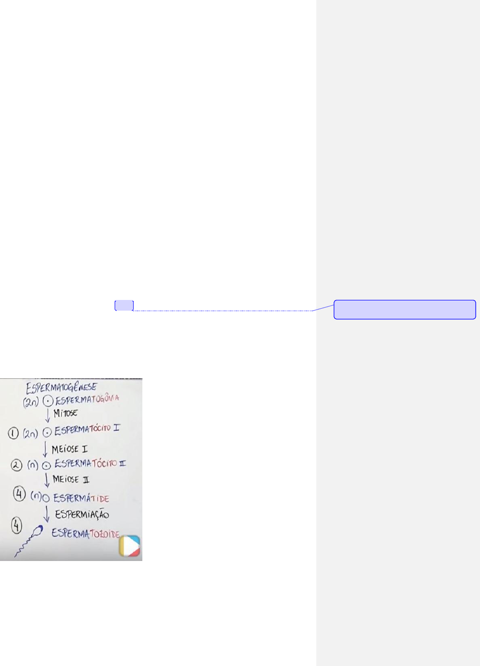 GAMETOGÊNESE HOMEM: a partir da puberdade MULHER: inicia na fase fetal e termina na puberdade. A gametogênese ocorre em 3 FASES: FASE DE PROLIFERAÇÃO (FORMAÇÃO): Formação da ovogônia e da espermatogônia FASE DE CRESCIMENTO: Fase de ovogônia virando ovócito. Espermatogônia virando espermatócito FASE DE MATURAÇÃO: Transformação do ovócito I em óvulo.transformação do espermatocito em espermatite e espermatozoide. A espermatogênese ocorre nos testículos. Espermatogênese: a espermatogonia (2n) é a célula que origina os espermatozoides. A espermatogonia vai sofrer processos de mitose e formar 1 espermatócito I (2n). o espermatocito I vai sofrer meiose I e dar origem a 2 células: 2 espermatócitos II (n) vai sofrer meiose II e formar 4 espermátides (n). As espermátides sofrem uma diferenciação chamada de espermiação originando o espermatozoide. Na espermiação o espermatozoide ganha o acrossomo e o flajelo. Comment by Carol: 2n: 2 conjuntos de cromossomos (1 conjunto da mae e outro do pai) A ovogênese ocorre nos ovários. Ovogênese: na ovogênese a ovogônia (2n) sofre mitose e forma o ovócito I (NA FASE EMBRIONÁRIA). O processo de meiose I que transforma o ovócito I (2n) em ovócito II (n) + um corpúsculo polar ( que não serve pra nada e eh liberado, ele so tem a outra metade de cromossomos) (ocorre na puberdade, menstruação). O ovócito II (n) só vai formar o óvulo (n) (ou seja, sofrer meiose II) quando houver fecundação. O que a mulher libera na mestruação é o ovócito II. A célula gamética feminina é muito maior que a masculina pq ela precisa ter espaço para ter o vitelo, que é o que vai nutrir o embrião. FECUNDAÇÃO: O espermatozoide fica viável dentro do corpo da mulher até 72 hrs. Os espermatozoides que contém o cromossomo Y (masculino) são mais leves e mais rápidos e menos resistentes. Já os espermatozoides que carregam o cromossomo X (feminino) são mais pesados, mais lentos e mais resistentes. Portanto se a relação sexual ocorrer no dia da ovulação, aumenta as chances de nascer menino, se ocorrer até 2 dias antes, menina, pois os espermatozoides X são mais resistentes e aguardarão a ovulação. O espermatozoide abre o acrossomo e libera enzimas digestivas que vão fazer a quebra da zona pelúcida e ele entra em contato com a membrana plasmática do ovócito ocorrendo a primeira fase da fecundação, a PLASMOGAMIA. A plasmogamia é a fusão da membrana plasmática do espermatozoide com a membrana plasmática do ovócito. O núcleo do espermatozoide entra pra dentro do ovócito. O resto dele fica pra fora. E o ovócito “tranca” a passagem para mais nenhum espermatozoide conseguir entrar. ovócito faz a meiose e forma óvulo depois que ocorre a fecundação e ocorre a cariogamia, (2 fase da fecundação = CARIOGAMIA) que é a fusão dos 2 núcleos, e a formação de uma célula diploide (2n) = zigoto. TIPOS DE OVOS OLIGOLÉCITOS / alécitos: oligo (pouco) lécito (vitelo) – são ovos com pouco vitelo. O vitelo é a reserva nutritiva do embrião. Alécitos sem vitelo. Exemplos de espécies com ovos oligolécitos: mamíferos placentários incluindo os humanos, poríferos (esponjas) e equinodermos (estrela do mar). Quando o óvulo sofre a fecundação, ele vai sofrer sucessivas clivagens ou divisões celulares. Essas clivagens no ovo oligolécito chamam-se HOLOBLÁSTICA IGUAL. Holoblástica pq todo o óvulo sofre clivagem e igual pq todas as células tem o mesmo tamanho qndo fazem a divisão celular. HETEROLÉCITOS- qndade mediana de vitelo. Esse vitelo se concentra em um polo: polo vegetativo. O outro polo, onde fica o gameta é o polo animal. As clivagens serão HOLOBLÁSTICA DESIGUAL. Ocorre nos 2 polos, porem no polo vegetativo correra de maneira mais lenta. As células do polo vegetal são maiores, com mais citoplasma e mais alargadas pq sofrem divisoes mais lentas. Região do polo animal-micrômero, região do polo vegetativo- macrômero. Exemplo: anfíbios. TELOLÉCITO- muito vitelo. Ocorre clivagem MEROBLÁSTICA DISCOIDAL. Exemplos: aves, répteis e alguns peixes. Comment by Carol: Mero- mtas partes de alguma coisaDiscoidal pq eh de disco CENTROLÉTICO- muito vitelo e o vitelo está centralizado. Sofre clivagem MEROBLÁSTICA SUPERFICIAL. Exemplo: artrópodes: aracnídeos, insetos.. EMBRIOGENESE Na mórula as células são totipotentes, ou seja, podem formar qualquer parte do individuo. É nessa parte que ocorre a formação dos gêmeos univitelinos. Um pedaço da mórula pode se desligar e formar outro individuo. Tbm pode ocorrer gêmeos siameses. Cada célula da mórula é chamada de blastômero. Mórula- 16-32 celulas. FASES DO DESENVOLVIMENTO EMBRIONÁRIO HUMANO DIVIDIDO EM 2 PERÍODOS: Período embrionário: dura cerca de 8 semanas (2 MESES) e ao final quase todos os órgãos já estão praticamente esboçados. Na segmentação, mesmo com o aumento do número de células, praticamente não há aumento do volume total do embrião, pois as divisões celulares são muito rápidas e as células não têm tempo para crescer. Período fetal: dura as semanas restantes até o parto e corresponde ao desenvolvimento dos órgãos e crescimento do feto. Na gastrulação, o aumento do número de células é acompanhada do aumento do volume total. Inicia-se nessa fase a diferenciação celular, ocorrendo a formação dos folhetos germinativos ou folhetos embrionários, que darão origem aos tecidos do indivíduo. No estágio seguinte, que é a organogênese, ocorre a diferenciação dos órgãos.