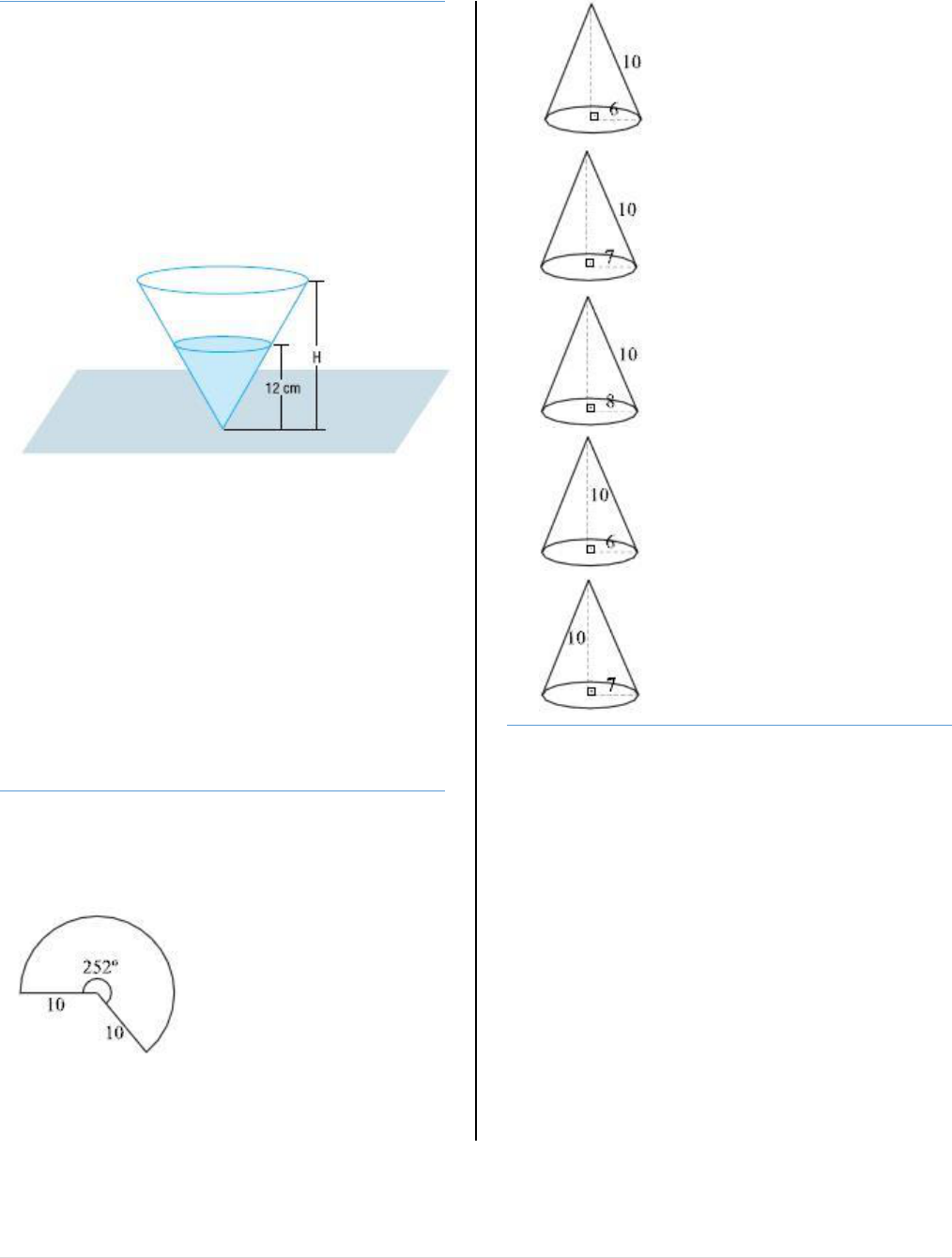 COMISSÃO DE VESTIBULANDOS 1 | http://comissaovestibulandos.blogspot.com.br/ Exercícios de Geometria Espacial. Cones e troncos de cones. QUESTÃO 1 A figura a seguir representa um recipiente cônico com solução aquosa de hipoclorito de sódio a 27%. O nível desse líquido tem 12 cm de altura. Para o preparo de um desinfetante, diluiu-se a solução inicial com água, até completar o recipiente, obtendo-se a solução aquosa do hipoclorito de sódio a 8%. Esse recipiente tem altura H, em centímetros, equivalente a: a) 16. b) 18. c) 20. d) 22. QUESTÃO 2 A figura indica a planificação da lateral de um cone circular reto: O cone a que se refere tal planificação é (A) (B) (C) (D) (E) QUESTÃO 3 A primeira figura a seguir é uma vista ortogonal de um cone de revolução cortado parcialmente. A planificação da superfície lateral curva pode variar com a altura do cone, tomando a forma de algumas das figuras seguintes (A, B, C, D e/ou E): 0-0) Pode ter a forma da figura A. 1-1) Pode ter a forma da figura B. 2-2) Pode ter a forma da figura C. 3-3) Pode ter a forma da figura D. COMISSÃO DE VESTIBULANDOS 2 | http://comissaovestibulandos.blogspot.com.br/ 4-4) Pode ter a forma da figura E. QUESTÃO 4 A secção meridiana de um cone é um triângulo isósceles de 96 cm de perímetro cuja altura vale do raio da base do cone. Corta-se o cone por um plano paralelo à base e a uma distância do vértice igual a da altura. A razão entre as áreas laterais do tronco e do cone parcial obtidos é igual a: A) 5 B) 6 C) 7 D) 8 E) 9 QUESTÃO 5 Marcos, sentindo muito calor, senta-se em um bar e pede um chope, o qual lhe é servido em uma “tulipa”, que é um copo na forma de um cone invertido. O garçom chega com a bebida ao mesmo tempo em que “Purê”, seu grande amigo, passa em frente ao bar. Marcos grita: – “Purê, sente-se aqui e tome a metade do chope desta tulipa comigo!” Purê senta-se, faz cara de quem não sabe o que fazer e diz: – “Marcos, mas até que altura do copo eu devo beber o chope para que sobre exatamente a metade para você?” Marcos pega um guardanapo de papel, uma caneta e mede a altura da tulipa, que era de 20 cm. Após alguns minutos e algumas contas, Marcos diz ao amigo: – Você deve beber os primeiros... Use: 4 1/3 ≈ 1,6 (A) 4 cm de chope na tulipa. (B) 5 cm de chope na tulipa. (C) 10 cm de chope na tulipa. (D) 15 cm de chope na tulipa. (E) 16 cm de chope na tulipa. QUESTÃO 6 Um cone circular reto, cuja medida da altura é h, é seccionado, por um plano paralelo à base, em duas partes: um cone cuja medida da altura é e um tronco de cone, conforme a figura. A razão entre as medidas dos volumes do cone maior e do cone menor é: A) 15 B) 45 C) 90 D) 125 QUESTÃO 7 Um sólido com a forma de um cone circular reto, constituído de material homogêneo, flutua em um líquido, conforme a ilustração a seguir. Se todas as geratrizes desse sólido forem divididas ao meio pelo nível do líquido, a razão entre o volume submerso e o volume do sólido será igual a: (A) (B) COMISSÃO DE VESTIBULANDOS 3 | http://comissaovestibulandos.blogspot.com.br/ (C) (D) QUESTÃO 8 Uma rasa é um paneiro utilizado na venda de frutos de açaí. Um típico exemplar tem forma de um tronco de cone, com diâmetro de base 28 cm, diâmetro de boca 34 cm e altura 27 cm. Podemos afirmar, utilizando = 3,14, que a capacidade da rasa, em litros, é aproximadamente (A) 18 (B) 20 (C) 22 (D) 24 (E) 26 QUESTÃO 9 Ao seccionarmos um cone circular reto por um plano paralelo a sua base, cuja distância ao vértice do cone é igual a um terço da sua altura, obtemos dois sólidos: um cone circular reto S1 e um tronco de cone S2. A relação é igual a: A) 33. B) 27. C) 26. D) 9. E) 3. QUESTÃO 10 Uma chapa com forma de um setor circular de raio 20 cm e ângulo de x graus é manuseada para se transformar num cone. Se o raio da base do cone obtido é r = 5 cm, então o valor de x é: a) 60° b) 75° c) 80° d) 85° e) 90° QUESTÃO 11 Um recipiente tem forma de um tronco de cone reto de bases paralelas e raios das bases medindo 9 cm e 3 cm. Considerando que a altura do recipiente é igual a 10 cm, pode-se afirmar que sua capacidade, em cm 3 , é igual a: 01) 300 02) 315 03) 350 04) 375 05) 390 QUESTÃO 12 Considere que o túnel de luz na figura I seja formado pela sobreposição de cinco anéis de um COMISSÃO DE VESTIBULANDOS 4 | http://comissaovestibulandos.blogspot.com.br/ mesmo cone circular reto – secções obtidas por planos perpendiculares ao eixo do cone –, tendo cada anel altura igual a 2 m, e sendo o maior e o menor raio interno medidos dentro do túnel iguais a 2 m e 4,5 m, respectivamente, conforme ilustrado na figura II. Considere, ainda, que, na figura I, z1, z2, z3 e z4 sejam números complexos que satisfazem à equação z 4 = 256. Com base nessas informações, julgue os itens (certo ou errado). • Se o tronco de cone correspondente ao túnel fosse prolongado de modo a obter o cone de altura H especificado na figura II, então deveria ser acrescentado um cone de altura h = 8 m. • O volume interno do túnel de luz ilustrado na figura I é superior a 111 m 3 . • Identificado-se o número complexo z = x + iy com o ponto P = (x, y) em um sistema de coordenadas cartesianas xOy, a equação da circunferência que contém os pontos z1, z2, z3 e z4 será dada por x 2 + y 2 = 4. • Se a circunferência que passa pelos pontos z1, z2, z3 e z4 for esboçada no plano complexo, então o eixo imaginário será perpendicular ao segmento z1z2 ou ao segmento z2z3. • É correto concluir que z1+ z2 + z3 + z4 = 0. QUESTÃO 13 A superfície lateral de um cone circular reto é um setor circular de 120º e área igual a 3 cm 2 . A área total e o volume deste cone medem, em cm 2 e cm 3 , respectivamente A) B) C) D) E) . QUESTÃO 14 Sr. Ptolomeu construirá em sua chácara um jardim de formato circular com 16 m de diâmetro. Contornando o jardim, haverá uma calçada, medindo 1 m de largura