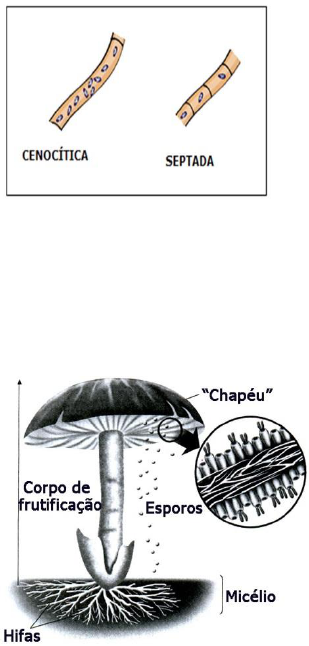 Fungos Características Gerais Unicelulares ou pluricelulares Eucariontes Heterótrofos Aeróbios ou anaeróbios Ambientes preferencialmente úmidos e ricos em matéria orgânica Morfologia e tamanhos variados Os pluricelulares são filamentosos formando filamentos denominados hifas que podem ser: O conjunto de hifas de um fungo recebe o nome de micélio. Existem hifas vegetativas, encarregadas da nutrição, e hifas reprodutoras, especializadas na reprodução. Em certos tipos de fungos, o micélio se organiza formando um talo ou corpo de frutificação A parede celular das células é rígida, sendo constituída basicamente por quitina NÃO armazenam amido como substâncias de reserva. À semelhança do que ocorre nos animais, os fungos armazenam glicogênio em suas células. Fundos realizam digestão extracorpórea, liberando enzimas que digerem o substrato orgânico e absorvem, em seguida, as substâncias provenientes da digestão. Algumas espécies de fungos vivem associadas a outros seres vivos mutualismo ou parasitismo Poucas espécies são predadoras de pequenos animais, geralmente, vermes produção de uma substância viscosa sobre a superfície das hifas, à qual ficam presos os pequenos vermes. Acredita-se que os fungos tenham evoluído a partir das algas, tendo, no entanto, perdido a condição autótrofa. A reprodução pode ser assexuada ou sexuada e, quase sempre, envolve a participação de esporos. Principais tipos de esporos : Classificação dos fungos Quitridiomicetos (quitriomicetos): Predominantemente aquáticos Unicelulares ou pluricelulares Algumas espécie são parasitas de algas plantas. Zigomicetos (Ficomicetos) Podem ser aquáticos ou terrestres Reprodução sexuadas ou assexuada Algumas espécies são responsáveis pelo mofo ou bolor de muitos alimentos. Ascomicetos (ascomycota) Unicelulares ou filamentados com hifas septadas Leveduras Algumas hifas especiais se diferenciam, assumindo uma forma de saco, conhecida por asco. O conjunto dos ascos de um micélio recebe o nome de ascocarpo que é um corpo de frutificação No grupo dos ascomicetos, existem espécies que, além dos ascósporos, também produzem conidiósporos. Ex.: Penicillium e Aspergilus Claviceps pururea se extrai o LSD Basidiomicetos Grupo mais evoluído dos fungos Cogumelos e as orelhas-de-pau Fungos filamentosos com hifas septadas Em seu chapéu, o basidiocarpo contem inúmeras hifas de reprodução denominadas basídios, onde são produzidos esporos, os basidiósporos que são disseminados pelo vento Champion Utilidades dos fungos Atuam como decompositores Alguns vivem associados com raízes de plantas, formando as micorrizas importância relevante na agricultura, uma vez que disponibiliza mais nutrientes minerais para o desenvolvimento das plantas cultivadas. Alimentação. Ex.: Champignon Espécies fermentadoras são utilizadas na produção de certos tipos de queijos e bebidas alcoólicas Certas leveduras, fermentos biológicos, são utilizadas na fabricação de paes, bolos e biscoitos. Algumas espécies servem como matéria-prima para a extração de drogas de interesse médico-farmacêutico. Muitas espécies se constituem com/ de ótimo material para estudo do código genético são muito utilizadas em Genética, Citologia e Bioquímica. Nocividades dos fungos Algumas espécies produzem toxinas prejudiciais ao nosso organismo Algumas espécies produzem substâncias alucinógenas LSD Muitas formas de alergias que afetam o sistema respiratório são provocadas por esporos de fungos existentes na poeira Muitas espécies parasitam plantas Muitas espécies são agentes etiológicos de varias doenças que acometem o homem e outros animais micoses