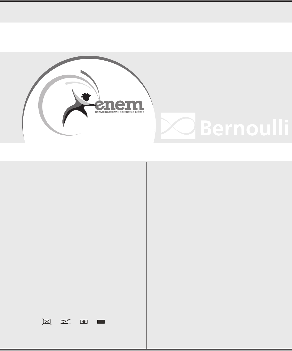 EXAME NACIONAL DO ENSINO MÉDIO UM ENSAIO PARA A VIDA INSTRUÇÕES PARA A PROVA LEIA ATENTAMENTE AS INSTRUÇÕES SEGUINTES: 1 Este CADERNO DE QUESTÕES contém 90 questões numeradas de 1 a 90, dispostas da seguinte maneira: a. as questões de número 1 a 45 são relativas à área de Ciências Humanas e suas Tecnologias; b. as questões de número 46 a 90 são relativas à área de Ciências da Natureza e suas Tecnologias. 2 Confira se o seu CADERNO DE QUESTÕES contém a quantidade de questões e se essas questões estão na ordem mencionada na instrução anterior. Caso o caderno esteja incompleto, tenha qualquer defeito ou apresente divergência, comunique ao fiscal de sala para que ele tome as providências cabíveis. 3 Para cada uma das questões objetivas, são apresentadas 5 opções. Apenas uma corresponde à questão. 4 Você deve ler cuidadosamente cada uma das questões e escolher a alternativa que corresponda à resposta correta. Essa alternativa (a, b, c, d ou e) deve ser preenchida completamente no item correspondente na folha de respos- tas que você recebeu, segundo o modelo abaixo. Observe: 5 O tempo disponível para estas provas é de quatro horas e trinta minutos. 6 Reserve os 30 minutos finais para preencher sua folha de respostas. Os rascunhos e as marcações assinaladas no CADERNO DE QUESTÕES não serão considerados na avaliação. 7 Você poderá deixar o local de prova somente após decorridas duas horas do início da aplicação. 8 Fica estritamente proibido: a. perturbar, de qualquer modo, a ordem no local de aplicação das provas, incorrendo em comportamento indevido durante a realização da prova; b. se comunicar, durante a prova, com outro participante verbalmente, por escrito ou por qualquer outra forma; c. utilizar ou tentar utilizar meio fraudulento, em benefício próprio ou de terceiros, em qualquer etapa da prova; d. utilizar livros, notas ou impressos durante a realização da prova; e. utilizar máquina calculadora ou quaisquer outros dispositivos eletrônicos, tais quais celulares, pagers e similares. Boa prova! A ERRADO ERRADO ERRADO CORRETO A A A PROVA DE CIÊNCIAS HUMANAS E SUAS TECNOLOGIAS PROVA DE CIÊNCIAS DA NATUREZA E SUAS TECNOLOGIAS PDF FINAL / CONFIGURAÇÕES DO DOCUMENTO ATUAL / PAULA.OLIVEIRA14 / 24-08-2015 (16:35) 2016 Diego Typewritten text SIMULADO 1 Diego Typewritten text Diego Typewritten text PROVA 1 1 ., ,, .. , CIÊNC!AS HUMA(\IAS E SUAS TECNOL~OGIAS Questões de 1 a 45 QUESTÃO 01 :::::,,========:~~~~~=:::::~~ ~===== ~;:;;;- ·~--- -lllllillilli llil lll O gr upo de quatro homens e dLtas mu lhe res, que estava perdido em uma mata no distrito de Joaquim Egídio, en1 Can1pinas-SP, foi resgatado na rnanhã desta terça -fe ira (22 de abril de 20í 4 ), após passar pelo menos '16 horas perd ido. Dispon ível e,n: <http ://g1.g iobo .com/sp/campinas -regiao/ n otic i a/20 14/ 04/fo rca-ta refa-en contra-grupo -de-jovens -perd idos-em- . . rnatã-:.ae~campinas .húnl >, Acess o em: ?3 nov. 2015 . O episódio poderia ter sido e,1itado se os jovens tivessem conheci111ento da área ou o amparo e o en tend imento de ferramentas cartoqráficas cotn o ~ ~ bússola e mapa local. @ drone e mapa-rnúndi. ~ irnagem de satélite e globo terrestre. 8 radar e planísfério , (i rosa dos ventos e isoípsas _ ·, Disponível em : <http:f!educador . bras ilesco la.com/estrategias-ensino/ as-contrad icoes-expansao -maritima .htn1>. Acesso ern: 09 dez . 2015 . 1ô... irnagem em questão -foi ret irada de L!m bes t iário medie,1al - obra que buscava represe ntar as bestas temidas e os per igos que existiam em reg iões distantes como o desconhecido Oceano Atlân t ico, No caso da imagern, observa-se a presença de um "peixe -se rra", que poderia afundar embarcações. Durante a Expansão Marít ima, um dos efei tos desse tipo de produção artística e uma forma de enf rentá - la estão indicados, respectivamente , em: ~ Temo r da navegação í possibilidade de enriquecimen to . . ' . ' 0 Aumento da religiosidade/ estudos das práticas navais. @ Resistência à navegação/ imposição do Estado. 4j) Aumento dos naufrágio s/ uso de várias e111barcações. ~ Avanço do Renascimento / produção de mapas nava is. , BERNOULLI SISTi::1\r1A DE ENS !NO -QUESTAO 03 ~~:==== :::!::::::::::::=:=,====,====,====,=======:=:::::::::===:=,====~llllllllllll!llllll O govern o chinês anunciou, nesta qLiinta-feira [29 de outubro de 2015}, que decidiu pôr fim à política do fi lho único, que, por mais de três décadas, impe diu que casais tivessem mais de uma criança, causa ndo impacto na sociedade e na eco nornia do país. Segundo a agência de notícias es tata l Xinh ua, o Par tido Comunista deterrninou que, agora, os casais poderão ter dois filhos _ Os efeitos da política també111 já estão claros. Nos últim os 15 anos, metade das esco las prilnárias e secundárias da região de RL1dong fecl1ararr1, e ce rca de 30o/o da população já têm mais de 50 anos - uma bo111ba demográfica prestes a explodir [" .J. Disponível em : <http://1i1Nvw,bbc,com/portuguese/ noticias/?015/10/151029 china bomba demoorafica cc> . - -· - -- - Acesso ern: 04 nov. 2015, [Fragmen to adaptado) De acordo corn a notícia, a bomba demográfica prestes a exp lodir na China é decorrente do(a) O avanco econômico dos mais velhos e do aumento da , 1 - . popu1açao Jovem. 0 cresc imento áo gasto coin as crianças e da ex1)ansão da pop ulaç ão idosa. ~ l d ~ despesa e.eva a com os adu ltos e da menor porcentagem de cria1,ças. 0 gasto com prev idência social e da qL1eda do número de trabalhadores . ~ redução do capita l dos jovens e do aumento da razão de dependênc ia, QUESTÃO 04 =================~,====,====,====::::::====::::=:=:::::::~=====,====~ lllllllllllllllllll Pensando rias correntes e prestes a entrar no braço que der iva da Corrente do Golfo para o norte , lembrei-me de um vidro de café solúvel vazio . Coloquei no vidro uma nota che ia de zeros, uma b