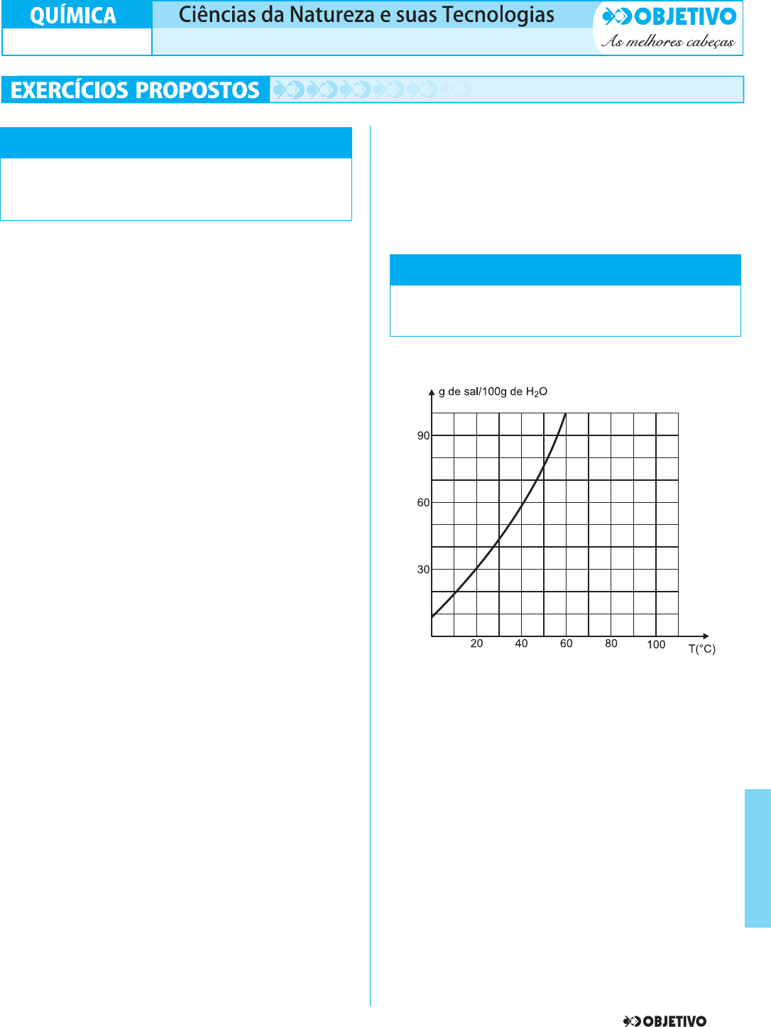 – 37 Q U ÍM IC A B D E 1. (UFSM-RS) – A quantidade máxima de NaCl que se pode dissolver em 100 g de água é de 36 g, a 20°C. Nessa temperatura, foi preparada uma solução contendo 29,3 g de NaCl em 100 g de água. Analise as afirmativas: I. A solução preparada é uma solução saturada. II. Nessa solução, a água é considerada o solvente e o NaCl, o soluto. III.A 20°C, a solução resultante contém duas fases. Está(ão) correta(s) a) apenas I. b) apenas II. c) apenas III. d) apenas I e III. e) apenas II e III. RESOLUÇÃO: I. Falsa. A quantidade de soluto adicionada (29,3 g) foi menor que 36 g (podendo ser dissolvida) e, portanto, a solução é insaturada. II. Verdadeira. A água é o solvente (determina o estado físico da solução), e o NaCl é o soluto. III.Falsa. A solução é insaturada (item I) e, portanto, contém uma única fase. Resposta: B 2. Em 540 g de uma solução saturada a 20°C, de um certo sal, existem xg de soluto dissolvidos em yg de solvente. Determine os valores de x e y, sabendo que a S = 80 g / 100 g de H2O a 20°C. RESOLUÇÃO: 80 g de sal ––––––––– 100 g de H2O –––––––– 180 g de solução x ––––––––– y –––––––– 540 g de solução x = 240 g de sal (soluto) y = 300 g de H2O (solvente) 3. (UNIFESP) – A lactose, principal açúcar do leite da maioria dos mamíferos, pode ser obtida a partir do leite de vaca por uma seqüência de processos. A fase final envolve a purificação por recristalização em água. Suponha que, para esta purificação, 100 kg de lactose foram tra - ta dos com 100 L de água, a 80ºC, agitados e filtrados a esta tem - peratura. O filtrado foi resfriado a 10°C. Solubilidade da lactose, em kg/100L de H2O: a 80°C .................. 95 a 10°C .................. 15 A massa máxima de lactose, em kg, que deve cristalizar-se com este procedimento é, aproxima damente, a) 5 b) 15 c) 80 d) 85 e) 95 RESOLUÇÃO: Ao adicionar 100 kg de lactose em 100 litros de água a 80°C, 95 kg irão dissolver-se e 5 kg serão sedimen ta dos. O sistema é filtrado e resfriado a 10°C. Como a 10°C se dissolvem 15 kg em 100 L de água, a mas sa máxima de lactose que se cristaliza é: m = (95 – 15) kg = 80 kg Resposta: C 1. (CESGRANRIO-RJ) – A curva de solubilidade de um sal hipo - tético é A quantidade de água necessária para dissolver 30 g do sal a 35°C, em g, é: a) 45 b) 75 c) 105 d) 60 e) 90 RESOLUÇÃO: Por intermédio do gráfico fornecido, a solubilidade do sal em 100 g de água a 35°C é 50 g, isto é, podemos dissolver no máximo 50 g de sal em 100 g de água a 35°C. 50 g ––––––– 100 g 30 g ––––––– x x = 60 g Resposta: D MÓDULO 15 SOLUÇÕES: SOLUBILIDADE MÓDULO 16 CURVAS DE SOLUBILIDADE SOLUBILIDADE DOS GASES EM LÍQUIDO FRENTE 1 – FÍSICO-QUÍMICA C4_BDE_QUIM_Tony_Prof 25/02/11 14:09 Página 37 2. (UNESP) – No gráfico, encontra-se representada a curva de solubilidade do nitrato de potássio (em gramas de soluto por 1000 g de água). Para a obtenção de solução saturada contendo 200 g de nitrato de potássio em 500 g de água, a solução deve estar a uma temperatura, aproximadamente, igual a a) 12°C. b) 17°C. c) 22°C. d) 27ºC. e) 32°C. RESOLUÇÃO: Cálculo da massa de nitrato de potássio em 1000 g de H2O na solução saturada: 500 g de H2O –––––––– 200 g de KNO3 1000 g de H2O –––––––– x x = 400 g de KNO3 Pelo gráfico, traçando as linhas de chamada, observamos que a temperatura do sistema deve ser da ordem de 27°C. Resposta: D 3. (MACKENZIE-SP) – As curvas de solubilidade têm grande im - por tância no estudo das soluções, já que a temperatura influi deci - sivamente na solubilidade das substâncias. Considerando as curvas de solubilidade dadas pelo gráfico, é correto afirmar que a) há um aumento da solubilidade do sulfato de cério com o aumento da temperatura. b) a 0ºC o nitrato de sódio é menos solúvel que o cloreto de potássio. c) o nitrato de sódio é a substância que apresenta a maior solubilidade a 20ºC. d) resfriando-se uma solução saturada de KClO3, pre parada com 100 g de água, de 90ºC para 20ºC, obser va-se a precipitação de 30 g desse sal. e) dissolvendo-se 15 g de cloreto de potássio em 50 g de água a 40ºC, obtém-se uma solução insaturada. RESOLUÇÃO: Com o aumento da temperatura, a solubilidade de Ce2(SO4)3 diminui. A 0°C, o nitrato de sódio (NaNO3) é mais solúvel que o cloreto de potássio (KCl). A 20°C, a substância de maior solubilidade é o iodeto de potássio (KI). A 90°C, 100 g de água dissolvem 50 g de KClO3 enquanto, a 20°C, 100 g de água dissolvem 10 g de KClO3. Observa-se a precipitação de 40 g de KClO3. A 40°C, 50 g de água dissolvem no máximo 20 g de KCl. Logo, a solução que tem 15 g de KCl dissolvidos em 50 g de água, a 40°C, é insaturada. Resposta: E 38 – Q U ÍM IC A B D E C4_BDE_QUIM_Tony_Prof 02/03/11 08:14 Página 38 4. (FEPAR) – Os recifes de corais, uma das grandes belezas naturais do planeta, estão seriamente afe ta dos e ameaçados de desaparecer quase inteiramente. As vítimas mais recentes foram os deslumbrantes re cifes coloridos que coroam as 300 ilhas do arqui pélago Fiji no Oceano Pacífico. Cerca de 65% dos re cifes branquearam e 15% morreram por causa de um aquecimento de apenas 4°C entre março e abril de 2000. Segundo os ambientalistas da Aliança Global para Recifes de Coral, ONG que monitora 207 recifes em todo mundo, 75% deles sofreram bran queamento em 1998, quando as temperaturas estiveram acima da média. (Rev. Veja) A elevação da temperatura da água afeta a vida dos organismos, levando-os à morte porque a) aumenta a solubilidade do oxigênio na água. b) aumenta a solubilidade do gás carbônico na água. c) diminui a solubilidade do oxigênio na água. d) diminui a quantidade de nutrientes na água. e) aumenta a quantidade de nutrientes na água. RESOLUÇÃO: O