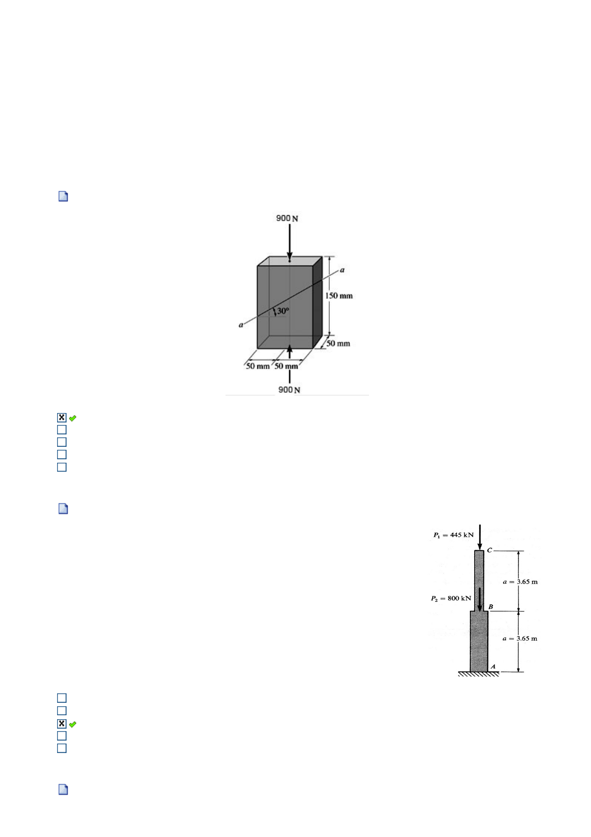 27/02/2019 EPS: Alunos http://simulado.estacio.br/alunos/ 1/4 1a Questão (Ref.:201805139267) Acerto: 0,2 / 0,2 O bloco plástico está submetido a uma força de compressão axial de 900 N. Supondo que as tampas superior e inferior distribuam a carga uniformemente por todo o bloco, determine as tensões normal e de cisalhamento médias ao longo da seção a-a. 135 kPa e 77,94 kPa 13,5 MPa e 7,8 MPa 0,09 MPa e 0,09 MPa 0,156 MPa e 0,156 MPa 0,156 MPa e 0,09 MPa 2a Questão (Ref.:201805139325) Acerto: 0,2 / 0,2 Um edifício de dois pavimentos possui colunas AB no primeiro andar e BC no segundo andar (vide figura). As colunas são carregadas como mostrado na figura, com a carga de teto P1 igual a 445 kN e a carga P2, aplicada no segundo andar, igual a 800 kN. As áreas das seções transversais das colunas superiores e inferiores são 3900 mm2 e 11000 mm2, respectivamente, e cada coluna possui um comprimento a = 3,65 m. Admitindo que E = 200 GPa, calcule o deslocamento vertical dc no ponto C devido às cargas aplicadas. 2,08 mm 6,15 mm 4,15 mm 2,06 mm 3,8 mm 3a Questão (Ref.:201805139268) Acerto: 0,2 / 0,2 27/02/2019 EPS: Alunos http://simulado.estacio.br/alunos/ 2/4 A coluna está submetida a uma força axial de 8 kN no seu topo. Supondo que a seção transversal tenha as dimensões mostradas na figura, determinar a tensão normal média que atua sobre a seção a-a. 1,82 MPa 182 kPa 0,182 MPa 5,71 MPa 571 kPa 4a Questão (Ref.:201805139265) Acerto: 0,2 / 0,2 CONSIDERANDO O GRÁFICO DE UM MATERIAL FRÁGIL É CORRETO AFIRMAR QUE: O GRÁFICO É REPRESENTADO POR UMA RETA COM ALTO COEFICIENTE ANGULAR. MATERIAL FRÁGIL NÃO OBEDECE A LEI DE HOOKE. O LIMITE DE PROPORCIONALIDADE CORRESPONDE A TENSÃO MÁXIMA. O ESCOAMENTO ACONTECE APÓS RESISTENCIA MÁXIMA. NÃO HÁ TENSÃO DE RUPTURA DEFINIDO. 5a Questão (Ref.:201805139286) Acerto: 0,2 / 0,2 Marque a afirmativa que considerar correta observando a figura ao lado e considerando que as barras verticais possuem o mesmo material e diâmetro e que as vigas horizontais: são rígidas possuem peso próprio desprezível As barras DE e EF terão a mesma deformação, pois possuem o mesmo material e comprimento e suportam uma viga rígida As barras com maior tensão são BG e DE As barras com maior tensão são BG e AH As barras com menor tensão são AH e CF A viga horizontal BC, por ser rígida, permanecerá em posição horizontal 6a Questão (Ref.:201805139484) Acerto: 0,2 / 0,2 Considere que uma barra prismática de seção transversal circular apresenta um diâmetro igual a 20mm. A mesma 27/02/2019 EPS: Alunos http://simulado.estacio.br/alunos/ 3/4 está sofrendo uma força axial de tração F = 6.000 N. A deformação linear específica longitudinal obtida foi de 3%. Determine a tensão normal e a variação no sem comprimento. 19,1 N/mm2; 15,0 mm. 19,1 N/mm2; 4,5 mm. 38,2 N/mm2; 9 mm. 38,2 N/mm2; 2,3 mm. 19,1 N/mm2; 9,0 mm. 7a Questão (Ref.:201805139479) Acerto: 0,2 / 0,2 Classificam-se como fundações, portanto, são ligações entre a estrutura e o solo, havendo também ligações entre os diversos elementos que com põem a estrutura. Qual alternativa corresponde a tal classificação? Treliças. Vinculos. Graus de liberdade. Estruturas planas. Engastamento. 8a Questão (Ref.:201805139474) Acerto: 0,2 / 0,2 Marque a alternativa que representa a característica do material que quando submetido a ensaio de tração e não apresenta deformação plástica, passando da deformação elástica para o rompimento. Vítreo Dúctil Estático Plástico Frágil 9a Questão (Ref.:201805139475) Acerto: 0,2 / 0,2 Os materiais frágeis são aqueles que suportam pouca ou nenhuma deformação no processo de ensaio de tração. Marque a alternativa que representa tais materiais. ferro fundido, aço carbono e cobre ouro, platina e cobre ferro fundido, o vidro, a porcelana. cimento, borracha e platina aço carbono, vidro e ouro 10a Questão (Ref.:201805139258) Acerto: 0,2 / 0,2 ASSINALE A OPÇÃO CORRETA EM RELAÇÃO A DUCTIBILIDADE: PROPRIEDADE QUE REPRESENTA O GRAU DE ESTRICÇÃO QUE UM MATERIAL SUPORTA ANTES DO SEU ESCOAMENTO. PROPRIEDADE QUE REPRESENTA O GRAU DE DEFORMAÇÃO QUE UM MATERIAL SUPORTA ANTES DO SEU ESCOAMENTO. PROPRIEDADE QUE REPRESENTA O GRAU DE ALONGAMAENTO QUE UM MATERIAL SUPORTA ANTES DO SEU ESCOAMENTO PROPRIEDADE QUE REPRESENTA O GRAU DE DEFORMAÇÃO QUE UM MATERIAL SUPORTA ANTES DO SEU LIMITE DE PROPORCIONALIDADE. PROPRIEDADE QUE REPRESENTA O GRAU DE DEFORMAÇÃO QUE UM MATERIAL SUPORTA ANTES DE SUA RUPTURA. 27/02/2019 EPS: Alunos http://simulado.estacio.br/alunos/ 4/4