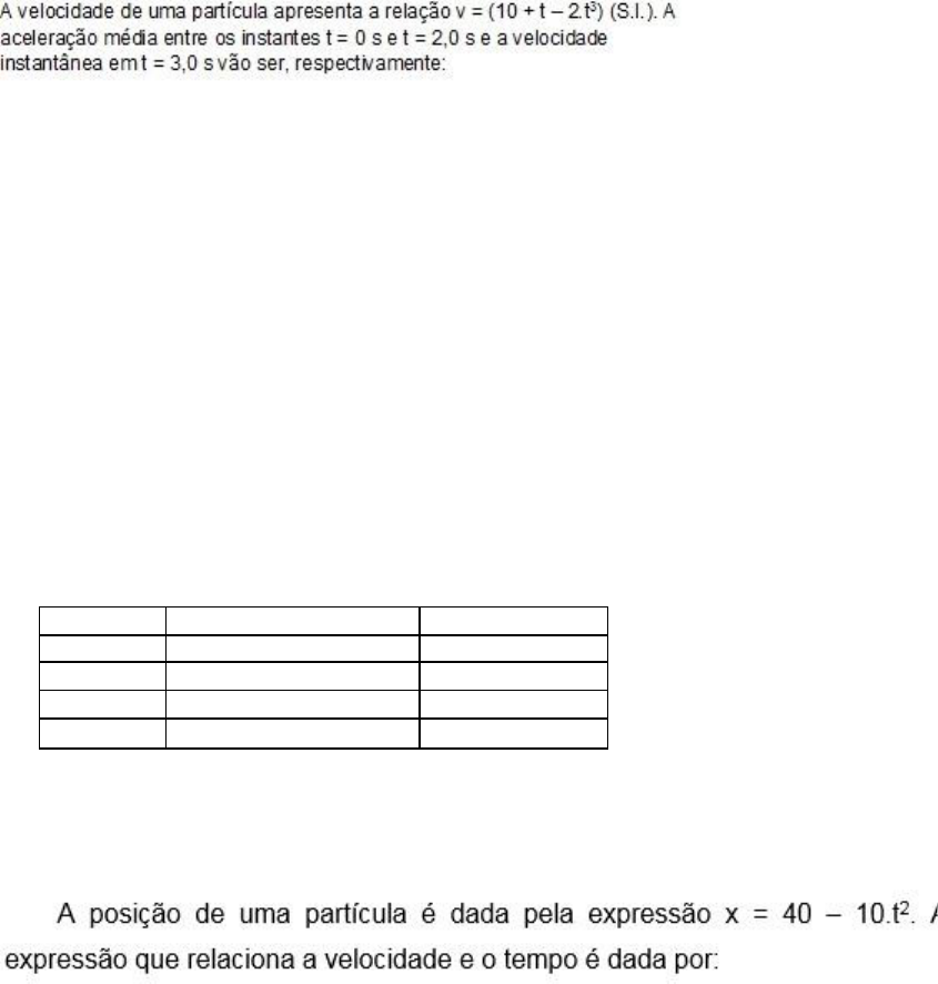 Pergunta 1 0,15 em 0,15 pontos Resposta Selecionada: e. -7 m/s2 e -41 m/s Pergunta 2 0,15 em 0,15 pontos A distância que a luz percorre em 1 minuto é de aproximadamente (em metros): Resposta Selecionada: c. 1,8 x 1010 m Pergunta 3 0 em 0,15 pontos A tabela abaixo fornece a posição e o correspondente tempo para o movimento de um carro em uma autoestrada. O deslocamento em quilômetros e a velocidade média vetorial em km/min entre as posições C e D são, respectivamente: Posição Quilometragem (km) Tempo (min) A 20 30 B 44,5 60 C 104,5 90 D 64,5 120 Resposta Selecionada: e. -40 e 1,333 Pergunta 4 0,15 em 0,15 pontos Resposta Selecionada: b. -20 t
