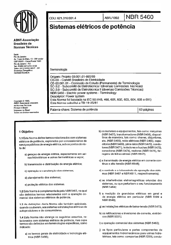 C6pia impressa pelo Sistema CENWIN ABNT-Assock@ Brasileira de Normas Thcnicas CDU: 621.316:001.4 ABWl992 ( NBR 5460 Sistemas elktricos de potbcia Terminologia Origem: Projeto 03:OOl .Ol -065/89 CB-03 - Comite Brasileiro de Eletdcidade CE-03:OOi .Ol - Comissao de Estudo (Penanente) de Tenninologia SC-3:2 Subcomite de Eletrotecnica I (diversas Comissoes Tecnicas) SC-3:9 - Subcomite de Eletrotecnica II (diversas Comiss&?s Tecnicas) NBR 5460 - Electric power systems -Terminology Descriptor: Power system Esta Normafoi baseada na IEC 50 (448,466.601,602.603,604,605 e 691) Esta Norma substitui a TB-19.25/81 Palavra-chave: Sistema de potencia 63 paginas 1 Objetivo 1.1 Esta Norma define termos relacionados corn SiStemaS &triCcs de pct&ncia, explorados per concession~rios de serv@Cs pljblicos de energia el&ica. sobos pontos de vis- ta de: a) gem@ de energia el8iMca. especialmente em Usi- “as hidrelk+Acas e Usinas termel&iCaS a vapor; b) tra”smissZo e distribui@o de energia el8trica; b) OS materiais e equipamentos, tais come: miquinas (NBR 5457). transformadores (NBR 5458), disposi- tivos de manobra, tais coma: chaws, disjuntores, etc. (NBR 5459). r&s ektricos (NBR 5465), capa- citores (NBR 5469), para-raios (NBR 5470), condu- tows (NBR5471). isoladores e buchas (NBR 5472). conectores (NBR 5474), r&ores (NBR 5475). fer- ragens de linhas a&eas (NBR 6547); c) a transmisskx de energia &trica em corrente con- tfnua e alta-tensHo (NBR 6548); C) opera$Ho e manuten$%o dos sistemas; d) planejamento dos sistemas; e) prote@ &trica dos sistemas. d) C controle e C telecontrole da opera~?.c dos siste- mas (NBR 5467 e NBR 6511, respectivamente); e) as interferEncias eletromagn~ticas oriundas dcs sistemas, Cu que perturbam C SW funcionamento (NBR 5464): 1.2 Esta Norma 6 complementada pela NBR 5463, na qua1 s50 definidos termcas relacionados corn a opera$Zo cc- mercial dos sistemas eWicos de pot~ncia. 0 a medip% de grandezas elktricas em geral e de energia ektrica em particular (NBR 6509 e NBR 6546); 1.3 As defini+s desta Nomla Go tambgm aplic&veis, quando couberem, aas sistemas e instala$Bes ektricas de autoprodutores e de consumidores. 1.4 Esta Norma “so abrange OS seguintes assuntos. re- lacionadcs corn sistemas &tricos de pot&cia, mas cujos termcs s?io definidos em terminologias especificas. wmc indicado: g) as instala@es el&ricas de b&a-ten?& (NBR 5473); h) OS retificadores e inversores de corrente, eletrbni- cos (NBR 9331): i) a opera@ ccmercial dos sistemas (NBR 5463); a) OS termos gerais de eletricidade e tecnologia elC- trica (NBR 5456); j) OS tipCs PWtiCUlXeS e par&s componentes de equipamentos hidromecinicos para usinas hidre- l&icas. tais ccmc: comportas (NBR 7259). condu- C6pia impressa pelo Sistema CENWIN 2 NBR 546011992 toes for$ados (NBR 6112). grades de tomada d’dgua(NBR7880),turblnashidr&ulicas(NBR6445) e v~lvulas hidraulicas (NBR 10133): k) a confiabilidade da opera$go e do servi$o presta- do pelos sistemas el&icos que sso definidos, sob urn ponto de vista geral. na NBR 5462. 1.6 As defini@ss d&a Norma correspondem, mas nso necessariamente, a termos detinidos no Vocabulario Ele- trot&znico Intemacional, nas publica@es IEC 50(448). 50(466), 50(601), 50(602). 50(603). 50(604). SO(605) e 50(691). Essa correspond&v%. quando existe, B indica- da pelo nljmero IEC de refer&ncia. colocado no fim doter- mo, entre p&nteses, o que n% implica necessariamen- te mera tradu@o do termo IEC. 2 Documentos complementeres Na aplica@o desta Norma B necess$rio consultar: NBR 5456 - Eletricidade geral - Terminologia NBR 5457 Maquinas elltricas girantes Termino- logia NBR 5458 - Transformadores de poten& - Termi- nologia NBR 5459 Manobra e prote$?zo de circuitos Terminologia NBR 5462 - Confiabilidade - Tetminologia NBR 5463 Tarifas e mercado de energia el&rica - Terminologia NBR 5464 - lnterf&ncias eletromagn&icas - Termi- nologia NBR 5465 - R&s elCtricos Terminologia NBR 5467 - Controles el&ricos - Terminologia NBR 5469 - Capacitores - Terminologia NBR 5470 P&a-raios de resistor n&o-linear - Ter- minologia NBR 5471 - Condutores el&icos Terminologia NBR 5472 - lsoladores e buchas psra eletrot&xica Terminologia NBR 5473 Instala@es elCtricas prediais Termino- logia NBR 5474 - Conectores elBtricos - Terminologia NBR 5475 Restores eletricos de pot&n& Termi- nologia NBR 6112 - Condutos forqados - Terminologia NBR 6445 - Turbinas hidrUicas, turbinas-bombas e bombas de acumulac%a - Terminologia NBR 6509 lnstiumentos el&icos e eletrdnicos de medicHo - Terminologia NBR 6511 - Telecontrole Terminologia NBR 6546 - Transformadores para instrumentos - Temlinologia NBR 6547 - Ferragens de linhas aClreas - Termino- logia NBR 6548 - Transmiss&z de energia el&rica em corrente continua e alta-tens% - Terminologia NBR 7259 - Comportas hidraulicas - Terminologia NBR 7880 - Grades de tomada d%gua para instala- @es hidraulicas Terminologia NBR 9331 - Eletrdnica de pot&w% Terminologia NBR 10133 - VBlvulas hidrAulicas de grande pate - Terminologia IEC 50(448) - Power system protection IEC 50(466) -Overhead lines IEC 50(601) -Generation, transmission and distribu- tion of electricity -General IEC 50(602) - Generation, transmission and disbibu- tion of elecbicity Generation IEC 50(603) - Generation. transmission and distribu- tion of electricity Power system planning and management IEC 50(604) - Generation, transmission and distribu- tion of electricity -Operation IEC 50(605) Generation, transmission and distribu- tion of electricity - Substations IEC 50(691) -Tariffs for electricity 3 Defini@es Para os efeitos data Norma sHo adotadas as definiqbes de 3.1 a 3.635. a) que cada ten-no 8 definido de acordo corn a sua aplica- +o no camp delimitado pelo termo ger~4 em q”e esta contido. quando for o case, e no campo mais amplo definidoem 1.1; b) q”e “ma palavra o” excess% entre p&nteses no tlfu- lo de urn termo, indicando “ma restri@o ou parti- cularidade de emprego dale. pod& ser omitida numa detetminada aplica@o: c) que 0 termo 
