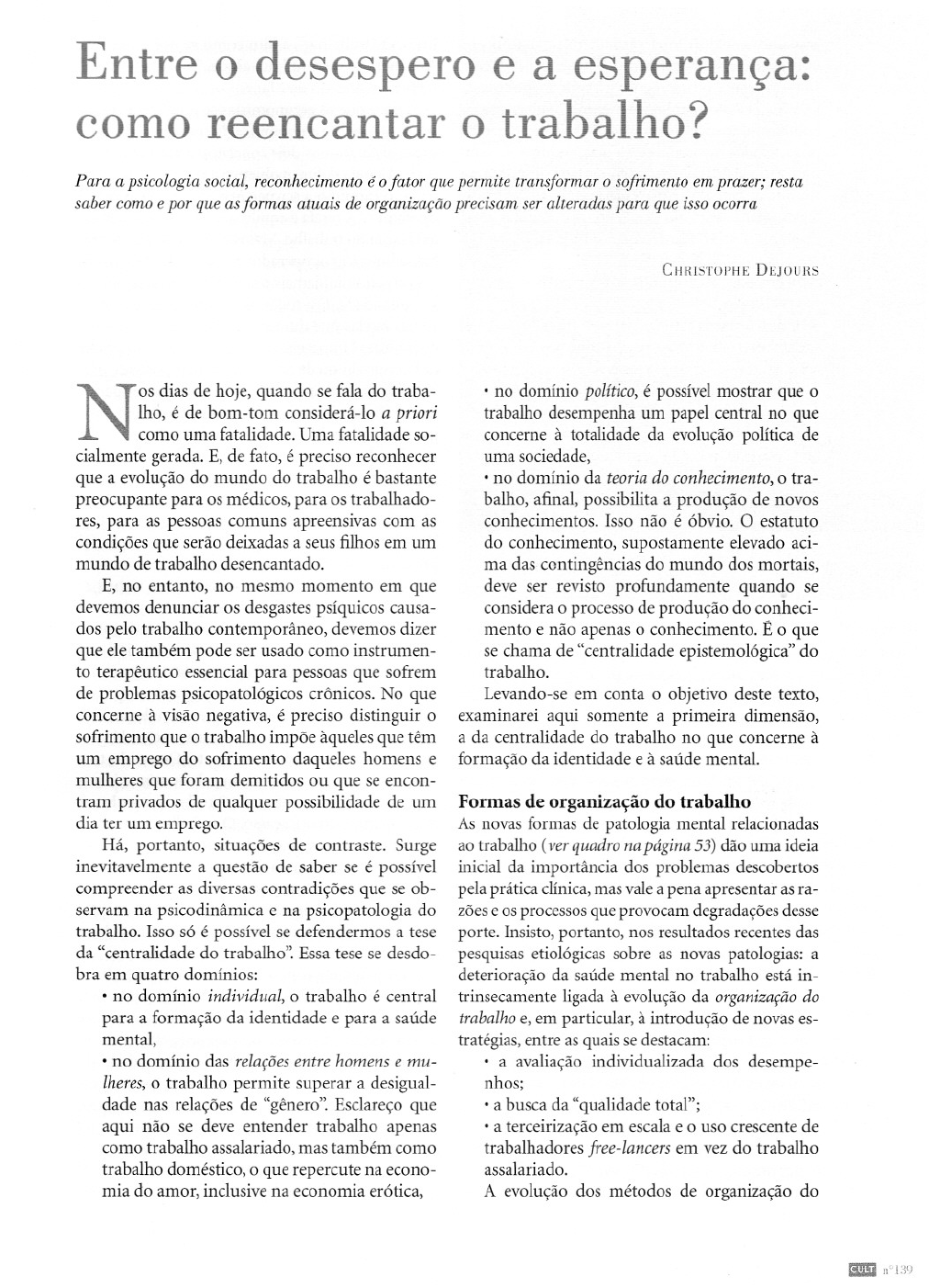 Entreo desesperoe a esperança: comoreencantaro trabalho? Para apsicologiasocial,reconhecimentoéofatorquepermitetransformaro sofrimentoemprazer;resta sabercomoeporqueasformasatuaisdeorganizaçãoprecisamseralteradasparaqueissoocorra C I-IRISTOPHE DEJOURS Nosdiasdehoje,quandosefalado traba-lho, é debom-tomconsiderá-Ioa prioricomoumafatalidade.Umafatalidadeso- cialmentegerada.E, defato,éprecisoreconhecer quea evoluçãodo mundodo trabalhoébastante preocupanteparaosmédicos,paraostrabalhado- res,paraaspessoascomunsapreenSIvascom as condiçõesqueserãodeixadasaseusfilhosemum mundodetrabalhodesencantado. E, no entanto,no mesmomomentoem que devemosdenunciarosdesgastespsíquicoscausa- dospelotrabalhocontemporâneo,devemosdizer queeletambémpodeserusadocomoinstrumen- to terapêuticoessencialparapessoasquesofrem deproblemaspsicopatológicoscrônicos.No que concerneà visãonegativa,é precisodistinguiro sofrimentoqueo trabalhoimpõeàquelesquetêm um empregodo sofrimentodaqueleshomense mulheresqueforamdemitidosou queseencon- tram privadosde qualquerpossibilidadede um diaterum emprego. Há, portanto,situaçõesde contraste.Surge inevitavelmentea questãode saberseé possível compreenderasdiversascontradiçõesqueseob- servamna psicodinâmicae napsicopatologiado trabalho.Issosóépossívelsedefendermosatese da"centralidadedotrabalho".Essatesesedesdo- braemquatrodomínios: •no domínio individual, o trabalhoé central paraaformaçãoda identidadee paraa saúde mental, •no domíniodasrelaçõesentrehomensemu- lheres,o trabalhopermitesuperara desigual- dadenas relaçõesde "gênero".Esclareçoque aqui não se deveentendertrabalhoapenas comotrabalhoassalariado,mastambémcomo trabalhodoméstico,o querepercutenaecono- miadoamor,inclusivenaeconomiaerótica, •no domíniopolítico,é possívelmostrarqueo trabalhodesempenhaum papelcentralno que concerneà totalidadeda evoluçãopolíticade umasociedade, •nodomíniodateoriado conhecimento,o tra- balho,afinal,possibilitaaproduçãodenovos conhecimentos.Isso não é óbvio.O estatuto do conhecimento,supostamenteelevadoaci- madascontingênciasdo mundodosmortais, deveser revistoprofundamentequando se considerao processodeproduçãodoconheci- mentoenãoapenaso conhecimento.É o que sechamade"centralidadeepistemológica"do trabalho. Levando-seem contao objetivodestetexto, examinareiaqui somentea primeiradimensão, a da centralidadedo trabalhono queconcerneà formaçãodaidentidadeeàsaúdemental. Formasdeorganizaçãodotrabalho As novasformasdepatologiamentalrelacionadas aotrabalho(verquadronapágina53)dãoumaideia inicialda importânciadosproblemasdescobertos pelapráticaclínica,masvaleapenaapresentarasra- zõeseosprocessosqueprovocamdegradaçõesdesse porte.Insisto,portanto,nosresultadosrecentesdas pesquisasetiológicassobreasnovaspatologias:a deterioraçãodasaúdementalno trabalhoestáin- trinsecamenteligadaà evoluçãoda organizaçãodo trabalhoe,emparticular,à introduçãodenovases- tratégias,entreasquaissedestacam: • a avaliaçãoindividualizadados desempe- nhos; •abuscada"qualidadetotal"; •aterceirizaçãoemescalaeo usocrescentede trabalhadoresfree-Iancersemvezdo trabalho assalariado. A evoluçãodos métodosde organizaçãodo Dossiê QCH (.:o SE'iTIDO DO TR~B,HHO'? trabalho constitui uma verdadeira revolução que aumenta consideravelmentea pressãoprodutiva, por um lado, e o isolamento e a solidão,por outro. O aumento daspatologiasmentais ligadas ao tra- balho resultaessencialmentedafragilizaçãogerada por métodos deorganizaçãoque, no lugar da con- fiança,da lealdadee da solidariedade,instalam no mundo do trabalho o cadaum por si,adeslealdade, a desestruturaçãodo convívio, produzindo uma implacável solidão em meio à multidão. Aquémdapatologia,o sofrimento no trabalho Sehoje é possívelestudaros sintomas dapatologia mental no trabalho, como, ao contrário, definir as condições que seriam favoráveisà saúdemental? Para responder a essaquestão,precisamosen- trar na própria materialidade do trabalho, isto é, observar os gestosespecíficos,as ideias, os afetos que constituem o que designamoscomo "o traba- 'lhar".O "trabalhar", assim como se diz "o comer", "o beber","o dormir" ou, ainda, "o trabalho vivo", na bela expressãode Marx. Desdequeos ergonomistasseprestaramao que sechamaanáliseergonômicado trabalhoe da ativi- dade,distinguimosdois conceitos:a tarefae a ativi- dade.A tarefadefineo objetivoa seratingido,assim como o caminho a serpercorrido, ou seja,o modo operatório.A tarefaé aquilo queéprescritopelaor- ganizaçãodo trabalho.Mas estáprovadoqueostra- balhadores(ou os operadores,como sãodesignados pelaergonomia)jamais respeitamasprescriçõesem sua totalidade.Em todas as circunstâncias,inclusi- ve nas tarefasqueduram menos de um minuto, os operadores"trapaceiam",Não somentepelo prazer detransgredirou dedesobedecer,masporque épre- ciso lidar com asanomalias,os incidentes,aspanes, os defeitos,os imprevistosque inevitavelmentesur- gemparaatrapalharo funcionamentodaprodução. O operador trapaceiapara tentar fazer o melhor possível,no tempomaiscurto possível. I)m::\ç\~DO TIL\B\ LllO CO\TE\II'OIl\\EO Para ChristopheDejours,"o trabalhonãocausao sofrimento;é o<;efrimentoqueproduzotrabalho",Noentanto,"aatualorganização aotrabalhonãoexplorao sofrimentoemsi,masosmecanismosdede- fesautillLódoscontraessesofrimento",Asformasatuaisdaorganização do t,abalOosellamdiretamenteresponsáveis,portanto,pelOaumento dealgulna'>patologiascorporaise mentaiscontemporãneas,Podemos classificà-Iassumariamenteemquatrocategorias: ~ Patologiasde sobrecarga,lesõesporesforçorepetitivo,em particulara burn-out syndrom,o karoshi,distúrbiosmusculares e 65quEieticos, ~ Pôtologlasrelacionadasa agressõesdequesãovítimasfun- rj,lnáli05do setorde serviçosna execuçãode tarefascotidi- anas("gressõesde usuários,clientes,alunosde escolasetc,), Atlngendesdecaixasdesupermercadoe operadoresdetele- I'narket'llga funcionário