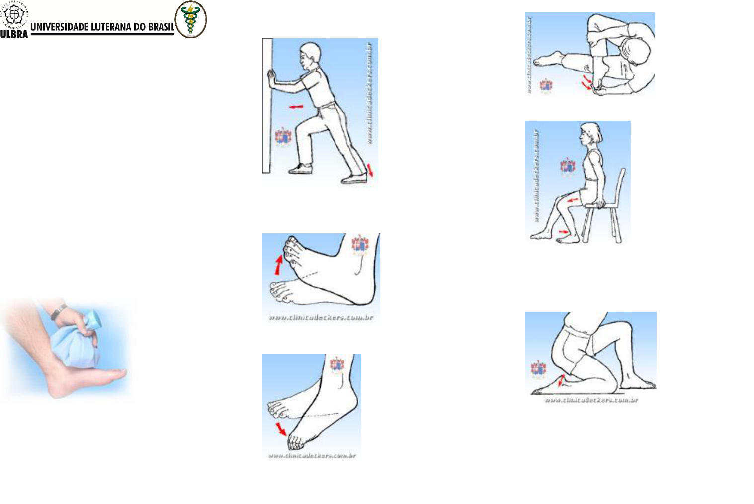 Prezado (a) Paciente, Essa cartilha foi elaborada especialmente para você. Aqui você vai encontrar orientações sobre exercícios simples com o objetivo de alongar e fortalecer os músculos. É muito importante para nós que você tenha recebido todas as informações necessárias para sua reabilitação. Não se esqueça de perguntar e esclarecer suas dúvidas com os seus fisioterapeutas. Lembrando que a associação do gelo, a elevação do pé acometido é eficaz na drenagem do inchaço e alívio da dor. Exercícios Terapêuticos – Tornozelo Exercício 1 1. Posicione-se contra uma parede com um pé para trás como mostrado; 2. Aponte os dedos para a frente e o tornozelo apoiado no piso; 3. Apóie-se na parede até sentir alongar; 4. Mantenha por 5 segundos; 5. Repita 10 vezes, 1 ou 2 vezes ao dia; Exercício 2 1. Dobre o tornozelo para cima tanto quanto possível; 2. Mantenha por 5 segundos; 3. Repita 10 vezes, 1 ou 2 vezes ao dia; Exercício 3 1. Dobre o tornozelo para baixo tanto quanto possível; 2. Mantenha por 5 segundos; 3. Repita 10 vezes, 1 ou 2 vezes ao dia. Exercício 4 1. Sente-se como mostrado, puxando os dedos do pé até alongar; 2. Mantenha por 5 segundos; 3. Repita 10 vezes, 1ou2 vezes ao dia; Exercício 5 1. Sente-se ereto na beirada de uma cadeira, com um pé mais próximo dela; 2. Mantenha o pé apoiado totalmente no piso; 3. Mova esse pé com o joelho para a frente e para trás até alongar, mantendo-o em cada posição por 5 segundos; 4. Repita 10 vezes, 1 ou 2 vezes ao dia; Exercício 6 1. Ajoelhe-se sobre uma perna, com o dedão apontado para trás, como mostrado; 2. Deixe o peso de corpo cair gradualmente até sentir alongar; 3. Mantenha por 5 segundos; 4. Repita 10 vezes, 1 ou 2 vezes ao dia; 5. Repita com o outro pé; Exercício 7 1. Apóie a frente dos pés sobre um livro ou bloco, de modo que os tornozelos não toquem o chão (altura do livro ou bloco deve ser indicada pelo fisioterapeuta); 2. Apóie as mãos sobre algo sólido, como a cadeira mostrada ou parede; 3. Deixe seu corpo descer até sentir alongar; 4. Mantenha por 5 segundos; 5. Repita 10 vezes, 1 ou 2 vezes ao dia; Exercício 8 1. Apóie a frente de um pé sobre um livro ou bloco, de modo que o tornozelo não toque o chão (altura do livro ou bloco deve ser indicada pelo fisioterapeuta); 2. Apóie as mãos sobre algo sólido, como a cadeira mostrada ou parede; 3. Deixe seu corpo descer até sentir alongar; 4. Mantenha por 5 segundos; 5. Repita 10 vezes, 1 ou 2 vezes ao dia; 6. Repita com o outro pé; Exercício 9 1. Sente-se com a perna cruzada e agarre o pé como mostrado; 2. Com a mão, vire o pé todo para cima até alongar; 3. Mantenha por 5 segundos; 4. Com a mão, vire o pé todo para baixo até alongar; 5. Mantenha por 5 segundos; 6. Repita 10 vezes, 1 ou 2 vezes ao dia; Exercício 10 1. Ajoelhe-se sobre uma perna, como mostrado, com o outro p é bem apoiado no chão; 2. Incline-se à frente até sentir alongar; 3. Mantenha por 5 segundos; 4. Repita 10 vezes, 1 ou 2 vezes ao dia; Exercício 11 1. Ajoelhe-se sobre uma perna como mostrado, apoiando-se sobre o joelho e dedos do pé dobrados; 2. Apóie gradualmente o peso do corpo sobre a perna dobrada até alongar; 3. Mantenha por 5 segundos; 4. Repita 10 vezes, 1 ou 2 vezes ao dia; Exercício 12 1. Posicione seu corpo à distância de um braço da parede como mostrado; 2. Aponte os pés para a frente e apóie os calcanhares no chão; 3. Incline-se para a parede até alongar; 4. Mantenha por 5 segundos; 5. Repita 10 vezes, 1 ou 2 vezes ao dia; Exercício 13 1. Sente-se no chão com uma toalha ou faixa ao redor do pé como mostrado; 2. Puxe a ponta do pé para seu corpo até alongar; 3. Mantenha por 5 segundos; 4. Repita 10 vezes, 1 ou 2 vezes ao dia; Exercício 14 1. Sente-se com as solas dos pés voltadas para dentro, como mostrado; 2. Procure juntar os joelhos e empurre para baixo até sentir alongar; 3. Mantenha por 5 segundos; 4. Repita 10 vezes, 1 ou 2 vezes ao dia; Exercício 15 1. Sente-se com os joelhos juntos e as solas dos pés para fora, como mostrado; 2. Empurre para dentro e para baixo até sentir alongar; 3. Mantenha por 5 segundos; 4. Repita 10 vezes, 1 ou 2 vezes ao dia; Exercício 16 1. Caminhe sobre os calcanhares com os dedos do pé levantados. (Segure-se numa parede se necessário); 2. Repita 10 vezes, 1 ou 2 vezes ao dia; Exercício 17 1. Dobre o tornozelo para cima tanto quanto possível e mantenha por 5 segundos; 2. Depois, dobre o tornozelo para baixo tanto quanto possível e mantenha por 5 segundos; 3. Repita 10 vezes, 1 ou 2 vezes ao dia; Exercício 18 1. Mova seu tornozelo lentamente num grande círculo; 2. Repita na direção oposta; 3. Repita 10 vezes, 1 ou 2 vezes ao dia; Exercício 19 1. Comece com o p é apoiado no chão como mostrado; 2. Mantendo o calcanhar no chão, dobre a toalha repetidamente (1 dobra = 1 repetição); 3. Repita 10 vezes, 1 ou 2 vezes ao dia; Exercício 20 1. Sente-se em uma cadeira com os pés apoiados no chão e mãos sobre o joelho; 2. Empurre os dedos do pé para baixo para levantar o calcanhar, ao mesmo tempo que força seu corpo para a frente, aumentando a resistência; 3. Mantenha por 5 segundos; 4. Repita 10 vezes, 1 ou 2 vezes ao dia; Atenciosamente dos academicos de Fisioterapia Clarissa Bicca e Guilherme Costa sob a supervisão da professora Ludmila Campos.