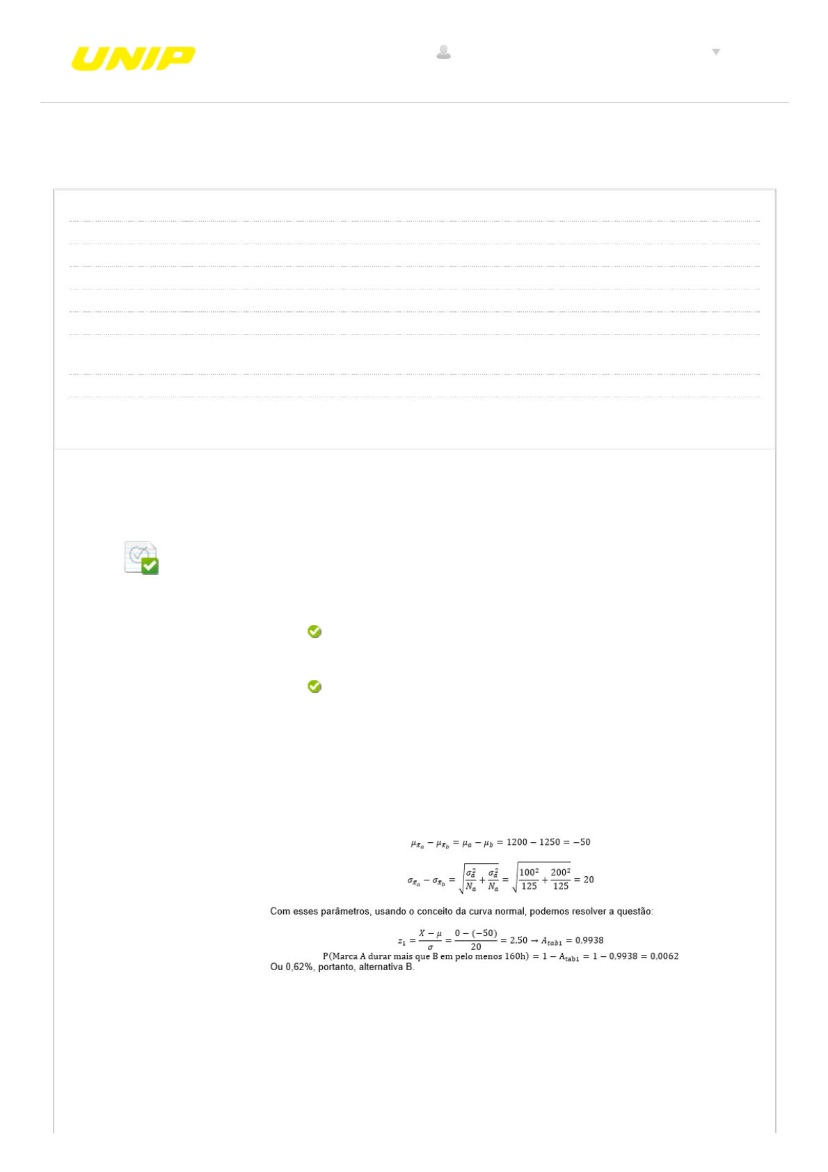 21/09/2018 Revisar envio do teste: QUESTIONÁRIO UNIDADE II – 5390-... https://ava.ead.unip.br/webapps/assessment/review/review.jsp?attempt_id=_8102359_1&course_id=_24142_1&content_id=_377783_1&return_c… 1/8 Revisar envio do teste: QUESTIONÁRIO UNIDADE II ESTATÍSTICA APLICADA 5390-40_59101_R_20182 CONTEÚDO Usuário simone.santos43 @unipinterativa.edu.br Curso ESTATÍSTICA APLICADA Teste QUESTIONÁRIO UNIDADE II Iniciado 21/09/18 09:06 Enviado 21/09/18 09:10 Status Completada Resultado da tentativa 5 em 5 pontos Tempo decorrido 3 minutos Resultados exibidos Todas as respostas, Respostas enviadas, Respostas corretas, Comentários, Perguntas respondidas incorretamente Pergunta 1 Resposta Selecionada: b. Respostas: a. b. c. d. e. Feedback da resposta: As lâmpadas elétricas do fabricante A duram em média 1200 horas, com desvio padrão de 100 horas. As do fabricante B duram em média 1250 horas com desvio padrão de 200 horas. Se forem ensaiadas 125 lâmpadas de cada marca, qual será a probabilidade de que as da marca A tenham vida média maior do que as da marca B? 0,62% 6,2% 0,62% 99,38% 9,38% 62,8% Resposta: B Comentário: A distribuição de probabilidades da diferença entre estas amostras é dada pelos parâmetros: Pergunta 2 CONTEÚDOS ACADÊMICOS BIBLIOTECAS MURAL DO ALUNO TUTORIAISUNIP EAD 0,5 em 0,5 pontos 0,5 em 0,5 pontos simone.santos43 @unipinterativa.edu.br 21/09/2018 Revisar envio do teste: QUESTIONÁRIO UNIDADE II – 5390-... https://ava.ead.unip.br/webapps/assessment/review/review.jsp?attempt_id=_8102359_1&course_id=_24142_1&content_id=_377783_1&return_c… 2/8 Resposta Selecionada: a. Respostas: a. b. c. d. e. Feedback da resposta: Desejamos estimar a vida útil de determinado tipo de lâmpada eletrônica. Para tanto, coletamos uma amostra de 64 lâmpadas escolhidas aleatoriamente. Essas lâmpadas foram testadas e revelaram uma vida média de 6000 horas, com um desvio padrão de 350 horas. Baseados nestes dados, fazer a estimação, com 95% de con�abilidade. 6000 ± 85,75 horas 6000 ± 85,75 horas 6000 ± 175 horas 6000 ± 43,75 horas 6000 ± 87 horas 6000 ± 162,3 horas Resposta: A Comentário: Essas amostras de 64 lâmpadas são parametrizadas pelos valores amostrais abaixo: Pergunta 3 Resposta Selecionada: a. Respostas: a. b. c. d. e. Feedback da resposta: Determinados aparelhos eletrônicos fabricado por uma empresa têm vida média de 19500 horas e desvio padrão de 8560 horas. Determinar a probabilidade de uma amostra aleatória de 64 aparelhos retirados da produção ter uma vida média entre 18000 e 20000 horas 60% 60% 50% 40% 35% 55% Resposta: A Comentário: O cálculo das probabilidades envolvendo uma amostra é feito a partir de uma curva normal, cuja média é a média amostral e o desvio padrão é 0,5 em 0,5 pontos 21/09/2018 Revisar envio do teste: QUESTIONÁRIO UNIDADE II – 5390-... https://ava.ead.unip.br/webapps/assessment/review/review.jsp?attempt_id=_8102359_1&course_id=_24142_1&content_id=_377783_1&return_c… 3/8 o desvio amostral, ou seja, nesse caso: Pergunta 4 Resposta Selecionada: d. Respostas: a. b. c. d. e. Feedback da resposta: Em uma escola, o professor fez uma pesquisa contando com a participação de cinco alunos. Nesta pesquisa foram feitas duas indagações: • Quantas horas você estudou para a prova de estatística, e • Qual foi sua nota na prova de estatística? Os resultados estão listados a seguir: 0,976 -0,976 0,876 0,589 0,976 -0,876 Resposta: D Comentário: Para resolver este exercício, necessitamos montar o quadro 0,5 em 0,5 pontos 21/09/2018 Revisar envio do teste: QUESTIONÁRIO UNIDADE II – 5390-... https://ava.ead.unip.br/webapps/assessment/review/review.jsp?attempt_id=_8102359_1&course_id=_24142_1&content_id=_377783_1&return_c… 4/8 abaixo: Pergunta 5 Resposta Selecionada: b. Respostas: a. b. c. d. e. Feedback da resposta: Em uma escola, o professor fez uma pesquisa contando com a participação de cinco alunos. Nesta pesquisa, foram feitas duas indagações: •Quantas horas você estudou para a prova de estatística, e •Qual foi sua nota na prova de estatística? y*=1,80xi+2,40 ay*=1,80xi- 2,40 y*=1,80xi+2,40 y*=-1,80xi+2,40 y*=-1,80xi - 2,40 y*=2,40xi+1,80 Resposta: B Comentário: Para calcularmos este exercício, necessitamos montar o quadro abaixo: 0,5 em 0,5 pontos 21/09/2018 Revisar envio do teste: QUESTIONÁRIO UNIDADE II – 5390-... https://ava.ead.unip.br/webapps/assessment/review/review.jsp?attempt_id=_8102359_1&course_id=_24142_1&content_id=_377783_1&return_c… 5/8 Pergunta 6 Resposta Selecionada: d. Respostas: a. b. c. d. e. Feedback da resposta: Foram examinadas duas amostras de um determinado produto comercializado em dois diferentes supermercados. No supermercado A, 2% dos produtos apresentavam defeitos, enquanto no supermercado B, o índice de defeitos era de 1,5%. Considerando que as amostras eram de 180 unidades, determinar a probabilidade da amostra A indicar uma diferença de mais de 5% de defeitos no supermercado A em relação ao supermercado B. 0,03% 31,6% 36,84% 0,31% 0,03% 37,85% Resposta: D Comentário: A distribuição de probabilidades da diferença entre estas 0,5 em 0,5 pontos 21/09/2018 Revisar envio do teste: QUESTIONÁRIO UNIDADE II – 5390-... https://ava.ead.unip.br/webapps/assessment/review/review.jsp?attempt_id=_8102359_1&course_id=_24142_1&content_id=_377783_1&return_c… 6/8 amostras é dada pelos parâmetros: Pergunta 7 Resposta Selecionada: a. Respostas: a. b. c. d. e. Feedback da resposta: O peso dos fardos recebidos por um determinado depósito tem uma média de 150kg e um desvio padrão de 25kg. Qual é a probabilidade de 25 fardos, recebidos ao acaso e carregados em um elevador, excederem o limite especi�co de segurança do elevador, que é de 4100kg? 0,26% 0,26% 0,32% 26,0% 37,0% 0,55% Resposta: A RESOLUÇÃO: Estatisticamente, uma amostra de 25 fardos deste tipo comporta-se da seguinte maneira: Pergunta 8 O seu chefe precisa tomar uma decisão acerca 
