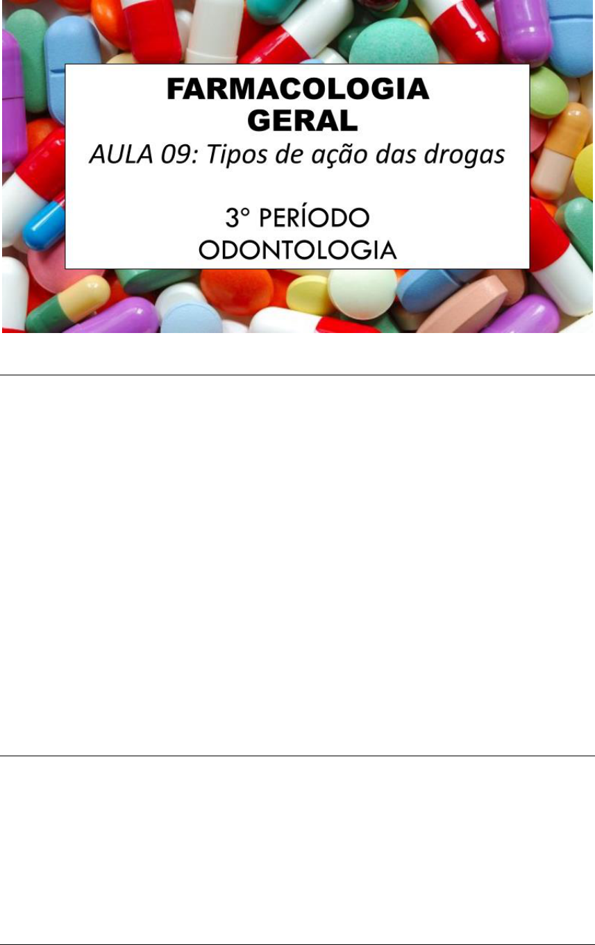 Vitor Marinho da Costa 1 Vitor Marinho da Costa Terça-feira 22/05/2018 1. TIPOS DE AÇÃO DAS DROGAS: • As drogas não criam novas funções no organismo, apenas modificam as funções preexistentes (terapia gênica, excreção) • AÇÃO DA DROGA: • Combinação da droga com o seu receptor. • Alteração conformacional do receptor (agonista) • Impedimento da alteração conformacional (antagonista). • EFEITO DA DROGA: • Alteração final da função biológica. • O efeito de uma droga pode ser entendido pelo que essa droga provoca no corpo, logo, é o seu objetivo, o que ela irá desenvolver. A ação da droga, por sua vez é COMO ELA CHEGARÁ até o seu efeito. • Se tratando da ação de uma droga, levamos em consideração a sua ligação com um dado receptor e seu comportamento, de forma agonista ou antagonista. A partir dessa ação a droga produz o efeito farmacológico. • EFEITO FARMACOLOGICO – É o que o fármaco faz. Vitor Marinho da Costa 2 Vitor Marinho da Costa 2. TIPOS DE AÇÃO DAS DROGAS: • Estimulação – As drogas aumentam a atividade das células especializadas. • Ex: Adrenalina estimula a secreção das glândulas salivares. • Depressão – Redução seletiva de atividade de células especializadas. • Ex: Barbitúricos deprimem o sistema nervoso central. • Irritação – Efeito não seletivo, que pode ser lesivo • Irritação moderada – Estimulação da secreção salivar e gástrica por medicamentos amargos. • Irritação forte – Inflamação, corrosão, necrose e lesão morfológica. • Reposição – Utilizam-se metabólitos naturais, hormônios. • Ex: Insulina no diabetes, ferro na anemia. • Ação citotóxica – Ação seletiva em parasitas invasores ou células canceroras. • Ex: Penicilina em bactérias • Estimulação é um tipo de ação da droga, no qual essa provoca algum tipo de estímulo. • Depressão é o oposto da estimulação, onde o fármaco de alguma forma deprime ou suprime uma via ou sinalização. • Irritação é um tipo de efeito da droga, que causa alguma lesão em um tecido saudável. A irritação pode se apresentar de forma moderada (quando não acontece nenhuma lesão ou prejuízo). Uma irritação forte (a lesão tecidual acontecerá). • Reposição é um tipo de efeito de uma droga que visa repor alguma substancia no organismo, como cátions, íons, hormônios e etc. • A ação citotóxica de uma droga é aquela desempenhada por um grupo de fármacos que tende destruir ou matar microrganismos ou parasitas. Interessantemente, entram nesse grupo os quimioterápicos, uma vez que procurar causar a morde de células neoplásicas ou cancerosas. • O que é anemia? A anemia é um distúrbio relacionado a redução de hemoglobina circulante. Vitor Marinho da Costa 3 Vitor Marinho da Costa 3. POTÊNCIA E EFICÁCIA DAS DROGAS: • Potência – Quantidade da droga para produzir determinado efeito. • 10 mg de morfina = 100 mg de petidina – morfina é 10x mais potente do que a petidina. • Eficácia – Resposta máxima que pode ser provocada pela droga. • A morfina produz um grau de analgesia que não se obtém com nenhuma dose de aspirina. • Potencia de uma droga pode ser entendida como a quantidade, que se usa para chegar a um determinado efeito. Quanto eu preciso de uma droga, para alcançar o efeito que ela é capaz de causar. A potência permite que sejam feitas comparações entre um fármaco e outro, sejam eles de uma mesma classe. • Diferentemente da potência, a eficácia de uma droga pode ser entendida como o efeito máximo de uma droga, isto é, o quanto de ação farmacológica será possível se obter. 4. POTÊNCIA E EFICÁCIA DAS DROGAS: • Para esse gráfico considere que a RESPOSTA esteja relacionada como o efeito e que a DOSE esteja relacionada com a POTÊNCIA. Vitor Marinho da Costa 4 Vitor Marinho da Costa 5. POTENCIA E EFICÁCIA DAS DROGAS: • Ter uma eficácia maior, significar ser uma droga melhor? Não, ter uma eficácia maior, significa dizer que uma dada droga apresenta um efeito farmacológico mais intenso. E em alguns casos, perigoso, visto que o aumento de pequenas doses da droga causa um aumento muito rápido do efeito desta droga. • Drogas que apresentam uma eficácia muito grande e que aumentam seu efeito de forma rápida com o aumento das doses, devem ser prescritas de forma mais cautelosa, levando em consideração características individuais de cada paciente, como o peso. Uma mesma dose não deve ser prescrita para toda a população, sendo então necessária uma DOSE INDIVIDUALIZADA. • Em gráficos com curvas achatadas, observamos um cenário mais tranquilo, onde percebemos a presença da DOSE PADRÃO, que pode ser ajustada entre um paciente e outro, mas que é uma dose padrão e é comum a maioria da população. 6. DOSE: • Quantidade adequada de uma droga que é necessária para produzir certo grau de resposta em determinado paciente. • A dose de uma droga deve ser determinada em função da resposta escolhida. • ASPIRINA: • Dose analgésica – 0,3 a 0,6 gramas • Dose anti-inflamatória – 3 a 6 gramas. Vitor Marinho da Costa 5 Vitor Marinho da Costa • IMPORTANTE: Dependendo da dose, um fármaco pode mudar de classe, porém isso não é tão comum de acontecer, como o que acontece na aspirina. 7. TIPOS DE DOSE: • Dose terapêutica. • Dose profilática – Dose que tem por finalidade evitar que uma doença ou sintoma apareça, como o que acontece quando uma gestante recebe sulfato ferroso durante a gravidez, na tentativa de evitar que ela desenvolva um quadro de anemia, visto que é isso é comum de acontecer. • Dose tóxica. • Dose padrão: • Apropriada para a maioria dos pacientes. • Variações individuais mínimas ou droga com elevada margem de segurança. • Não precisa de calculo para se chegar nela. 8. TIPOS DE DOSE: • Dose regulada: • A droga modifica uma função corpórea que é estritamente c