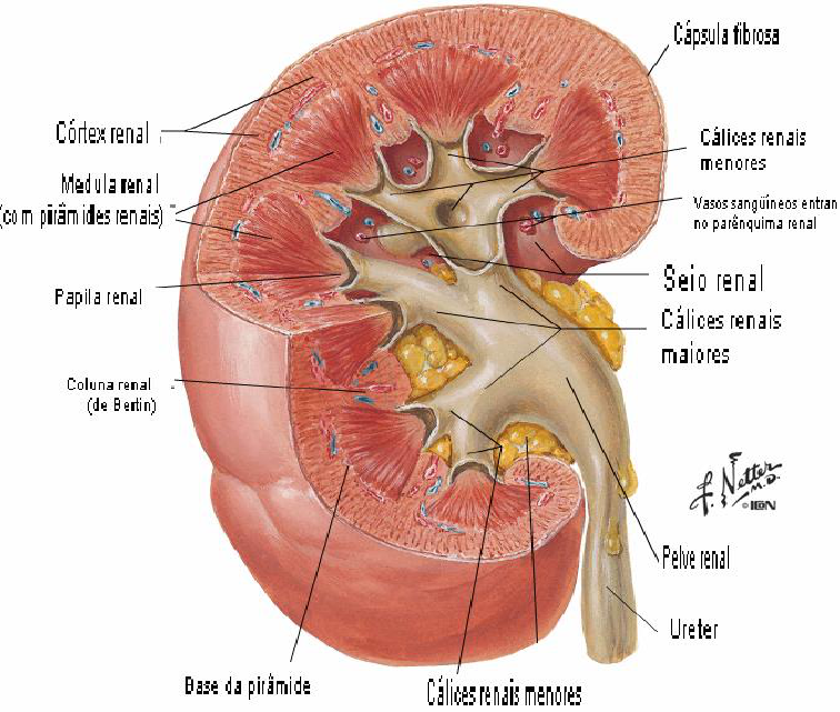 ANATOMIA HUMANA SISTEMA URINÁRIO SISTEMA URINÁRIO Os órgãos urinários compreendem os rins, que produzem a urina, os ureteres ou ductos, que transportam a urina para a bexiga, onde fica retida por algum tempo e a uretra, através da qual é expelida do corpo. RINS Os rins situam-se na parte dorsal do abdome, de um e de outro lado da coluna vertebral, recobertos pelo peritônio e circundados por uma massa de gordura e de tecido areolar frouxo. O rim esquerdo é mais comprido do que o direito, provavelmente por causa do fígado. Sua parte central apresenta uma profunda fissura longitudinal limitada por proeminentes saliências, esta fissura é denominada hilo, e dá passagem aos vasos, aos nervos e ao ureter. O rim é ricamente suprido por sangue da artéria renal, um grosso ramo da aorta abdominal. Três camadas de tecido envolvem cada rim. A camada profunda, a cápsula renal, camada intermediária, a cápsula adiposa, e a camada superficial, a fáscia renal. Estrutura externa do rim A margem medial côncava de cada rim olha a coluna vertebral. Próximo do centro da borda côncava, encontra-se uma fissura vertical profunda, chamada hilo renal. Estrutura interna do rim Corte frontal, através do rim, revela duas regiões distintas: uma área avermelhada, chamada córtex renal, e uma área marrom-avermelhada, denominada medula renal. A medula consiste em estruturas cuneiformes, as pirâmides renais. URETER São dois tubos que transportam a urina dos rins para a bexiga. A porção renal de cada um destes tubos começa no seio do rim correspondente com uma série de curtos tubos caliciformes denominados cálices. O ureter propriamente dito, cujo comprimento oscila entre 28 e 34 cm, sendo o direito cerca de 1 cm mais curto do que o esquerdo. Corre para baixo e medialmente sobre o músculo psoas maior e entretanto na cavidade pélvica abre-se afinal no fundo da bexiga. Na mulher, o ureter forma quando em relação cm a parede pélvica o limite posterior de uma depressão chamada fossa ovárica, na qual o ovário esta colocado. O ureter passa em media a 2 cm de distancia do colo uterino. BEXIGA URINÁRIA A bexiga é um órgão muscular oco, situado na cavidade pélvica, posterior à sínfise púbica. Nos homens, situa-se diretamente anterior ao reto; nas mulheres, está à frente da vagina e abaixo do útero. Três túnicas formam a parede da bexiga urinária. Envolvendo a túnica mucosa, está a túnica muscular intermediária, que consiste em três camadas de fibras musculares lisas: longitudinal interna, circular média e longitudinal externa. Sobre a face superior da bexiga fica a túnica serosa, uma camada do peritônio visceral. A superfície interna da bexiga pode ser observada in vivo por meio do cistoscópio. Quando vazia, ela parece enrugada e de cor amarelo pálida e são reconhecidos facilmente três orifícios: os óstios do ureter (direito e esquerdo) e o óstio interno da uretra. Estes orifícios limitam o trígono da bexiga, cuja superfície mucosa é lisa e plana. A mais profunda é a túnica mucosa, uma membrana composta de epitélio transicional e a lâmina própria subjacente, semelhante à dos ureteres. As rugas (pregas da túnica mucosa) também estão presentes. Na mulher a bexiga esta dorsalmente em relação com útero e a parte superior da vagina. Quando a bexiga esta vazia, o útero repousa sobre a sua superfície. URETRA Uretra Masculina: Estende-se do orifício uretral interno na bexiga urinaria até o orifício uretral externo na extremidade do pênis. É dividida em três porções: prostática, membranácea e a esponjosa. Porção Prostática: É o segmento mais largo e dilatável da uretra com cerca de 3 cm de comprimento, estende-se quase verticalmente através da próstata desde a base até o ápice deste órgão. Porção Membranácea: É a mais curta menos dilatável e com exceção do orifício externo a parte mais estreita do canal. Estende-se do ápice da próstata até o bulbo do pênis atravessa o diafragma urogenital a aproximadamente 2,5 cm abaixo da sínfise púbica. Esta é envolvida por fibras do esfíncter da uretra. Porção Esponjosa: È a porção mais longa da uretra e está contida no respectivo corpo esponjoso. Tem aproximadamente 15cm de comprimento e estende-se desde a terminação da porção membranácea até o orifício uretral externa. Uretra Feminina: É um canal membranoso estreito de cerca de 4cm comprimento estendendo-se da bexiga ao orifício externo no vestíbulo. A uretra feminina é constituída de três camadas: muscular, erétil e mucosa. Camada Muscular: Continua com a da bexiga estende-se por tôo o comprimento da uretra e consiste de fibras circulares. Camada erétil: Contém amplo plexo de grandes veias entremeadas com feixes de fibras musculares lisas, situada imediatamente abaixo da túnica mucosa. Túnica Mucosa: prolonga-se externamente com a da vulva e internamente com a bexiga.