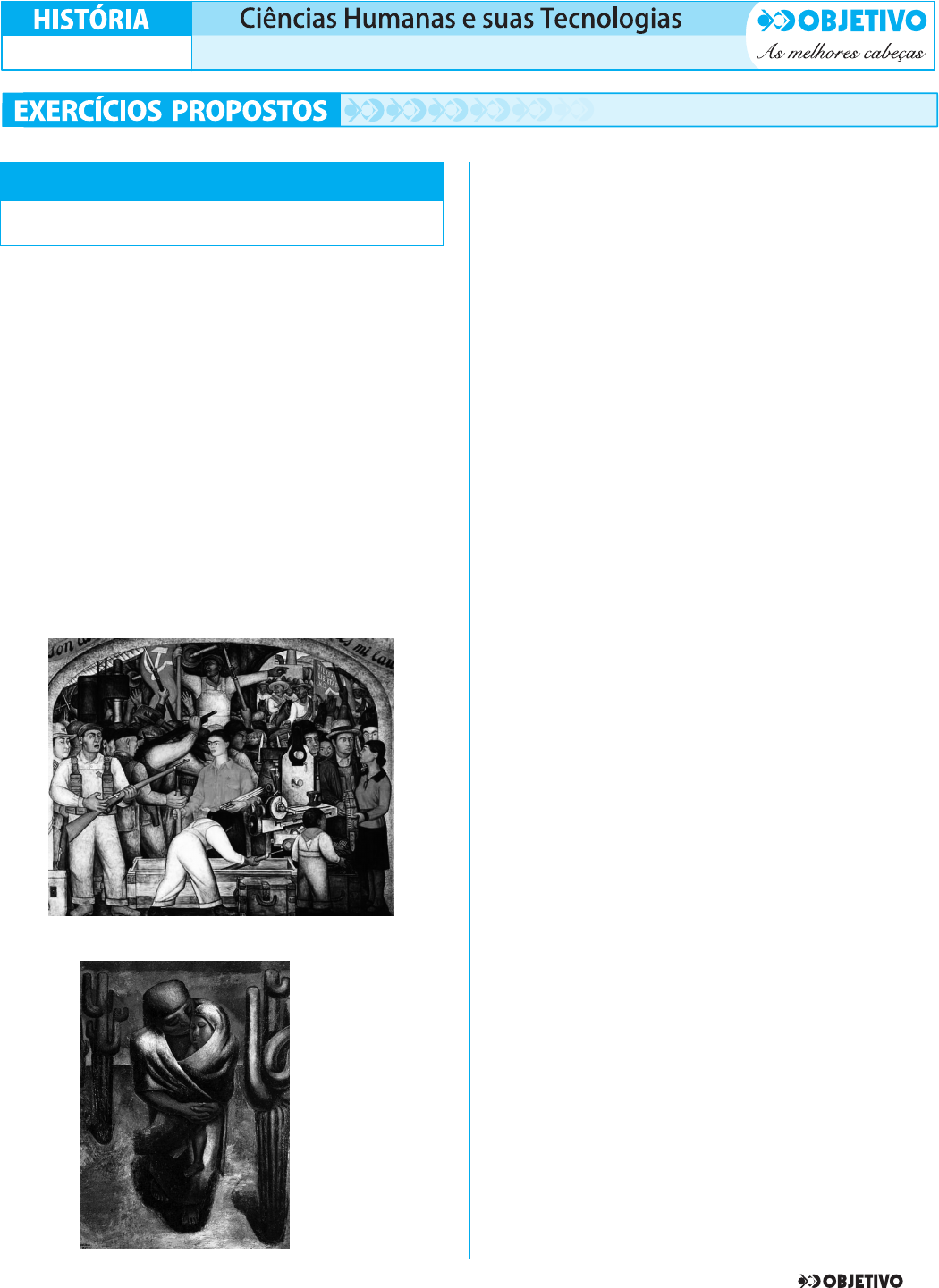 1. (UFSCAR) – “Estamos com aqueles que buscam a derrubada de um velho e desumano sistema, no qual você, trabalhador da terra, enquanto passa fome, produz riqueza para o capataz e o político; no qual você, trabalhador da cidade, move as rodas das indústrias, fabrica o tecido e cria com suas mãos o conforto moderno desfrutado pelos parasitas e prostitutas, enquanto seu próprio corpo está entorpecido de frio; no qual você, soldado índio, abandona heroicamente sua terra e dá sua vida na eterna esperança de libertar sua raça da degradação e miséria de séculos. Não só o trabalho nobre, como também as menores manifestações da vitalidade material ou espiritual de nossa raça, nascem do nosso meio nativo. Sua admirável, excepcional e peculiar capacidade de criar beleza – a arte do povo mexicano – é a maior e mais alta expressão espiritual da tradição mundial e constitui nossa mais valiosa herança. É grande porque surge do povo; é coletiva, pois nosso objetivo estético é socializar a expressão artística, destruir o individua lismo burguês.” (Manifesto do Sindicato de Trabalhadores Técnicos, Pintores e Escultores. Cidade do México, 1922.) O arsenal – Frida Kahlo distribuindo armas, de Diego Rivera, 1928. Mãe camponesa. de David Siqueiros, 1929. a) Quais ideias defendiam os autores do mani festo transcrito? b) Considerando que artistas como Diego Rivera e David Siqueiros subescreveram esse manifesto, cite uma carac terística das obras desses pintores que expressam a coerência entre a arte e o discurso político que defendiam. 2. (FGV) – Analise as proposições a seguir, relativas à Revolução Mexicana. I – Durante o longo governo de Porfirio Díaz (1876-1911), os recursos nacionais do sub solo foram entregues ao controle estrangeiro e a forte concentração fundiária permaneceu intocada. II – Após a renúncia de Porfirio Díaz, assumiu Fran cis co Madero que, com o apoio dos Estados Unidos, governou o México até o iní cio da década 1930. III – Pressionado pelas massas camponesas e operá rias, Francisco Madero estabeleceu uma re for ma agrária radical, que incluía o fim dos lati fún dios. IV – A institucionalização do processo revolu ci o nário teve como marco a promulgação, em 1917, de uma Carta Constitucional que preco nizava a nacionalização do solo e do subsolo. V – O assassinato de Emiliano Zapata, em 1919, evidenciou as fortes divergências ideo lógicas entre o líder camponês e o presi dente Venustiano Carranza. Assinale a alternativa correta. a) Somente as proposições I, II e IV são verdadeiras. b) Somente as proposições I, III e V são verdadeiras. c) Somente as proposições I, IV e V são verdadeiras. d) Somente as proposições II, III e IV são verdadeiras. e) Somente as proposições II, IV e V são verdadeiras. MÓDULO 37 REVOLUÇÃO MEXICANA RESOLUÇÃO: Destruição do sistema capitalista por meio de uma revolução armada, substituindo-o por um sistema socialista que enfatizaria os valores culturais mexi ca nos. RESOLUÇÃO: Diego Rivera e David Siqueiros, juntamente com Antonio Orozco, são os expoentes do “muralismo mexicano” — uma forma de expressão artística com forte cunho político-ideológico e social, unido a uma temática popular, nacionalista e revolucionária. – 1 FRENTE 1 – HISTÓRIA INTEGRADA C3_CONVENIO_3A_Exerc_13_His_Lis 29/09/12 08:37 Página 1 2 – 3. Em janeiro de 1994, teve início no estado mexicano de Chiapas uma rebelião organizada pela Frente Zapatista de Libertação Na cio - nal. Essa denominação evocava a figura de Emiliano Zapata, líder de uma revolução que, no início do século XX, parecia ser a única esperança para os camponeses do México Meridional. A revolta em ques tão eclodiu em 1910 e distinguiu-se de outras rebeliões latino- americanas porque a) não teve participação de militares. b) foi marcada pela ausência de lideranças caudilhescas. c) contou com forte participação do campesinato. d) apresentava uma orientação marcadamente socialista. e) foi liderada por intelectuais conservadores. 4. (FUVEST) O sangue dos mártires da Revolução fertilizando a terra. (Mural de Diego Rivera, 1927.) Neste mural, o pintor mexicano retratou a morte de Emiliano Zapata. Observando a pintura, é correto afirmar que Rivera a) foi uma rara exceção, na América Latina do século XX, pois artistas e escritores se recusavam a relacionar arte com problemas sociais e políticos. b) retratou um tema social especificamente mexicano, que não podia ser relacionado com a situação dos camponeses de outros países da América Latina. c) quis demonstrar que, apesar da derrota dos camponeses na Revolu - ção Mexicana, ainda permaneciam esperanças de mudanças sociais que os beneficiassem. d) utilizou o girassol e o milharal como símbolos religiosos cristãos, recorrentes nas lutas camponesas da América Latina ao longo do século XX. e) transformou-se numa figura única na história da arte da América Latina, ao abandonar a pintura de cavalete e fazer a opção pelo mural. 5. Entre 1929 e 2000, todos os presidentes mexicanos foram eleitos pelo mesmo partido: o atual Partido Revolucionário Ins ti tucional (PRI), fundado em 1929 como Partido Nacional Revolucionário (PNR) e rebatizado em 1938 com o nome de Partido da Revolução Mexicana (PRM). Entre 1934 e 1940, a presidência do México foi exercida por Lá zaro Cárdenas, general e prócer do PNR, agremiação que se apresentava como herdeira da Revo lu ção Mexicana. Cárdenas adotou uma medida que resgatava u ma antiga aspiração dos revolucionários, a saber: a) coletivização das terras cultiváveis. b) implantação do sufrágio universal. c) instauração do socialismo. d) restauração dos ejidos. e) recomposição do Estado oligárquico. 1. (UFRJ) – “A cidadania moderna — ou seja, a integração das pessoas no governo, via participação política; na sociedade, via direitos indivi