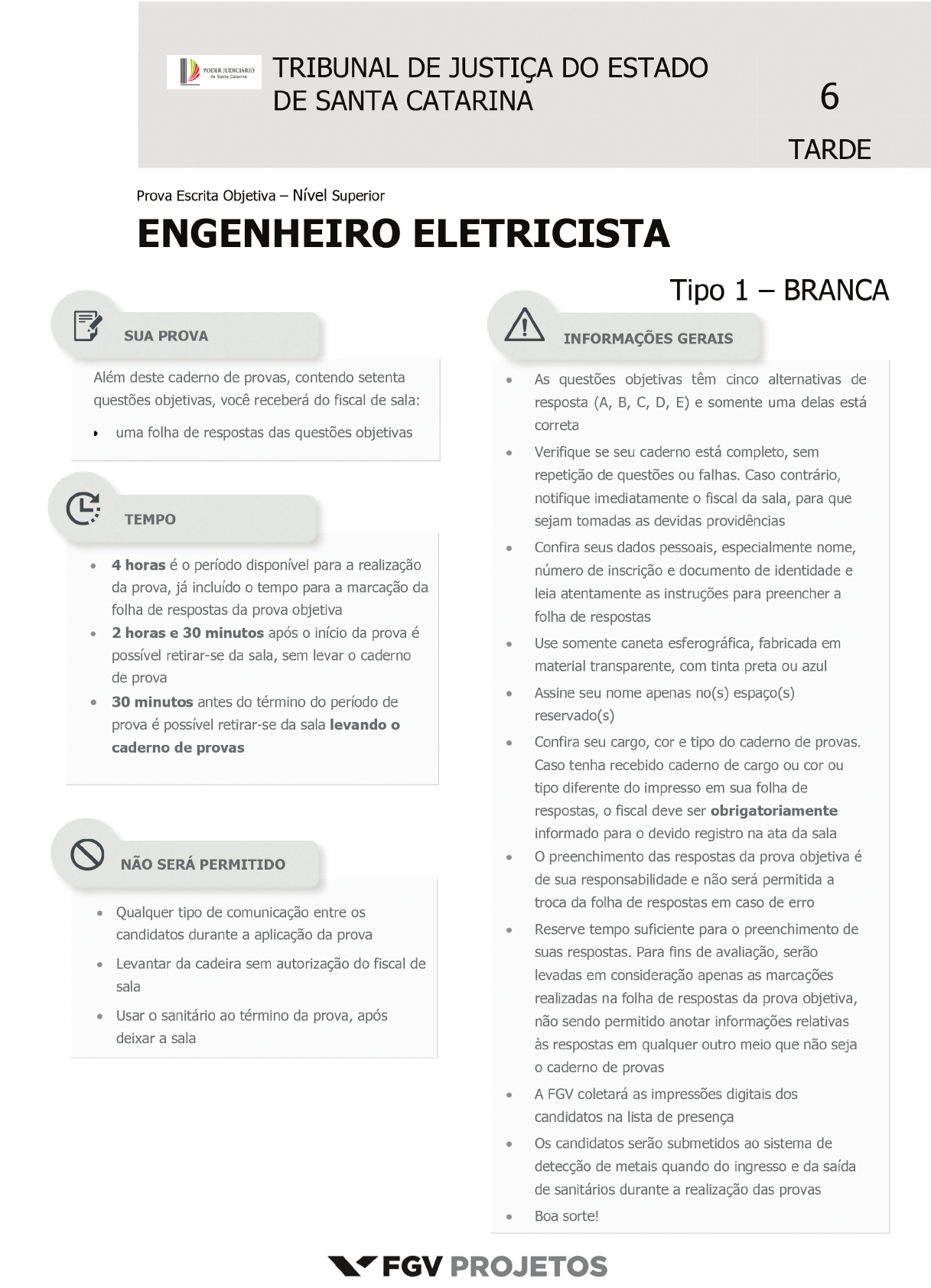 Tribunal de Justiça do Estado de Santa Catarina FGV – Projetos Engenheiro Eletricista Tipo 1 – Cor BRANCA – Página 3 Língua Portuguesa Texto 1 Stephen Hawking, A Mente Que Superou Tudo Em reverência ao gênio que revolucionou o estudo da cosmologia, o mundo prestou tributo a Stephen Hawking no dia seguinte a sua morte. O cientista britânico, símbolo da superação, teve papel decisivo na divulgação científica e virou um ícone pop. (O Globo, 15/3/2018) 1 O texto 1 é uma pequena notícia de primeira página de O Globo, cujo conteúdo é ampliado em reportagem no interior do jornal. A marca mais característica de ser este um texto resumido é: (A) a presença marcante de frases curtas; (B) a preferência por sinais de pontuação em lugar de conectivos; (C) a ausência de adjetivos e advérbios; (D) a seleção de temas de destaque; (E) a utilização de verbos indicadores de ação rápida. 2 Na estruturação da notícia do texto 1, o jornal deu principal destaque ao seguinte papel de Stephen Hawking: (A) possuir uma mente privilegiada; (B) ter revolucionado o estudo da cosmologia; (C) ser um símbolo de superação; (D) ter tido papel decisivo na divulgação científica; (E) ter virado um ídolo pop. 3 Ao dizer que o cientista inglês “virou um ícone pop”, o autor do texto 1 quer dizer que ele: (A) tornou-se temática de muitos filmes modernos; (B) realizou tarefas ligadas à arte popular; (C) alcançou popularidade acima das expectativas; (D) obteve uma fama comparável à de artistas populares; (E) conquistou um espaço nas artes plásticas. 4 Observe a charge a seguir: A charge acima é uma homenagem a Stephen Hawking, destacando o fato de o cientista: (A) ter alcançado o céu após sua morte; (B) mostrar determinação no combate à doença; (C) ser comparado a cientistas famosos; (D) ser reconhecido como uma mente brilhante; (E) localizar seus interesses nos estudos de Física. 5 Essa charge traz elementos verbais – a fala de Einstein – e elementos imagísticos; entre os significados construídos pelos dados da imagem, NÃO está correta a seguinte afirmação: (A) as asas na cadeira de rodas indicam a pureza angelical do cientista falecido; (B) a aparência da cadeira de rodas indica a alta tecnologia de que dispunha o cientista morto; (C) a gestualidade de Einstein mostra alegria na recepção a Stephen Hawking; (D) a espécie de luneta em uma das mãos de Galileu se refere à sua atividade de observador astronômico; (E) as roupas dos cientistas estão adequadas à época em que viveram. 6 Sobre a frase dita por Einstein, é correto afirmar que: (A) o termo “Galileu”, por ser um vocativo, deveria ser colocado no início da frase; (B) o adjetivo “brilhante”, por ser um adjetivo qualificativo, deveria vir antes do substantivo “mente”; (C) o pronome “nós”, implícito em “estávamos esperando” se refere a todos os habitantes do céu; (D) o termo “Galileu” deveria aparecer entre vírgulas, por ser um vocativo; (E) o emprego da forma “olha” é desaconselhável por pertencer à linguagem coloquial. Tribunal de Justiça do Estado de Santa Catarina FGV – Projetos Engenheiro Eletricista Tipo 1 – Cor BRANCA – Página 4 Texto 2: Inteligência e sabedoria não são a mesma coisa. Entretanto, na linguagem cotidiana, usamos os dois termos indistintamente. Vivemos em uma sociedade onde a eficiência e os resultados são valorizados. Aparentemente, apenas os mais inteligentes estão destinados a obter sucesso. No entanto, apenas os sábios conseguem uma felicidade autêntica. Eles são guiados por valores e preocupados em fazer uso da bondade, aplicando uma visão mais otimista à vida. Se procurarmos agora no dicionário o termo sabedoria, será encontrada uma definição simples: a faculdade das pessoas de agir de maneira sensata, prudente ou correta. Sendo assim, a primeira pergunta que vem à mente é: a inteligência não nos dá a capacidade de nos movimentarmos no nosso dia a dia da mesma maneira? Um QI médio ou alto não nos garante a capacidade de tomar decisões acertadas? É claro que sim. Também é claro que quando falamos de inteligência surgem diferentes nuances. Por isso, o tipo de personalidade e a maturidade emocional são fatores que influenciam mais concretamente as realizações das pessoas. Isso também é verdadeiro em relação à capacidade de investir mais ou menos em seu próprio bem-estar e no dos outros. Em vista disso, inteligência e sabedoria são dois conceitos interessantes. Assim, poderemos ter uma ideia mais precisa e útil do que realmente são. Afinal, se queremos algo, além de ter um alto QI, é necessário desenvolver uma sabedoria excepcional e moldar uma personalidade virtuosa. Isso vai um passo além do cognitivo e do emocional. “A verdadeira sabedoria está em reconhecer a própria ignorância.” Sócrates. Disponível em https:amentemaravilhosa.com.br/inteligencia-e-sabedoria/ 7 “Inteligência e sabedoria não são a mesma coisa”. Essa frase tem a função textual de: (A) introduzir tematicamente o assunto do texto 2, sem preocupações, no momento, de explicar a afirmativa; (B) indicar uma questão que será resolvida no restante do texto 2; (C) propor uma reflexão conjunta com o leitor; (D) despertar o interesse do leitor pela leitura do texto 2; (E) mostrar o posicionamento do autor diante de uma questão polêmica no terreno da psicologia. 8 “Inteligência e sabedoria não são a mesma coisa. Entretanto, na linguagem cotidiana, usamos os dois termos indistintamente”. Esse segmento do texto 2 mostra que nossa linguagem cotidiana: (A) falha em determinar especificidades da realidade; (B) é empregada de diferentes formas em função da situação comunicativa em que se insere; (C) não possui todos os vocábulos necessários à perfeita comunicação humana; (D) engloba todo o conhecimento humano, mas não é usada de forma coerente por todos; (E) não é capaz de mostrar 