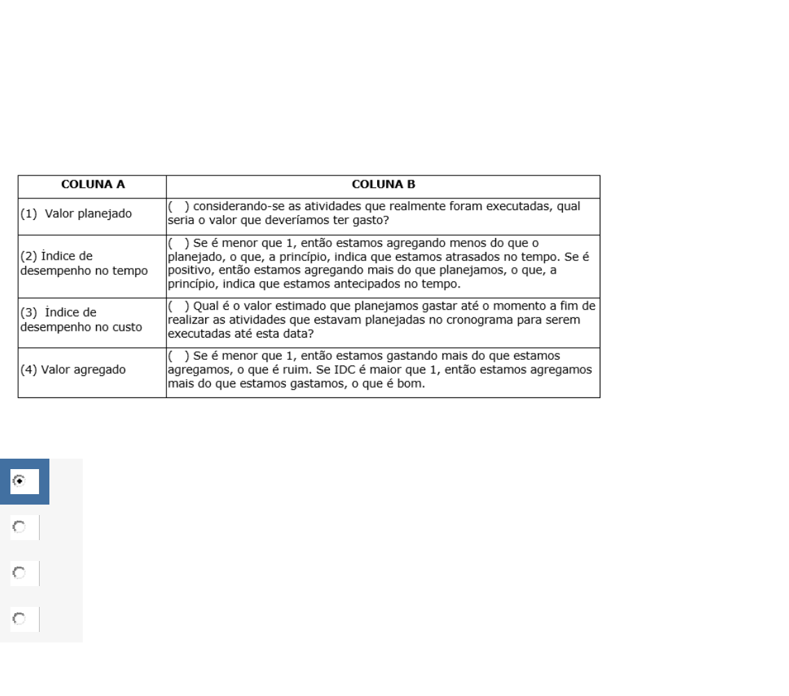 Questão 1/5 - Gestão de Projetos O Gerenciamento do Valor Agregado - GVA, ou, em inglês, Earned Value Management – EVM é uma ferramenta utilizada para o controle de tempo e custo que avalia, de uma forma integradora, as medidas de tempo, custo e escopo (trabalho realizado). Os indicadores utilizados na GVA são muito utilizados para comunicar para a Alta Gerência, de forma simplificada e executiva, o andamento de um projeto em determinado momento. Analise a tabela abaixo. Relacione a coluna A (nome da variável ou indicador) com a coluna B (descrição da variável ou indicador) e, em seguida, assinale a alternativa que apresenta a sequência CORRETA. A 4 - 2 – 1 – 3 B 3 – 1 – 2 – 4 C 3 - 1 – 4 - 2 D 1 – 2 – 3 – 4 Questão 2/5 - Gestão de Projetos Existem diversas formas de se apresentar um cronograma de projetos, devendo-se selecionar aquele que melhor se adequada à necessidade. Por exemplo, para apresentações para a Alta Gerência costuma-se utilizar cronogramas mais simplificados que permitem visualizar de forma simplificada os resultados já alcançados e os que ainda estejam para ser obtidos. Em contrapartida, em uma reunião com a equipe técnica e responsáveis por etapas do projeto é comum utilizar cronogramas que apresentam as relações lógicas entre as atividades e informações em níveis mais detalhados. Relacione a coluna A (imagem de cronograma) com a coluna B (Nome de Tipo de Cronograma) e, em seguida, assinale a alternativa que apresenta a sequência CORRETA: A 1 – 2 – 3 B 2 – 3 – 1 C 3 - 1 - 2 D 1 – 3 – 2 Questão 3/5 - Gestão de Projetos De acordo com o estudado sobre Gestão de custos do projeto, analise as sentenças a seguir e assinale a alternativa correta. O Guia PMBOK sugere que: I – sejam registradas detalhadamente todas as mudanças relacionadas com a linha de base de custos; II - sejam evitadas mudanças incorretas, inadequadas ou não aprovadas e, ainda, que estas não se incluam nos custos relatados ou na utilização de recursos; III - sejam amplamente divulgadas às partes interessadas as mudanças aprovadas, em especial observando qual informação interessa a cada stakeholder; IV - a equipe de gestão e suas auxiliares devem agir no sentido de manter as extrapolações dos custos dentro de limites seguros e aceitáveis. A Apenas as sentenças I e II estão corretas. B Apenas as sentenças III e IV estão corretas. C Apenas as sentenças I e IV estão corretas. D As sentenças I, II, III e IV estão corretas. Questão 4/5 - Gestão de Projetos No gerenciamento do tempo em projetos dependência obrigatória indica que a atividade dependente não pode acontecer de outra forma senão aquela que foi desenhada no diagrama, enquanto dependência arbitradas (ou desejadas) demonstram boas práticas, ou seja, o que seria bom, mais confortável, mais desejável, ou com menor risco ou menor custo, mas que poderiam ser modificadas se necessário. Analise as afirmações abaixo: ( ) As dependências obrigatórias são também chamadas de “hard logic”; e as dependências arbitradas (ou desejadas) são também chamadas de “soft logic”. ( ) É uma exemplo de dependência obrigatória: A impossibilidade de instalar as janelas de uma casa antes de termos as paredes construídas. ( ) É um exemplo de dependência arbitrada: Seria ideal picar e deixar disponível para o cozinheiro todos os ingredientes para preparo de um prato antes dele começar a cozinhar, porém, se for necessário , pode-se iniciar o preparo com apenas os ingredientes utilizados no início da receita picados. ( ) É um exemplo de dependência arbitrada: A impossibilidade de testar um protótipo antes do mesmo ser confeccionado. Considerando V para as afirmativas verdadeiras e F para as afirmativas falsas, assinale a alternativa que apresenta a sequência correta. A V , F , F, V B V, V, V, F C F, V, V, F D F, V, V, V Questão 5/5 - Gestão de Projetos Uma das principais atividades no processo de planejamento de protejo é a análise crítica do cronograma, aplicando técnicas para torná-lo factível e, ao mesmo tempo, atendendo às necessidades do projeto. É o fruto de um processo iterativo intenso, normalmente requerendo uma revisão das estimativas de duração, relações lógicas entre atividades, recursos necessários, etc. Analise a tabela abaixo: Relacione a coluna A (ferramentas de análise de cronograma) com a coluna B (descrição das ferramentas) e, em seguida, assinale a alternativa que apresenta a sequência CORRETA. A 1 – 2 – 3 - 4 B 4 - 2 – 3 – 1 C 3 - 1 – 4 - 2 D 3 – 1 – 2 - 4