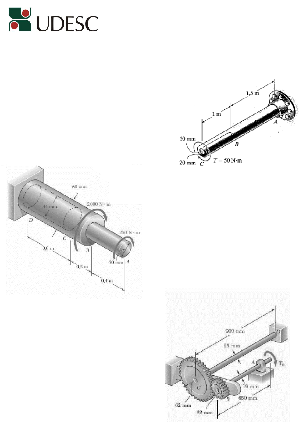 UNIVERSIDADE DO ESTADO DE SANTA CATARINA Centro Foz do Itajaí Engenharia de Petróleo Programa da Disciplina: RESISTÊNCIA DOS MATERIAIS Semestre: 2017/02 LISTA DE EXERCÍCIOS 03 01. O eixo composto por uma seção maciça de aço AB e uma porção tubular feita de aço com núcleo de latão. Se o eixo estiver preso a um apoio rígido em A e for aplicado um torque T = 50 N.m a ele em C, determine: (a) O ângulo de torção que ocorre em C; (b) A tensão de cisalhamento máxima no latão e no aço. Considere Gaço = 80 GPa e Glatão = 40 GPa. 02. O eixo horizontal AD está engastado a uma base rígida em D e é submetido aos torques mostrados na figura. Foi feito um furo de 44 mm de diâmetro na parte CD do eixo. Sabendo que o eixo inteiro é feito de aço para o qual G = 77 GPa, determine o ângulo de torção na extremidade A. 03. Dois eixos cheios de aço estão acoplados pelas engrenagens mostradas na figura. Sabendo que par cada eixo G = 77,2 GPa, e que a tensão de cisalhamento admissível é de 55 Mpa, determine (a) o maior torque T0 que pode ser aplicado à extremidade A do eixo AB e (b) o ângulo correspondente pelo qual a extremidade A do eixo AB gira. UNIVERSIDADE DO ESTADO DE SANTA CATARINA Centro Foz do Itajaí Engenharia de Petróleo Programa da Disciplina: RESISTÊNCIA DOS MATERIAIS Semestre: 2017/02 04. Uma barra circular AB com extremidades fixas (engastadas) tem um furo que se estende até a metade de seu comprimento. Os diâmetros são respectivamente 100 e 80 mm (externo e interno) e o comprimento total da barra é 1250 mm. Qual deve ser a distância x para que os torques de reação nas paredes sejam iguais? 05. Um tacômetro F, utilizado para registrar em forma digital a rotação do eixo A, é conectado ao eixo por meio do trem de engrenagens mostrado, valendo-se de quatro engrenagens a três eixos de aço de seção cheia e diâmetro d. Duas das engrenagens têm raio r e as outras duas têm raios “nr”. Se a rotação do tacômetro F for impedida, determine em termos de T, l, G, J e n, o ângulo pelo qual a extremidade A gira. 06. O projeto do sistema de engrenagem e eixo mostrado na figura requer que sejam usados eixos de aço de mesmo diâmetro para AB e CD. É necessário também que a tensão de cisalhamento máxima não exceda 62 Mpa e que o ângulo na extremidade D não exceda 2º. Sabendo que G = 77,2 GPa, determine o diâmetro necessário para os eixos. UNIVERSIDADE DO ESTADO DE SANTA CATARINA Centro Foz do Itajaí Engenharia de Petróleo Programa da Disciplina: RESISTÊNCIA DOS MATERIAIS Semestre: 2017/02 07. Um tubo uniformemente afilado AB, de seção transversal circular vazada, está representado na figura. O tubo tem espessura de parede constante t e o comprimento L. Os diâmetros médios nas extremidades são dA e dB = 2 dA . O momento de inércia polar de inércia pode ser representado pela fórmula aproximada I = πd³t/4. Deduza uma fórmula para o ângulo de torção do tubo quando ele está submetido a torques T agindo nas extremidades. 08. Um motor transmite 200 kW a 1000 rpm à extremidade de um eixo. As engrenagens em B e C transmitem 90 e 110 kW, respectivamente. Determine o diâmetro d necessário do eixo se a tensão de cisalhamento admissível for de 50Mpa e o ângulo de torção entre o motor e a engrenagem C for limitado a 1,5º. Considere G = 80 GPa, L1 = 1,8m e L2 = 1,2m. 09. Quando um poço é perfurado, considera-se que a extremidade do tubo da perfuratriz que se aprofunda no solo encontra uma resistência à torção TA. Além disso, o atrito do solo ao longo das laterais do tubo cria uma distribuição linear de torque por unidade de comprimento que varia de zero na superfície B a t0 em A. Determine o torque necessário TB que deve ser fornecido pela unidade de acionamento para girar o tubo. Calcule também o ângulo de torção relativo de uma extremidade do tubo em relação à outra extremidade no instante em que o tubo está prestes a girar. O tubo tem raio externo re e raio interno ri. O módulo de cisalhamento é G. 10. Sabendo que o eixo de seção variável mostrado na figura deve transmitir 45 kw na velocidade de 2100 rpm, determine o raio r mínimo do adoçamento para que a tensão de cisalhamento admissível de 50 MPa não seja excedida. UNIVERSIDADE DO ESTADO DE SANTA CATARINA Centro Foz do Itajaí Engenharia de Petróleo Programa da Disciplina: RESISTÊNCIA DOS MATERIAIS Semestre: 2017/02 11. O eixo AB é feito de um aço doce considerado elastoplástico com G = 77,2 GPa e tensão de escoamento de 145 Mpa. Um torque T é aplicado e gradualmente aumentado em sua intensidade. Determine a intensidade de T e o ângulo de torção correspondente (a) quando se inicia o escoamento, (b) quando a deformação da seção transversal já se tornou totalmente plástica. 12. O eixo vazado da figura é feito de aço elastoplástico com τE = 145 Mpa e G = 77,2 GPa. Determine (a) a intensidade do torque T e o ângulo de torção correspondente ao início do escoamento, (b) a intensidade do torque T e o ângulo de torção quando a zona plástica tem 10 mm de profundidade, (c) a intensidade do torque T e o ângulo de torção no qual o eixo começa a ficar totalmente plástico. 13. O eixo composto mostrado consiste em uma jaqueta de latão de 5mm de espessura (Glatão = 39 GPa) unido a um núcleo de aço de 40 mm de diâmetro (Gaço = 77,2 GPa). Sabendo que o eixo está submetido a um torque de 600 N.m, determine (a) a tensão de cisalhamento máxima na jaqueta de latão, (b) a tensão de cisalhamento máxima no núcleo de aço e (c) o ângulo de torção de B relativo a A. 14. O eixo de seção escalonada tem um adoçamento de um quarto de circunferência completa, D = 32mm e d = 25mm. Sabendo que a velocidade do eixo deve ser 2400 rpm e a tensão de cisalhamento admissível é de 52 Mpa, determine a potência máxima que pode ser transmitida pelo eixo. UNIVERSIDADE DO ESTADO DE SANTA CATARINA Centro Foz do Itajaí Engenharia d