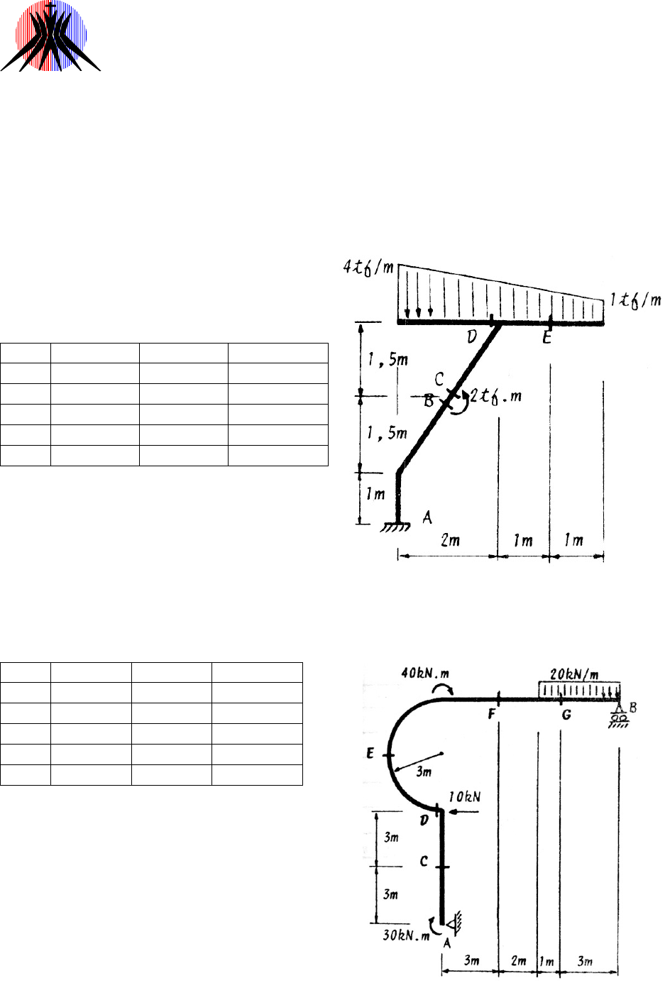 Mecânica dos Sólidos I Profa. Glauceny Medeiros MECÂNICA DOS SÓLIDOS I ENGENHARIA CIVIL Profª Glauceny Medeiros Unidade I: Esforços nas Estruturas Lista de Exercícios 02 - Esforços internos GABARITO 1) Determinar os esforços internos nas seções indicadas da estrutura. Seção N (tf) V (tf) M (tf.m) A -10 0 14 (TE) B -8,32 5,55 4 (TE) C -8,32 5,55 6 (TE) D 0 -6,50 7 (TC) E 0 1,375 0,625 (TC) 2) Determinar os esforços internos nas seções indicadas da estrutura. Seção N (KN) V (KN) M (KN.m) C -16,67 -10 0 D 0 -16,67 30 (TB) E -16,67 0 80 (TE) F 0 16,67 60 (TB) G 0 -3,33 100 (TB) Mecânica dos Sólidos I Profa. Glauceny Medeiros 3) Determinar os esforços internos nas seções indicadas da estrutura. Seçã o N (KN) V (KN) M (KN.m) C 0 26,67 160 (TD) D -26,67 -30 115 (TB) E -65,35 6,33 0 (TD) F -65,35 6,33 19,8 (TD) 4) Determinar os esforços internos nas seções indicadas da estrutura. Seção N (tf) V (tf) M (tf.m) B 4,5 -10,60 11,93 (TB) C 5,2 0 27,92 (TD) D -3,68 3,68 24,15 (TC) E 0 5,2 6,4 (TC) F 0 5,2 10,4 (TC) 5) Determinar os esforços internos nas seções indicadas da estrutura. Seção N (tf) V (tf) M (tf.m) A 0 -1 5 (TD) B -3 1 10 (TE) C 1 3 26 (TB) D 1 3 28 (TB) Mecânica dos Sólidos I Profa. Glauceny Medeiros 6) Determinar os esforços internos nas seções indicadas da estrutura. Seção N (KN) V (KN) M (KN.m) A 0 37,5 347 (TC) B 0 27,5 tf 184,5 (TC) C 0 9 62,5 (TC) 7) Determinar os esforços internos nas seções indicadas da estrutura. Seção N (tf) V (tf) M (tf.m) A 0 1,5 1,125 (TD) B -3 0 8,5 (TC) C -3 0 4,5 (TC) 8) Determinar os esforços internos (N, V e M) para as seções D e E. Seção N (N) V (N) M (N.m) D 0 -762,50 -1031,25 (TC) E 0 300 150 (TC) A 1, 5 m B C D E 1 m 1,5 m Mecânica dos Sólidos I Profa. Glauceny Medeiros 9) Determinar os esforços internos (N, V e M) para as seções A, B e C, localizadas no meio de cada um dos vãos. Seção N (tf) V (tf) M (tf.m) A 0 -2 2 (TC) B 0 0,29 3,125 (TB) C 0 2 1 (TC) 10) Determinar os esforços internos (N, V e M) para as seções C e D. Seção N (KN) V (KN) M (KN.m) C -30 -7 1 (TB) D -30 -7 6 (TC) Boa Sorte! A C B C D 2 m 2 m