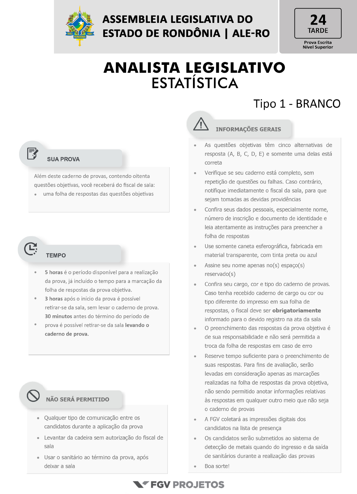 Assembléia Legislativa de Rondônia FGV – Projetos Analista Legislativo - Estatística Τ1 Tipo 1 – Cor BRANCA – Página 3 Língua Portuguesa Texto 1. Observação Vivemos tão apressados que estamos perdendo a habilidade de observar detalhadamente o que nos cerca. Por outro lado, somos tão bombardeados por imagens e por estímulos visuais que, para nos proteger do excesso, aprendemos a não perceber o que está em volta, aprendemos a nos proteger. Por isso, a propaganda fica cada vez mais agressiva. Os produtos precisam, a qualquer custo, chamar a atenção do possível comprador, até que sejamos capazes de “ver sem olhar”. Ou seja, mesmo sem estarmos interessados, não podemos escapar de perceber uma imagem de propaganda. Isso nos tem levado à autoproteção ou a uma atitude passiva, já que não é preciso fazer nenhum esforço, pois a propaganda e as imagens se encarregam de nos invadir. Entretanto, para apreciar a arte e saber ler imagens, uma primeira habilidade que precisamos renovar, estimular e desenvolver é a observação. Ela deve deixar de ser passiva para tornar-se ativa, voluntária: observo o que quero, porque quero, como quero, da forma que quero, quando quero observar. Se pedirmos a um amigo que descreva alguém, ele pode dizer genericamente: alto, magro, de meia-idade: ou então ser bem específico: tem aproximadamente 1 metro e oitenta, é magro, está vestido com uma calça azul, camisa branca, tênis, jaqueta de couro marrom, tem cabelos escuros, encaracolados, curtos, olhos azuis, usa costeletas, tem um sinal escuro do lado direito do rosto e cerca de 40 anos. Essa segunda descrição é mais detalhada e demonstra mais observação. Naturalmente, se eu estiver procurando tal pessoa, a partir dessa descrição detalhada, posso encontrá-la com mais facilidade. OLIVEIRA, J. e GARCEZ, L. Explicando a Arte. Ed. Nova Fronteira. 2001. 1 Assinale a opção que indica o objetivo principal do texto. (A) Valorizar a arte em nossa vida cotidiana. (B) Ensinar como escapar da propaganda enganosa. (C) Explicar o meio de funcionamento da publicidade. (D) Destacar a importância da observação das imagens. (E) Fazer com que a propaganda seja mais bem considerada. 2 Em todas as opções a seguir foram sublinhadas orações. Indique aquela que tem seu valor semântico corretamente indicado. (A) “Vivemos tão apressados que estamos perdendo a habilidade de observar detalhadamente o que nos cerca.” / consequência. (B) “Por outro lado, somos tão bombardeados por imagens e por estímulos visuais que, para nos protegermos do excesso, aprendemos a não perceber muito o que está em volta, ...” / explicação. (C) “Por isso a propaganda fica cada vez mais agressiva.” / conclusão. (D) “Os produtos precisam, a qualquer custo, chamar a atenção do possível comprador, até que sejamos capazes de ´ver sem olhar´.” / proporção. (E) “Ou seja, mesmo sem estarmos interessados, não podemos escapar de perceber uma imagem de propaganda.” / causa. 3 “Ela deve deixar de ser passiva para tornar-se ativa, voluntária: observo o que quero, porque quero, como quero, da forma que quero, quando quero observar.” O trecho acima fala de vários aspectos da observação; assinale a opção que apresenta o aspecto cujo valor semântico está explicitado erradamente. (A) “o que quero” / o objetivo. (B) “porque quero” / a explicação. (C) “como quero” / o meio. (D) “da forma que quero” / o modo. (E) “quando quero observar” / o tempo. 4 Em todos os segmentos a seguir, retirados do texto 1, há um conector sublinhado. Indique o substituto correto dentre os que são indicados, supondo-se adaptações das frases. (A) “Por outro lado, somos tão bombardeados por imagens ...” / Assim. (B) “...para nos proteger do excesso” / apesar de. (C) “Por isso, a propaganda fica cada vez mais agressiva” / Visto que. (D) “mesmo sem estarmos interessados” / embora. (E) “já que não é preciso fazer nenhum esforço” / logo. 5 “Ela deve deixar de ser passiva para tornar-se ativa”; a relação de oposição entre as duas palavras sublinhadas se repete em (A) cuidadosa / displicente. (B) demorada / lenta. (C) superficial / desimportante. (D) afetiva / sentimental. (E) produtiva / reprodutiva. 6 Segundo o texto, a propaganda se torna mais agressiva porque (A) deve intensificar o bombardeio sobre os consumidores. (B) procura opor-se à autoproteção dos clientes. (C) pretende vender os produtos anunciados. (D) deseja sobrepor-se aos concorrentes. (E) tenta chegar ao público-alvo ideal. Assembléia Legislativa de Rondônia FGV – Projetos Analista Legislativo - Estatística Τ1 Tipo 1 – Cor BRANCA – Página 4 7 “Por outro lado, somos tão bombardeados por imagens e por estímulos visuais que, para nos proteger do excesso, aprendemos a não perceber o que está em volta, aprendemos a nos proteger. Por isso, a propaganda fica cada vez mais agressiva. Os produtos precisam, a qualquer custo, chamar a atenção do possível comprador, até que sejamos capazes de ´ver sem olhar´. Ou seja, mesmo sem estarmos interessados, não podemos escapar de perceber uma imagem de propaganda”. Esse segmento do texto nos mostra um conjunto de características do texto publicitário. A característica que não está presente nesse segmento é a de que o texto publicitário deve (A) dirigir-se ao comprador potencial do produto anunciado. (B) produzir mensagens subliminares. (C) convencer os compradores a adquirirem o produto. (D) criar interesse pelos produtos indicados. (E) mudar a ideologia social dos clientes. 8 “Os produtos precisam, a qualquer custo, chamar a atenção do possível comprador, até que sejamos capazes de ´ver sem olhar´.” O segmento ´ver sem olhar´ mostra (A) um erro gramatical. (B) uma incoerência lógica. (C) uma expressão popular. (D) uma citação intertextual. (E) uma repetição desnecessária. 9 Assinale a opção que apr