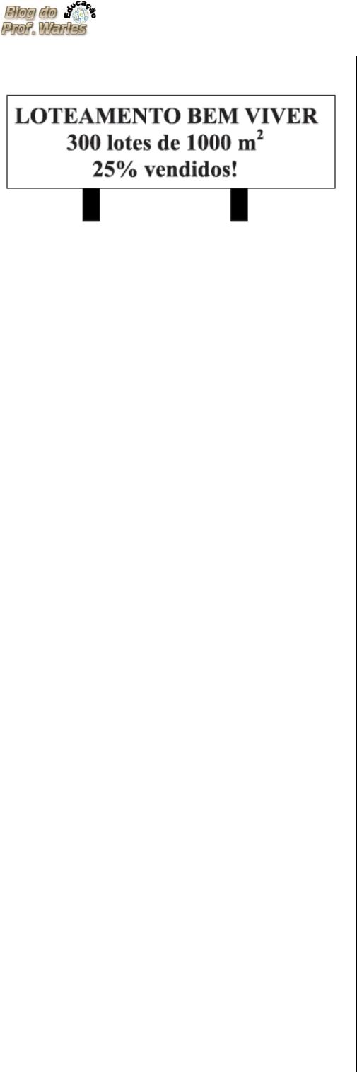 D26 - Resolver problema envolvendo noções de porcentagem (25%, 50%, 100%). (SAEPE). Em suas férias na praia, Eduarda viu o seguinte anúncio: Quantos desses lotes já foram vendidos? A) 40 B) 75 C) 250 D) 275 **************************************** (SPAECE). Uma professora ganhou ingressos para levar 50% de seus alunos ao circo da cidade. A professora leciona para 36 alunos. Quantos alunos ela poderá levar? (A) 9 (B) 18 (C) 24 (D) 36 *************************************** Uma professora ganhou ingressos para levar 50% de seus alunos ao circo da cidade. Considerando-se que essa professora leciona para 36 alunos, quantos alunos ela poderá levar? (A) 9 (B) 18 (C) 24 (D) 36 *************************************** (INEP 2009 - Adaptada). Uma pesquisa feita em uma escola, envolvendo os 1.000 alunos, demonstrou que 25% deles usavam óculos. Quantos alunos usavam óculos? (A) 100 (B) 250 (C) 500 (D) 750 *************************************** Natália comprou um tênis por R$ 64,00 e recebeu um desconto de 25% por pagar em dinheiro. Quanto Natália pagou pelo tênis? (A) R$ 39,00 (B) R$ 41,00 (C) R$ 48,00 (D) R$ 52,00 **************************************** (INEP - 2009). Na quarta série, os 13 meninos correspondem a 50% da turma. Assim, pode-se dizer que nesta 4ª série tem (A) 13 alunos (B) 26 alunos (C) 50 alunos (D) 63 alunos **************************************** (Saresp 2007). Ganhei R$ 50,00 de aniversário de meu avô. Gastei 50% deste valor com a compra de um brinquedo. Quanto custou este brinquedo? (A) R$ 15,00 (B) R$ 25,00 (C) R$ 35,00 (D) R$ 45,00 *************************************** (Saresp 2007). Uma escola recebeu 150 caixas de lápis de cor. Os alunos que estudam no período da manhã ficaram com 50% das caixas de lápis de cor recebidos. Quantas caixas de lápis representa essa porcentagem? (A) 60 (B) 65 (C) 70 (D) 75 *************************************** (Saresp). Na escola aprendi que um índice representado em porcentagem pode ser escrito como fração e decimal. Li no jornal que 50% dos brasileiros não sabem localizar o Brasil no mapa. Dizendo a mesma coisa de outra forma, (A) ½ (metade) dos brasileiros não sabem localizar o Brasil no mapa. (B) ¼ (um quarto) dos brasileiros não sabem localizar o Brasil no mapa. (C) 1/8 (um oitavo) dos brasileiros não sabem localizar o Brasil no mapa. (D) 1/16 (um dezesseis avos) dos brasileiros não sabem localizar o Brasil no mapa. ***************************************************** (Projeto consequir – DC). Uma confecção produziu 100 biquínis para o verão, desses biquínis, 25 estão com defeito. Qual a porcentagem que corresponde aos biquínis defeituosos? (A) 75% (B) 25% (C) 100% (D) 50% ***************************************************** (Projeto consequir – DC). A diretora de uma escola que possui 340 alunos observou que na sexta feira antes do carnaval somente 50% dos alunos compareceram à escola. Quantos alunos foram à escola? (A) 170 (B) 150 (C) 290 (D) 390 ***************************************************** (Projeto consequir – DC). Ana vende docinhos para festa. Para confecção de 100 doces ela gasta R$ 8,00. Ela vende o cento por R$ 16,00. Qual a porcentagem que ela tem de lucro? (A) 100% (B) 20% (C) 25% (D) 50% ***************************************************** (Projeto consequir – DC). Denise e Caio são donos de um mesmo terreno em Xerém, representado pelo retângulo maior. Denise construiu uma casa na parte que lhe pertence. Observe a ilustração e responda: A parte de Denise corresponde à: (A) 50% (B) 10% (C) 25% (D) 100% ***************************************************** (Projeto consequir – DC). A tabela abaixo mostra em porcentagem os meios de locomoção usados pelos alunos de uma escola. São 1000 alunos e cada um utiliza apenas um meio de locomoção. Quantos alunos vão a pé para a escola? (A) 500 (B) 250 (C) 200 (D) 50 ***************************************************** (Projeto consequir – DC). As bolas coloridas correspondem a que porcentagem do total? (A) 50% (B) 10% (C) 25% (D) 100% ***************************************************** (Projeto consequir – DC). Uma fábrica de carros está oferecendo 800 vagas de emprego. 20% para controladores de peças, 25% para pintores, 50% para eletricistas, 5% para projetistas. Quantas vagas estão oferecendo para eletricistas e pintores? (A) 600 (B) 400 (C) 160 (D) 40 ***************************************************** (Projeto consequir – DC). A loja “Bom Preço” está vendendo uma televisão por R$1.600,00 com 25% de desconto à vista. Quanto custa cada televisor à vista? (A) R$ 1575,00 (B) R$ 1200,00 (C) R$ 400,00 (D) R$ 250,00 ***************************************************** (Projeto consequir – DC). Numa pesquisa, foram entrevistadas 100 pessoas, sendo que 25% eram mulheres e o restante eram homens. Então foram entrevistados (A) 25 homens (B) 75 homens (C) 50 homens (D) 100 homens ***************************************************** (Projeto consequir – DC). Rafaela trabalha como vendedora de uma loja de roupas e foi promovida à gerente . Seu salário atual é de R$ 600,00. Com a promoção, terá 50% de aumento e passará a receber (A) R$ 650,00 (B) R$1200,00 (C) R$ 900,00 (D) R$ 3000,00 ***************************************************** (Projeto consequir – DC). Luciana comprou uma saia e uma blusa numa loja que estava em liquidação e teve um desconto de 50%. Ela pagou: (A) R$ 50,00 (B) R$ 25,00 (C) R$ 30,00 (D) R$ 20,00 ***************************************************** (Projeto consequir – DC). Leia o cartaz abaixo: Dona Suzana, moradora do Parque São Bento, paga R$180,00 de IPTU. Se pagar esse imposto em cota única, ela terá um desconto de: (A) R$18,00 (B) R$10,00 (C) R$162,00 (D) R$180,00 ***************************************************** 1