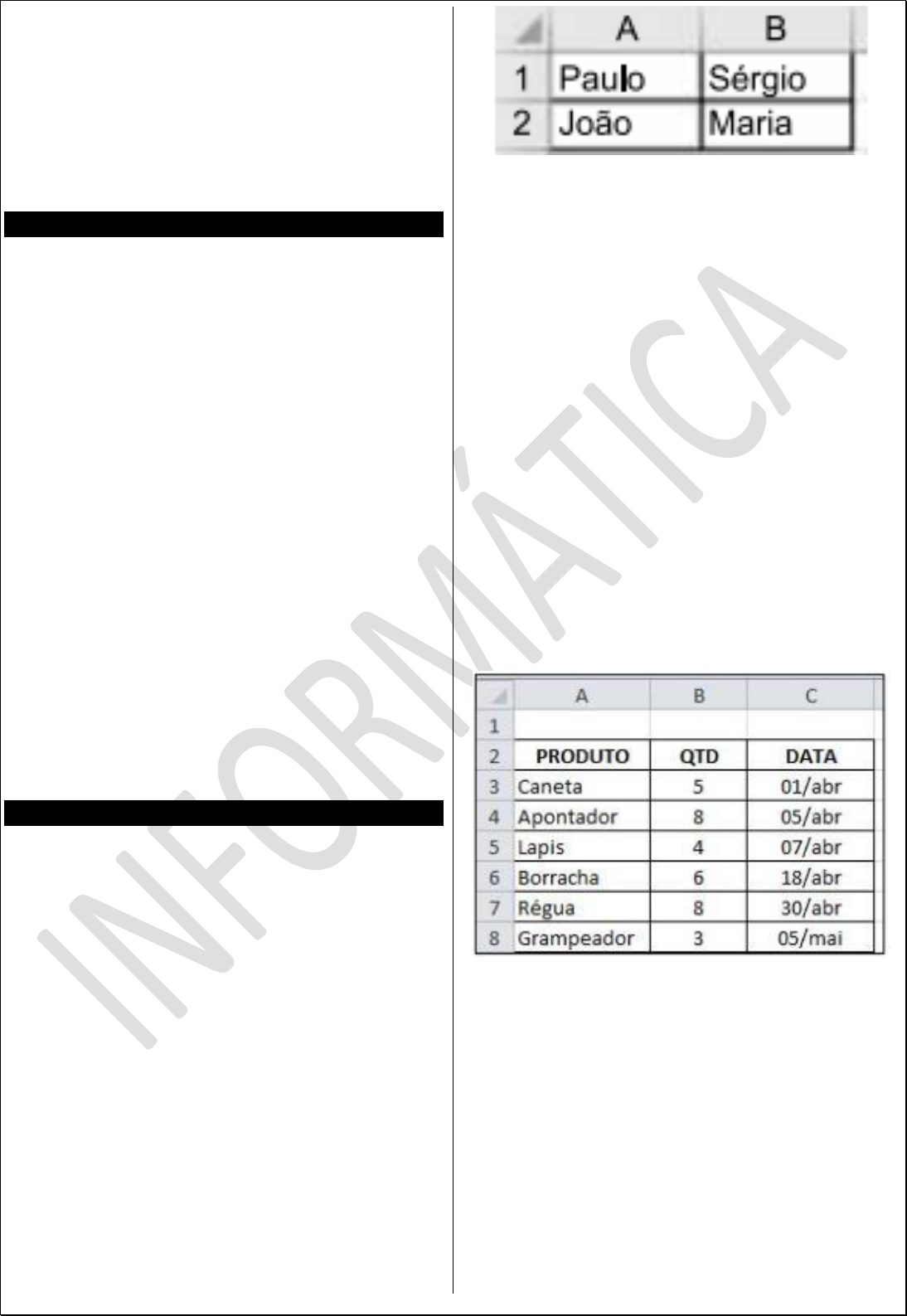 Professor Leonardo Gabriel (Informática) Se inscreva no nosso canal do YouTube (link abaixo) www.youtube.com/leonardogabrielpgs Adquira o nosso curso completo (link abaixo) https://produto.mercadolivre.com.br/MLB-847286435- video-aulas-de-informatica-para-concursos-publicos-_JM SEGURANÇA DA INFORMAÇÃO 01. 2018 Banca: IDIB Órgão: CRF-RJ Prova: Agente Administrativo Acerca dos tipos de vírus, analise as seguintes afirmativas. I. Os vírus de arquivos infectam arquivos de programas e arquivos criados por usuários. II. Os vírus de macro são vírus que tem seu código fonte (linhas de comando) criptografado, ou seja, os caracteres da programação são alterados para outros caracteres. III. Os vírus de boot infectam os arquivos de inicialização do sistema, escondendo-se no primeiro setor do disco e são carregados na memória antes do sistema operacional. De acordo com as afirmativas acima, marque a alternativa correta. a) Apenas as afirmativa I está correta. b) Apenas as afirmativas I e II estão corretas. c) Apenas as afirmativas I e III estão corretas. d) Apenas as afirmativas II e III estão corretas. MICROSOFT OFFICE (WORD, EXCEL) 02. 2018 Banca: FUNRIO Órgão: AL-RR Prova: Assistente Legislativo - Anulada Um usuário do MS Word 2010 em português está digitando um texto e deseja centralizar esse texto. Para isso, ele deve marcar o texto e digitar as teclas de atalho CTRL+ a) A. b) B. c) E. d) D. 03. 2018 Banca: VUNESP Órgão: PC-SP Prova: Agente Policial Analise a tabela a seguir, inserida no MS-Excel 2016, em português e em sua configuração padrão. Considere que a seguinte fórmula tenha sido inserida em C1: =NÚM.CARACT(B2) O resultado produzido em C1 foi: a) 11 b) 4 c) 9 d) 6 e) 5 04. 2018 Banca: INAZ do Pará Órgão: CRF-SC Prova: Advogado Um usuário do MS Excel 2010 confeccionou a planilha abaixo para catalogar os produtos utilizados por sua unidade de trabalho, informando a quantidade de cada um e a data da respectiva compra. Após a inserção de mais de 100(cem) itens, o usuário percebeu que poderia visualizar mais rapidamente as informações de determinado produto se eles estivessem organizados por ordem alfabética. O recurso para a execução dessa ação desejada pelo usuário será encontrado no menu principal, na opção: a) Layout de quadro → Organização. b) Dados → Classificar. c) Inserir → Classificação. d) Fórmulas → Classificar. e) Inserir → Ordem alfabética. 05. 2018 Banca: Quadrix Órgão: CRP - 2º Região (PE) Prova: Assistente Administrativo Um psicólogo deseja salvar um documento digitado no Microsoft Word 2013 (em português) no formato PDF para que possa ser disponibilizado para download no site da empresa em que trabalha e, assim, aberto sem a necessidade de se ter o Microsoft Word instalado no computador. Com base nessa situação hipotética, assinale a alternativa correta. a) Será necessário baixar um recurso adicional ao Microsoft Word (plug-in) para que o documento possa ser salvo no formato PDF. b) Será necessário clicar a sequência de opções Arquivo > Exportar > PDF. Na janela que se abrirá, deve-se dar um nome ao documento no campo Nome do Arquivo e, em seguida, clicar o botão . c) O psicólogo terá de clicar a sequência de opções Arquivo > Salvar Como > Procurar. Na janela que se abrirá, terá de selecionar a opção PDF no campo Tipo e, depois de nomear o documento no campo Nome do arquivo, terá de clicar o botão . d) O psicólogo terá de salvar o arquivo no formato padrão do Microsoft Word (docx). Depois, no Windows Explorer, terá de clicar o botão direito do mouse sobre o nome do arquivo e selecionar a opção Converter para PDF. e) O Microsoft Word 2013 não oferece recursos para salvar documentos no formato PDF. 06. 2018 Banca: NUCEPE Órgão: PC-PI Prova: Perito Criminal – Engenharia Civil Sobre o MS Word 2013, analise a imagem a seguir. O grupo de ferramentas apresentado pertence à guia: a) Página Inicial; b) Exibição; c) Inserir; d) Design; e) Layout de página. 07. 2018 Banca: FAURGS Órgão: TJ-RS Prova: Técnico em Eletrônica O programa MS-WORD, do pacote MS-Office, tem algumas ferramentas úteis para formatação de textos. Entre elas, uma ferramenta permite: • marcar partes de um texto e depois aplicar as formatações de texto sobre outro texto selecionado. • aplicar a formatação de textos, parágrafos, bordas e idiomas, previamente registrados, a outro texto selecionado. Qual a alternativa que apresenta a denominação dessas ferramentas, respectivamente? a) Personalizar e AutoFormatação. b) Pincel e AutoFormatação. c) Pincel e Estilos. d) Estilos e Personalizar. e) Estilos e Pincel. 08. 2018 Banca: INAZ do Pará Órgão: CRF-SC Prova: Advogado Durante a elaboração de um texto no MS Word, é possível a colocação de “textos decorativos” para que o documento tenha uma aparência mais sofisticada. Este recurso, comumente utilizado na confecção de capas de trabalhos acadêmicos ou em relatórios profissionais, pode ser acessado: a) Acionando-se o botão de “Estilos” e escolhendo o formato de texto desejado. b) Acionando-se o botão direito do mouse e escolhendo a opção “Fonte” → Avançado. c) Pelo botão “Fontes Especiais” localizado na opção “Exibição”. d) Através do menu de recursos especiais encontrado na opção “Referências”. e) Através da opção “Inserir” → WordArt. HARDWARE 09. 2018 Banca: NUCEPE Órgão: PC-PI Prova: Perito Criminal – Engenharia Civil Sobre noções de hardware, considere as afirmações a seguir. I. A unidade de medida do processador ou CPU é o Hertz (Hz), atualmente esta unidade de medida pode atingir uma frequência na ordem de bilhões de ciclos por segundo. Por exemplo: Um processador de 2 GHz equivale a 2 bilhões de ciclos por segundo; II. O teclado é considerado um dispositivo de entrada e possui diversos formatos e layouts. O layout QWERTY é muito popular e o nome faz refer