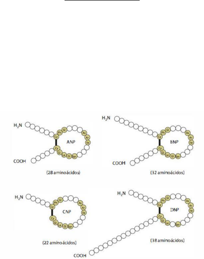 Peptídeos Natriuréticos Conceito: Os peptídios natriuréticos compreendem urna família de peptídios originados, primordialmente, de células cardíacas, que atuam primariamente na regulação do volume e da pressão sanguínea, contribuindo, dessa maneira, para a homeostasia cardiovascular. De Bold denominou peptídio natriurético atrial (ANP), embora posteriormente diferentes nomes tenham sido dados ao mesmo fator, incluindo cardiodilatina, cardionatrina e atriopeptina. O coração revelou-se também um órgão endócrino em potencial. Posteriormente, o ANP foi isolado de extratos atriais humanos e novos peptídios da família foram identificados e nomeados em cham ordem alfabética: o peptídio natriurético do tipo B, também ado de peptídio natriurético cerebral (BNP), o peptídio natriurético do tipo C (CNP) e, mais recentemente, o do tipo D, isolado de veneno de serpente mamba verde (Dendroaspis angusticeps) e ainda não bem caracterizado. Figura 1: Todas as formas maduras dos peptídeos natriuréticos contêm um anel de 17 aminoácidos formado por uma ligação dissulfeto, entre dois resíduos de cisteína. As porções carboxi e aminoterminais apresentam tamanho variável e estão presentes no peptídeo natriurético atrial (ANP), no peptídeo natriurético cerebral (BNP) e no peptídeo natriurético do tipo D (DNP); o peptídeo natriurético do tipo C (CNP) não possui cauda carboxiterminal. (Adaptada de D'Souza et al., 2004.) ASPECTOS BIOQUÍMICOS DOS ANP (Peptídeo Natriurético Atrial) O ANP é codificado pelo gene NPPA, localizado no braço curto do cromossomo 1 em humanos, e no cromossomo 5 em ratos. Sua expressão é muito abundante nas células atriais, em que os níveis do RNA mensageiro são 30 a 50 vezes mais elevados do que em outros tecidos extra-atriais. Inicialmente, o ANP humano é formado a partir de um precursor, o pré-pró-ANP. Este, após ação de enzimas proteolíticas, sofre clivagem da porção aminoterminal, originando um pró-hormônio s (pró-ANP1_12 6), predominantemente estocado em densos grânulos dos miócitos atriais. O principal estímulo para a secreção desse pró-hormônio pelas células atriais é o estiramento da parede atrial. Durante o processo de secreção, o pró-ANP é rapidamente clivado em um resíduo de serina, por uma protease cardíaca transmembrana denominada corina. Originam-se dois fragmentos: o pró-ANP1_98 (na porção aminoterminal) e o ANP99_126 (na extremidade carboxiterminal), sendo este último o peptídio biologicamente ativo, contendo 28 aminoácidos. Uma vez liberado no plasma, o ANP apresenta curta meia-vida, de 0,5 a 4 min, dependendo da espécie, sendo rapidamente degradado por proteases extracelulares. A principal enzima de degradação do ANP, descrita até o momento, é a neprilisina (NEP). Peptídio natriurético cerebral (BNP) Peptídio com atividade biológica similar à do ANP. Embora identificado originalmente no cérebro, estudos posteriores mostraram que o BNP é secretado predominantemente pelas células do miocárdio ventricular, que parecem ser a principal fonte do BNP circulante. O BNP é codificado pelo gene NPPB e, em humanos, é sintetizado como um pré-pró-hormônio. Após clivagem por uma endoprotease, este origina uma proteína percursora (pró-BNP1_108), a qual é subsequentemente clivada em dois fragmentos: um fragmento carboxiterminal, biologicamento ativo, contendo 32 aminoácidos (BNP1_32), e um fragmento aminoterminal. Em contraste com o ANP, estocado na forma de um pré-pró-peptídio, o BNP em seres humanos é armazenado em grânulos celulares na sua forma ativa (BNP1_32), sendo constitutivamente liberado. O BNP também apresenta curta meia-vida, em torno de 21 min. Peptídeo Natriurético do Tipo C (CNP) Este peptídio é formado a partir de um precursor, o pró-CNP. Após clivagem, origina dois fragmentos, um de 22 e outro de 53 aminoácidos, estando a sequência de aminoácidos do primeiro fragmento contida no segundo. O fragmento de 22 aminoácidos corresponde à forma madura e biologicamente ativa do peptídeo, a qual é preferencialmente expressa em células endoteliais e no sistema nervoso, sendo raramente encontrada em níveis detectáveis no plasma, o que sugere que atue, primariamente, de modo parácrino. ESTRUTURA GERAL DOS RECEPTORES DE NPs (NPR) E SINALIZAÇÃO INTRACELULAR Os diversos efeitos biológicos dos peptídios natriuréticos são mediados após ligação a receptores de membrana associados à guanilil ciclase (GC), também conhecidos como receptores de peptídios natriuréticos (NPR). Dois subtipos desses receptores, NPR-A e NPR-B (ou GC-A e GC-B, respectivamente) pertencem à família de receptores com sete domínios transmembranares e medeiam a maioria das ações fisiológicas desses peptídios, após conversão da guanosina trifosfato (GTP) em guanosina monofosfato cíclico (cGMP). Os peptídios natriuréticos elevam os níveis intracelulares de cGMP em todos tecidos e tipos celulares que expressem esses receptores. A proteinoquinase dependente de cGMP (PKG) é o principal mediador intracelular dessa sinalização. Esta é codificada por dois diferentes genes que codificam duas isoformas (PKG-I e PKG-II), diferentemente expressas nos vários tecidos de mamíferos. Os receptores NPR-A e NPR-B apresentam alto grau de homologia em sua estrutura. Tanto o ANP como o BNP se ligam ao receptor NPR-A, sendo o ANP 10 vezes mais potente; enquanto o CNP se liga, seletivamente, ao receptor NPR-B. Também existe o NPR-C, o qual todos os peptídeos natriuréticos podem se ligar com alta afinidade (na sequência: ANP > CNP > BNP). O receptor NPR-C atua primariamente como um receptor de clearance ou depuração, regulando os níveis dos peptídios natriuréticos na circulação. Esse é o principal mecanismo de eliminação dos peptídios natriuréticos, uma vez que o NPR-C é altamente expresso na parede vascular. Após ligação ao NPR-C, que não é acompanhada po