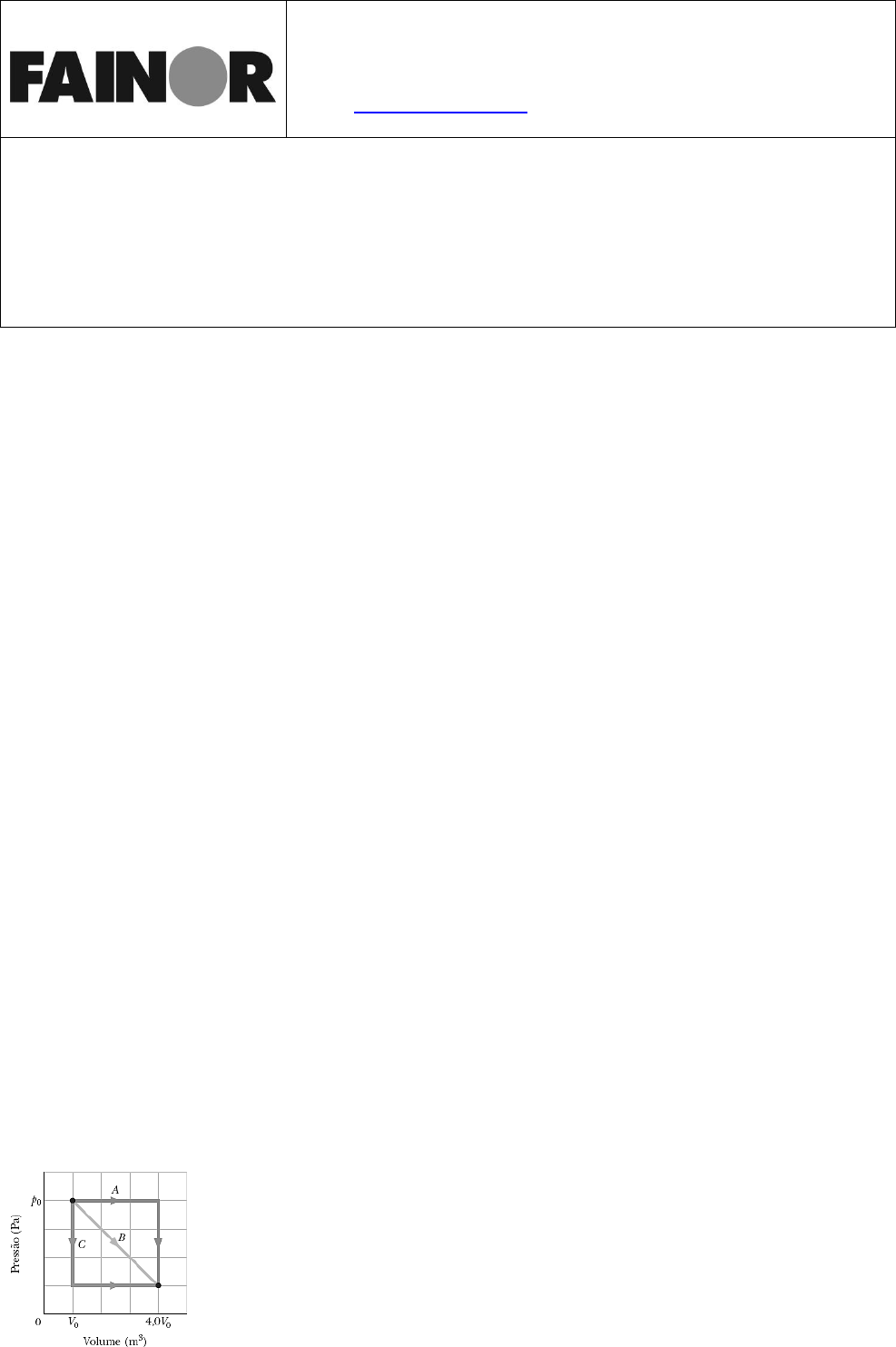 Faculdade Independente do Nordeste – FAINOR Av. Luís Eduardo Magalhães, 1305 – Candeias Vitória da Conquista – BA Email: fainor@fainor.com.br www.fainor.com.br Curso: Eng. Produção/Elétrica Semestre: III Disciplina: Física Geral e Experimental II Professor: Cleberson R. Alves Valor: 2,0 Unidade: 1ª Alunos(as): _____________________________________________________ _____________________________________________________ LISTA EXERCÍCIOS (Questão 01) Em uma escala linear de temperatura X, a água congela a –125,0°X e evapora a 375,0°X. Em uma escala linear de temperatura Y, a água congela a –70,00°Y e evapora a 230,00°Y. Uma temperatura de 50,00°Y corresponde a que temperatura na escala X? (Questão 02) Um furo circular em uma placa de alumínio tem 2,725 cm de diâmetro a 0,000°C. Qual é o diâmetro do furo quando a temperatura da placa é aumentada para 100,0°C? (Questão 03) Determine a variação de volume de uma esfera de alumínio com um raio inicial de 10 cm quando a esfera é aquecida de 0,0°C para 100°C. (Questão 04) A 20 °C, uma barra tem exatamente 20,05 cm de comprimento, de acordo com uma régua de aço. Quando a barra e a régua são colocadas em um forno a 270°C, a barra passa a medir 20,11 cm de acordo com a mesma régua. Qual é o coeficiente de expansão linear do material de que é feita a barra? (Questão 05) Uma substância tem uma massa de 50,0 g/mol. Quando 314 J são adicionados na forma de calor a uma amostra de 30,0 g da substância, a temperatura sobe de 25,0°C para 45,0°C. (a) Qual é o calor específico e (b) qual é o calor específico molar da substância? (c) Quantos mols estão presentes na amostra? (Questão 06) Que massa de água permanece no estado líquido depois que 50,2 kJ são transferidos em forma de calor a partir de 260 g de água inicialmente no ponto de congelamento? (Questão 07) (a) Dois cubos de gelo de 50 g são misturados com 200 g de água em um recipiente termicamente isolado. Se a água está inicialmente a 25°C e o gelo foi removido de um congelador a –15°C, qual é a temperatura final em equilíbrio térmico? (b) Qual será a temperatura final se for usado apenas um cubo de gelo? (Questão 08) Na figura, uma amostra de gás se expande de V0 para 4,0V0 enquanto a pressão diminui de p0 para p0/4,0. Se V0 = 1,0 m3 e p0 = 40 Pa, qual é o trabalho realizado pelo gás se a pressão varia com o volume de acordo (a) com a trajetória A, (b) com a trajetória B e (c) com a trajetória C? (Questão 09) Um gás em uma câmara fechada passa pelo ciclo mostrado no diagrama p x V da figura. A escala do eixo horizontal é definida por Vs = 4,0 m3. Calcule a energia adicionada ao sistema na forma de calor durante um ciclo completo. (Questão 10) Um trabalho de 200 J é realizado sobre um sistema, e uma quantidade de calor de 70,0 cal é removida do sistema. Qual é o valor (incluindo o sinal) (a) de W, (b) de Q e (c) de ΔEint? (Questão 11) O teto de uma casa em uma cidade de clima frio deve ter uma resistência térmica R de 30 m2·K/W. Para isso, qual deve ser a espessura de um revestimento (a) de espuma de poliuretano e (b) de prata? (Questão 12) Considere uma placa de lado L = 25,0 cm, área A = 90,0 cm2 e que o material é o cobre. Se TQ = 125°C, TF = 10,0°C e o sistema está no regime estacionário, determine a taxa de condução de calor pela placa.