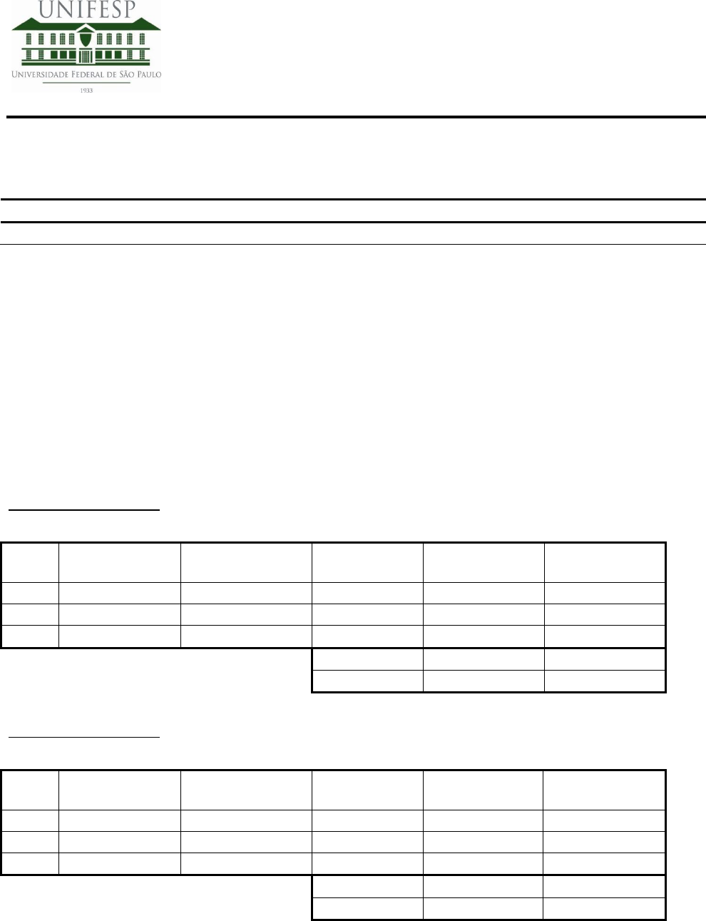 UNIVERSIDADE FEDERAL DE SÃO PAULO - Campus Diadema QUÍMICA ANALÍTICA GERAL II EXPERIMENTO 1 CALIBRAÇÃO DE MATERIAL DE VIDRO VOLUMÉTRICO ALUNOS 1 2 RESULTADOS: Temperatura ambiente (Tamb): oC Fator de conversão: mL/g (Tamb) mL/g (20 oC) a) Calibração do balão volumétrico Capacidade do balão: mL Resultados da calibração do balão Teste Massa do balão vazio (g) Massa do balão+ água (g) Massa de água(g) V corrigido (mL) (Tamb ) V corrigido (mL) (20 oC) 1 2 3 Vol. médio D. Padrão (s) Capacidade do balão: mL Resultados da calibração do balão Teste Massa do balão vazio (g) Massa do balão+ água (g) Massa de água(g) V corrigido (mL) (Tamb ) V corrigido (mL) (20 oC) 1 2 3 Vol. médio D. Padrão (s) b) Calibração de pipetas volumétricas Capacidade da pipeta: mL Resultados da calibração da pipeta Teste Massa do béquer vazio (g) Massa do béquer + água (g) Massa de água(g) V corrigido (mL) (Tamb ) V corrigido (mL) (20 oC) 1 2 3 Vol. médio D. Padrão (s) Capacidade da pipeta: mL Resultados da calibração da pipeta Teste Massa do béquer vazio (g) Massa do béquer + água (g) Massa de água(g) V corrigido (mL) (Tamb ) V corrigido (mL) (20 oC) 1 2 3 Vol. médio D. Padrão (s) Capacidade da pipeta: mL Resultados da calibração da pipeta Teste Massa do béquer vazio (g) Massa do béquer + água (g) Massa de água(g) V corrigido (mL) (Tamb ) V corrigido (mL) (20 oC) 1 2 3 Vol. médio D. Padrão (s) c) Calibração de bureta (50 mL) 1º. Volume da bureta: mL Resultados da calibração da pipeta Teste Massa do béquer vazio (g) Massa do béquer + água (g) Massa de água(g) V corrigido (mL) (Tamb ) V corrigido (mL) (20 oC) 1 2 3 Vol. médio D. Padrão (s) 2º. Volume da bureta: mL Resultados da calibração da pipeta Teste Massa do béquer vazio (g) Massa do béquer + água (g) Massa de água(g) V corrigido (mL) (Tamb ) V corrigido (mL) (20 oC) 1 2 3 Vol. médio D. Padrão (s) 3º. Volume da bureta: mL Resultados da calibração da pipeta Teste Massa do béquer vazio (g) Massa do béquer + água (g) Massa de água(g) V corrigido (mL) (Tamb ) V corrigido (mL) (20 oC) 1 2 3 Vol. médio D. Padrão (s) 4º. Volume da bureta: mL Resultados da calibração da pipeta Teste Massa do béquer vazio (g) Massa do béquer + água (g) Massa de água(g) V corrigido (mL) (Tamb ) V corrigido (mL) (20 oC) 1 2 3 Vol. médio D. Padrão (s) 5º. Volume da bureta: mL Resultados da calibração da pipeta Teste Massa do béquer vazio (g) Massa do béquer + água (g) Massa de água(g) V corrigido (mL) (Tamb ) V corrigido (mL) (20 oC) 1 2 3 Vol. médio D. Padrão (s) QUESTÕES: 1. Calcular o volume dos materiais volumétricos na temperatura ambiente da medida e a 20º.C. 2. Expressar os volumes reais médios com a incerteza absoluta associada (desvio padrão). 3. Qual é o erro sistemático dos materiais utilizados? Mostrar os cálculos. 4. Que tipo de erro foi eliminado após o processo de calibração? Comente. 5. Após a calibração, a incerteza no volume é um erro sistemático ou aleatório? Comente. 6. Se as pipetas calibradas forem usadas para dispensar 3 volumes sucessivos, quais serão os volumes totais dispensados e suas respectivas incertezas absolutas? 7. Quais as principais fontes de incertezas em medidas volumétricas? Como seria possível, considerando o valor da incerteza para todas as fontes, estimar o valor de uma incerteza combinada? 8. Qual a relação entre a equação do empuxo (flutuabilidade) e o volume de 1g de água? 9. Faça um gráfico relacionando os volumes medidos pela bureta a 20º C e o respectivo volume aparente.