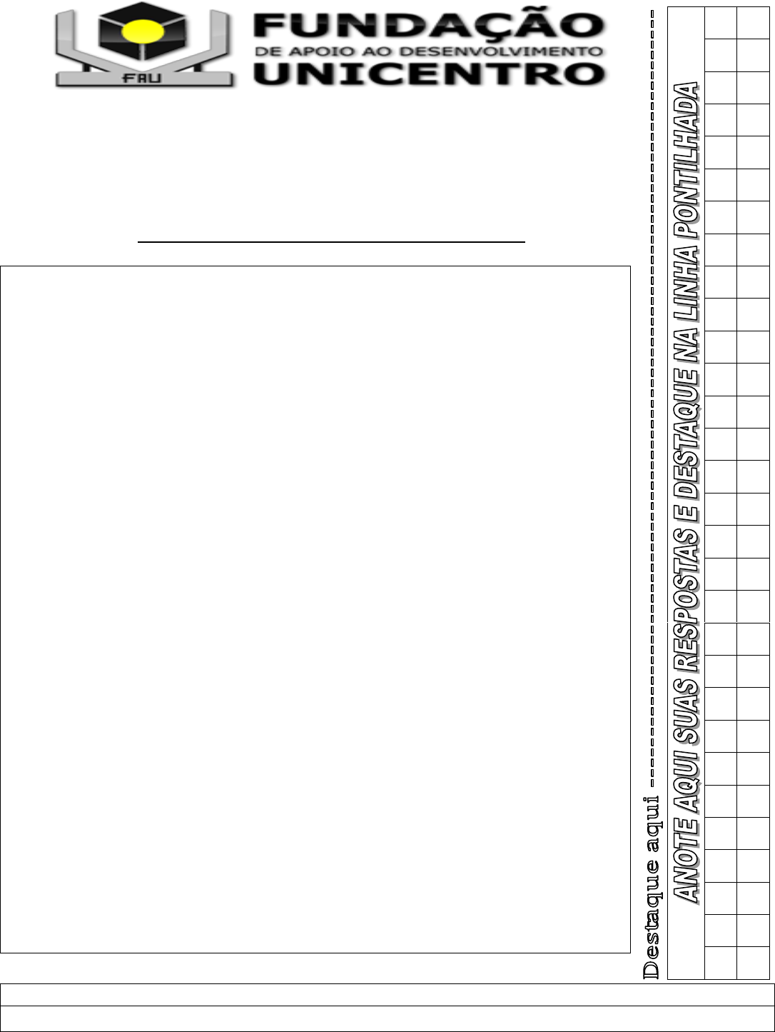 CONCURSO PÚBLICO DA PREFEITURA MUNICIPAL DE PIRAQUARA-PR - EDITAL 058/2016 DATA DA PROVA: 08/05/2016 PERÍODO DA PROVA: MANHÃ CARGO: AGENTE OPERACIONAL 3 0 2 9 2 8 2 7 2 6 2 5 2 4 2 3 2 2 2 1 2 0 1 9 1 8 1 7 1 6 1 5 1 4 1 3 1 2 1 1 1 0 0 9 0 8 0 7 0 6 0 5 0 4 0 3 0 2 0 1 LEIA AS INSTRUÇÕES ABAIXO ANTES DE COMEÇAR A PROVA: Verifique se este caderno de questões corresponde ao cargo que você concorre e se ele contém 30 (trinta) questões de múltipla escolha, com 5 alternativas (a,b,c,d,e) de resposta para cada uma, correspondentes à prova objetiva. Caso o caderno esteja incompleto, tenha qualquer defeito ou apresente alguma divergência ao cargo que você concorre, solicite ao fiscal de sala que tome as providências cabíveis, pois não serão aceitas reclamações posteriores nesse sentido; No momento da identificação, verifique o cartão resposta, se as informações relativas a você estão corretas. Caso haja algum dado a ser retificado, peça ao fiscal de sala para corrigir em Ata; Você dispõe de 3 (três) horas para fazer a prova objetiva; Na duração da prova, está incluído o tempo destinado à entrega do material de prova e ao preenchimento do cartão resposta; Você deve deixar sobre a carteira apenas o documento de identidade e a caneta esferográfica de tinta azul ou preta; NÃO É PERMITIDO DURANTE A REALIZAÇÃO DA PROVA: a) equipamentos eletrônicos como máquinas calculadoras, MP3, MP4, telefone celular, tablets, notebook, gravador, máquina fotográfica, controle de alarme de carro e/ou qualquer aparelho similar; b) livros, anotações, réguas de cálculo, dicionários, códigos e/ou legislação, impressos que não estejam expressamente permitidos ou qualquer outro material de consulta; c) relógio de qualquer espécie, óculos escuros ou quaisquer acessórios de chapelaria, tais como chapéu, boné, gorro etc; É proibido fazer anotação de informações relativas às suas respostas no comprovante de inscrição e(ou)em qualquer outro meio, que não os permitidos; Não se comunique com outros candidatos nem se levante sem autorização; Somente após decorrida 1 (uma) hora do início da prova, você poderá se retirar da sala de aplicação de prova; Ao terminar a prova, chame o fiscal de sala, devolva-lhe o caderno de prova, o cartão resposta devidamente assinado e deixe o local de prova. Você poderá levar consigo o caderno de questões, desde que permaneça na sala até o final de período das 3 (três) horas; A desobediência a qualquer uma das determinações constantes em edital, no presente caderno de prova e no cartão resposta poderá implicar na anulação da sua prova; Tenha calma para não prejudicar seu desempenho e boa prova. NÚMERO DA INSCRIÇÃO: NOME COMPLETO: 2 Curiosa palavra. Idoso. O que acumulou idade. Também tem o sentido de quem se apega à idade. Ou que a esbanja (como gostoso ou dengoso). Se é que não significa alguém que está indo, alguém em processo de ida. Em contraste com os que ficam, os ficosos... Preciso começar a agir como um idoso. Dizem que, entre eles, idoso não fala em quem chega à velhice como alguém que está à beira do túmulo. Dizem que está na zona de rebaixamento. Vou ter que aprender o jargão da categoria. Luís Fernando Veríssimo 01) Em todas as alternativas o significado das palavras destacadas está adequado ao texto, EXCETO em: (A) “...o sentido de quem se apega à idade.” (= AGARRA). (B) “Ou que a esbanja...” (= POUPA). (C) “Ou que a esbanja (como gostoso ou dengoso).” (= MANHOSO). (D) “Vou ter que aprender o jargão da categoria.” (= GÍRIA). (E) “Também tem o sentido de quem se apega à idade.” (= AGARRA). 02) As palavras pontiagudo, gostoso e enobrecer são formadas, respectivamente, pelos seguintes processos de formação de palavras: (A) Composição por aglutinação - derivação sufixal - derivação parassintética. (B) Derivação sufixal - derivação sufixal - derivação prefixal e sufixal. (C) Composição por justaposição - derivação imprópria - derivação prefixal. (D) Derivação prefixal e sufixal - derivação sufixal - composição por aglutinação. (E) Derivação prefixal - composição por aglutinação - derivação imprópria. 03) A frase que NÃO está de acordo com a norma padrão escrita da língua, encontra-se na opção: (A) Dê-me ao menos um porquê para sua atitude. (B) Discutimos acerca de uma melhor saída para o caso. (C) Considere-se benvindo a esta equipe. (D) Devido ao mau tempo, não fomos acampar na cachoeira. (E) Toda a produção agrícola das margens dos rios foi destruída pela enchente. 04) Considerando a norma culta, está INCORRETA quanto à concordância nominal seguinte frase: (A) Você sempre teve bastantes amigos leais. (B) O contribuinte estava quite com a Receita Federal. (C) No jogo, não foi permitido a entrada de crianças menores de 10 anos. (D) Seguem anexas às cartas minhas poesias para você. (E) Caminhada pela manhã é bom para a saúde. 05) Identifique a alternativa que preenche, CORRETA e respectivamente, as lacunas das frases abaixo: I - Mesmo com toda a vigilância, houve ______________ rombos no orçamento. II - Ele não reagiu à provocação porque tem bom _________. III - Os vereadores discutiram a ______________ de terrenos públicos aos desabrigados das últimas chuvas. (A) Vultuosos – censo – sessão. (B) Vultuosos – senso – cessão. (C) Vultosos – senso – cessão. (D) Vultosos – censo – seção. (E) Vultuosos – senso – seção. 06) Em que tempo do subjuntivo estão os verbos falasse, cantarolasse e batesse? (A) Pretérito perfeito. (B) Pretérito imperfeito. (C) Presente. (D) Futuro do presente. (E) Pretérito mais que perfeito. 07) Determine a opção em que as frações estão em ordem correta: (A) (B) (C) (D) (E) Nenhuma das alternativas anteriores. 3 08) A negação lógica à afirmativa abaixo encontra-se em qual opção? “Nenhuma calça de João é azul”. 