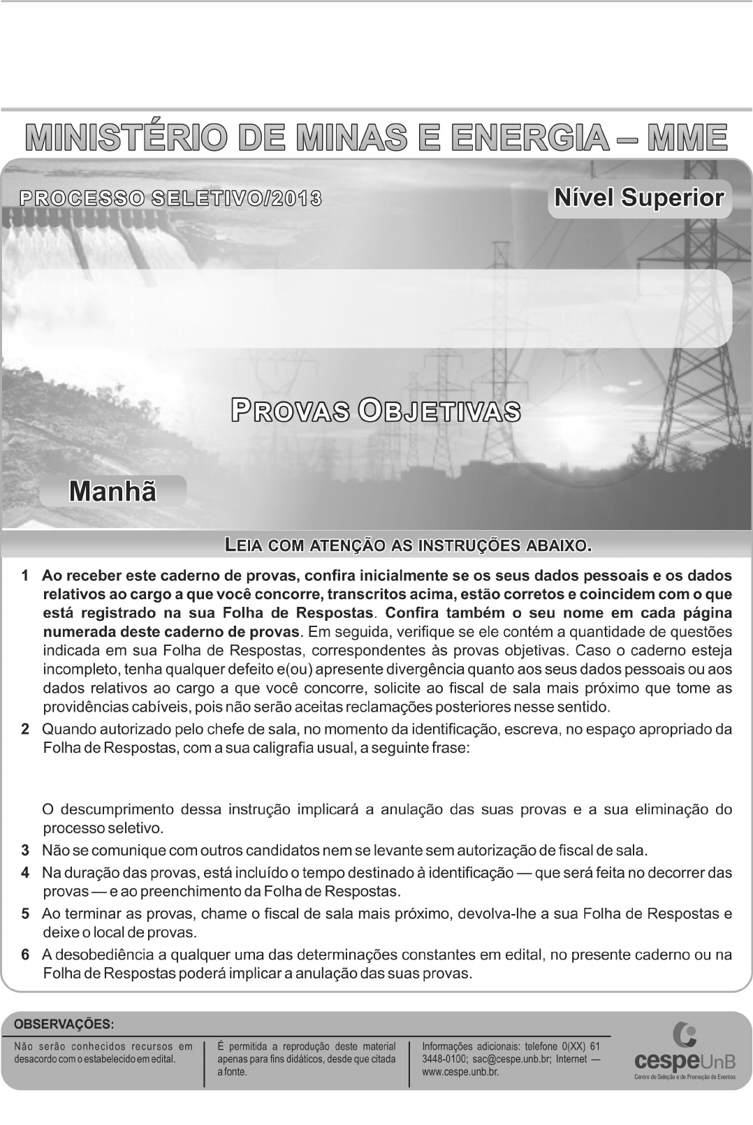 ||MME13_CBNS_01N773340|| UnB/CESPE – MME/2013 Nas questões a seguir, marque, para cada uma, a única opção correta, de acordo com o respectivo comando. Para as devidas marcações, use a Folha de Respostas, único documento válido para a avaliação das suas respostas. CONHECIMENTOS BÁSICOS Texto para as questões de 1 a 5 Há quarenta anos, começavam as obras civis da usina1 de Itaipu, a maior hidrelétrica do mundo, no rio Paraná, construída na divisa entre Brasil e Paraguai por um consórcio das mais importantes empreiteiras nacionais. Suas turbinas4 iniciaram o fornecimento de energia aos dois países em 1984. Logo, Itaipu passou a fazer parte da lista universal das sete maravilhas construídas pela mão do homem no século XX.7 Itaipu, ou pedra que canta, é a denominação em guarani do local onde foi erguida a barragem, poucos quilômetros acima das cataratas do rio Iguaçu, principal10 afluente na margem esquerda. A hidrelétrica, que começou a operar dois anos após o término da construção, é responsável pelo fornecimento de 17,3% da energia consumida hoje no13 Brasil e 72,5% do consumo paraguaio. A capacidade instalada de geração da usina é de 14 GW, com vinte unidades geradoras que fornecem, cada uma, 700 MW. Suas turbinas produzem16 entre 90 e 94-95 milhões de MWh, anualmente, uma oferta de energia superior à que vem conseguindo a hidrelétrica chinesa de Três Gargantas, a maior do mundo em capacidade de19 geração, mas cujo recorde de fornecimento foi de 79,5 milhões de MWh em 2009, atrás do recorde da nossa Itaipu, que gerou 94.684.781 MWh em 2008. No ano de 2012, Itaipu produziu22 98.287.128 MWh, quebrando seu próprio recorde mundial de produção de energia. É interessante notar que uma realização dessa natureza25 não desperta entusiasmo (pelo menos alguma curiosidade deveria...) nos ativistas de organizações que se apresentam como defensores do meio ambiente e participam, em pleno28 século XXI, de campanhas financiadas do exterior para impedir a expansão da oferta de energia limpa entre nós. Basta sentir o seu desinteresse (fruto da ignorância, talvez) em comemorar o31 fato de que a energia limpa conduzida por milhares de quilômetros a partir da usina de Itaipu corresponde a eliminar a sujeira de 500 mil barris de petróleo, que teriam de ser34 consumidos diariamente para atender à demanda nas regiões Sudeste, Sul e Centro-Oeste do Brasil e no leste paraguaio. Antonio Delfim Netto. A pedra que canta. Coluna Sextante. In: Carta Capital, ano XVIII, n.º 733, 30/1/2013, p. 33 (com adaptações). QUESTÃO 1 Acerca das características e dos argumentos do texto, assinale a opção correta. A O texto contém elementos que o inserem no âmbito do gênero opinativo. B Segundo o autor, a usina de Itaipu iguala-se à hidrelétrica de Três Gargantas no quesito capacidade de geração de energia. C No texto, o autor defende que a usina hidrelétrica de Itaipu, brasileira, é maior em tamanho e em capacidade de geração de energia se comparada à hidrelétrica chinesa de Três Gargantas. D O foco argumentativo do texto recai sobre o acordo entre o governo brasileiro e o paraguaio para a construção da usina hidrelétrica de Itaipu. E Segundo o autor, a hidrelétrica de Itaipu, embora seja a maior do mundo, não consegue suprir as necessidades da matriz energética brasileira. QUESTÃO 2 Considerando as informações e os argumentos apresentados no texto, assinale a opção correta. A Infere-se do texto que a usina hidrelétrica de Itaipu começou a ser construída na década de 70 do século passado. B As opiniões do autor, que estão, no texto, entre parênteses, indicam que ele é contrário à criação de organizações em defesa do meio ambiente. C A usina de Itaipu é, atualmente, a única responsável pela geração da energia que é fornecida aos consumidores brasileiros e paraguaios. D De acordo com o texto, na usina de Itaipu existem vinte unidades geradoras de energia, que fornecem 700 MW cada uma, do que se depreende que o total de potência instalada é de 20.000 MW. E Segundo o texto, há uma disputa acirrada entre a usina de Itaipu e a de Três Gargantas, na tentativa de se bater o recorde mundial como a maior hidrelétrica do mundo. QUESTÃO 3 No que diz respeito aos aspectos gramaticais e à coerência do texto, assinale a opção correta. A O elemento “construídas” (R.7) refere-se a “obras civis” (R.1). B O elemento “Suas” (R.4) faz referência, no texto, a “usina de Itaipu” (R.1-2). C A palavra “fornecimento” (R.5) poderia ser substituída por comercialização, sem se provocar erro sintático-semântico no trecho em que se insere. D Na linha 1, a forma “Há” pode ser substituída tanto por A quanto por À, sem prejuízo para a correção gramatical do período. E O trecho “Há quarenta anos, começavam as obras civis da usina de Itaipu, a maior hidrelétrica do mundo, no rio Paraná” (R.1-2) poderia ser reescrito, com correção gramatical, da seguinte forma: Começavam há quarenta anos no rio Paraná, as obras civis da maior hidrelétrica do mundo, a usina de Itaipu. QUESTÃO 4 Com referência às ideias e aos aspectos gramaticais do texto, assinale a opção correta. A No texto, os termos “barragem” (R.9) e “usina” (R.1) se confundem, designando o mesmo elemento. B Mantendo-se a correção gramatical e a coerência textual, a palavra “construídas” (R.7) poderia ser flexionada no singular, pois passaria a ter como referente “lista universal” (R.6). C De acordo com os sentidos do texto, a frase “pedra que canta” (R.8) constitui o significado do nome “Itaipu”. D No texto, o segmento “no século XX” (R.7) poderia ser deslocado para depois de “Logo” (R.6), o que preservaria a correção gramatical do período. E O elemento “onde” (R.9) poderia ser substituído, no texto, pela expressão aonde, sem prejuízo gramatical. – 1 – ||MME13_CBNS_01N773340|| UnB/C