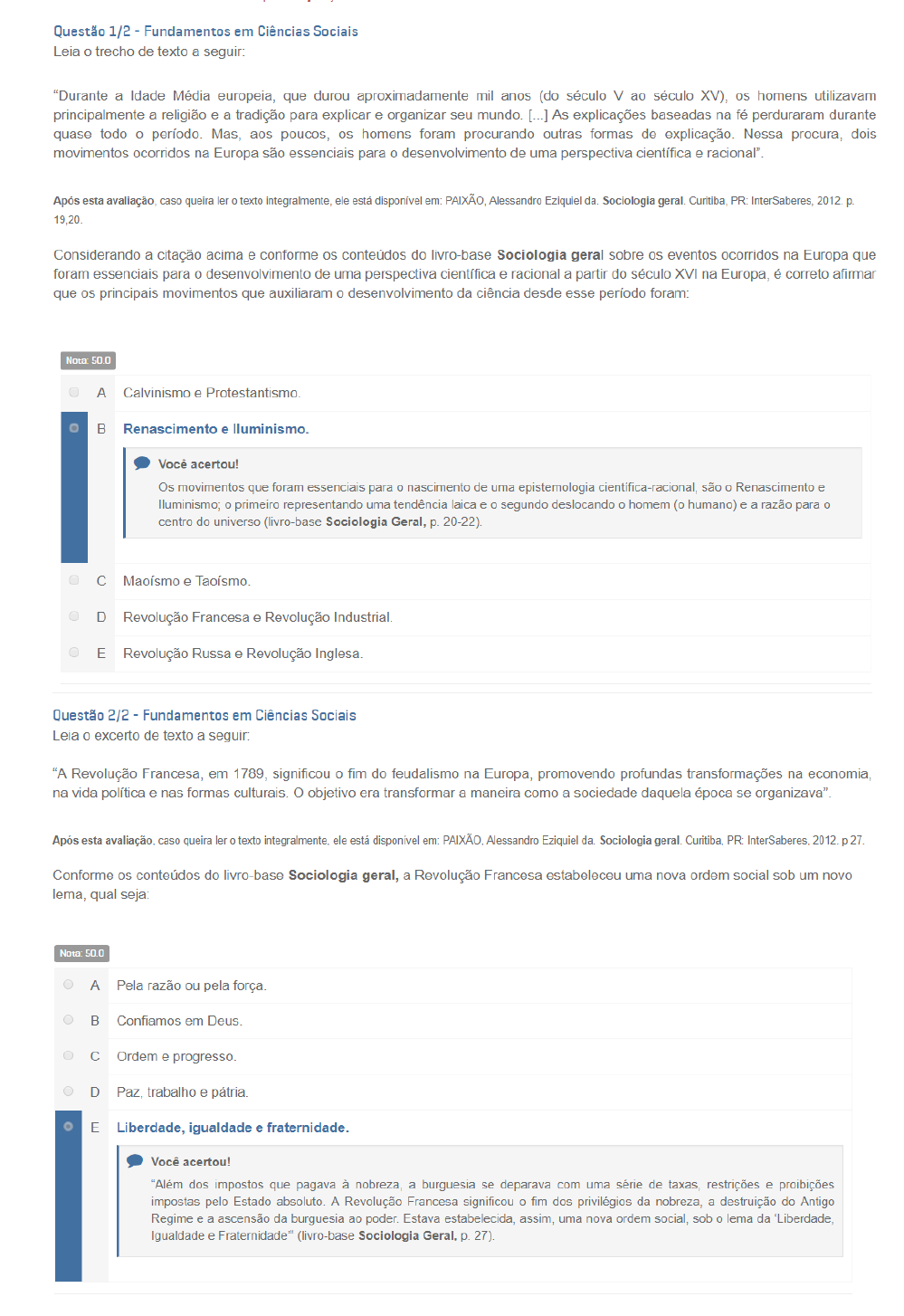 Questão 1/5 - Fundamentos em Ciências Sociais Leia a seguinte citação: “Assim como na vida mental, a consciência coletiva é feita de representações que transcendem a esfera individual, por sua superioridade, e atua com força sobre as consciências individuais. A consciência coletiva é fruto de pequenas contribuições individuais, que juntas, formam o todo, não sendo fruto de teorias metafísicas, mas de fatos sociais reais”. Após esta avaliação, caso queira ler o texto integralmente, ele está em: MACHADO, Geraldo Magela. Consciência Coletiva. Disponível em: http://www.infoescola.com/sociologia/consciencia-coletiva/. Acesso em: 27de set. 2016. Considerando a citação acima e os conteúdos do livro-base Sociologia Geral sobre consciência coletiva, é correto afirmar que: A a produção na sociedade capitalista se dá porque capitalistas e trabalhadores entram em uma relação de complementaridade. B a maneira como os homens produzem a materialidade do mundo condiciona a vida social. C a consciência coletiva tem como substrato o social o coletivo e não o individual. É como se pairasse sobre a sociedade como nuvem que fornece aos indivíduos os modos de pensar, de agir e de sentir, os hábitos e as maneiras de fazer, de entender e de falar. D a consciência coletiva pressupõe que somente o indivíduo é dotado de um grau de intencionalidade capaz de ser apreendido nas situações estudadas. E o indivíduo forma suas posições e preferências sem a influência da consciência coletiva. Questão 2/5 - Fundamentos em Ciências Sociais Leia o excerto a seguir: “Historicamente, o processo de racionalização econômica levou à eliminação dos recursos (inclusive humanos) ineficientes. O propósito do esforço humano deixou de ser a simples produção e passou a ser o dever de trabalhar, conduzindo ao ascetismo da contenção e do consumo. Esse conjunto de resultantes, Weber chama de ‘espírito do capitalismo’". Após esta avaliação, caso queira ler o texto integralmente, ele está disponível em: THIRY-CHERQUES, Hermano Roberto. Max Weber: o processo de racionalização e o desencantamento do trabalho nas organizações contemporâneas, p. 903. Disponível em: http://www.scielo.br/pdf/rap/v43n4/v43n4a07.pdf. Acesso em: 27 de set. 2016, O “espírito do capitalismo” é o nome que Max Weber dá ao conjunto de fenômenos englobados pela ideia do dever de trabalhar, do ascetismo do consumo e da contenção, “espírito” que torna-se possível por causa de uma ética específica. Considerando o excerto e o conteúdo do livro-base Sociologia Geral, esta ética é a. A ética católica. B ética do trabalho. C ética protestante. D ética formal. E ética intelectualista. Questão 3/5 - Fundamentos em Ciências Sociais Leia o seguinte fragmento de texto: “Obtém-se um tipo ideal mediante acentuação unilateral de um ou vários pontos de vista, e mediante o encadeamento de grande quantidade de fenômenos isoladamente dados, difusos e discretos, que se podem dar em maior ou menor número ou mesmo faltar por completo, e que se ordenam segundo os pontos de vista unilateralmente acentuados, a fim de se formar um quadro homogêneo do pensamento”. Após esta avaliação, caso queira ler o texto integralmente, ele está disponível em: WEBER, Max. Ensaios sobre a teoria das Ciências Sociais. São Paulo: Centauro, 2003. p. 50. A partir do fragmento de texto anterior, analise as alternativas abaixo, sobre as tipologias de ações sociais utilizadas por esse autor, conforme apresentado no livro-base Sociologia geral. Assinale aquela que elenca as tipologias de forma correta: A Racional com relação a fins; mecânica e tradicional. B Mecânica e afetiva. C Racional com relação a fins; racional com relação a valores; afetiva; tradicional. D Irracional com relação a fins; tradicional; mecânica. E Irracional com relação a valores; mecânica e afetiva. Questão 4/5 - Fundamentos em Ciências Sociais Observe a citação a seguir: Serve “[...] como parâmetro de observação, um conceito teórico abstrato com características delineadas que serve apenas como ponto de comparação entre o objeto observado e a abstração teórica”. Após esta avaliação, caso queira ler o texto integralmente, ele está disponível em: RODRIGUES, Lucas De Oliveira. "Introdução à teoria de Max Weber"; Brasil Escola. Disponível em <http://brasilescola.uol.com.br/sociologia/introducao-teoria-max-weber.htm>. Acesso em 27 de set. de 2016. Considerando a citação e o conteúdo do livro-base Sociologia Geral, o recurso metodológico utilizado por Weber para análise da ação social é: A a racionalização. B o tipo ideal. C a relação social. D o sentido. E a interpretação. Questão 5/5 - Fundamentos em Ciências Sociais Leia o excerto abaixo: “O próprio Marx já havia sugerido que o desenvolvimento geral da ciência e do progresso tecnológico - a utilização do conhecimento científico-tecnológico na produção capitalista - torna-se o motor da criação da riqueza efetiva. E esta é cada vez menos dependente do tempo de trabalho”. Após esta avaliação, caso queira ler o texto integralmente, ele está em: BRUNIERA, Celina Fernandes Gonçalves Marx e a divisão do trabalho: A alienação do trabalho. Disponível em: http://educacao.uol.com.br/disciplinas/sociologia/marx-e-a-divisao-do-trabalho-a-alienacao-do-trabalho.htm. Acesso em: 27 de set. 2016. Com base no excerto citado e no conteúdo do livro-base Sociologia Geral sobre o interesse científico de Marx, é correto afirmar que: A visava ao conhecimento de uma totalidade – a sociedade capitalista -, e o fundamento da busca por essa totalidade está na relação entre o homem e suas obras. B buscava a compreensão das formas de ação social manifestadas pelas diferentes sociedades. C procurou compreender como se organizavam os sistemas religiosos e como exerciam influência na sociedade; D objetivou estab
