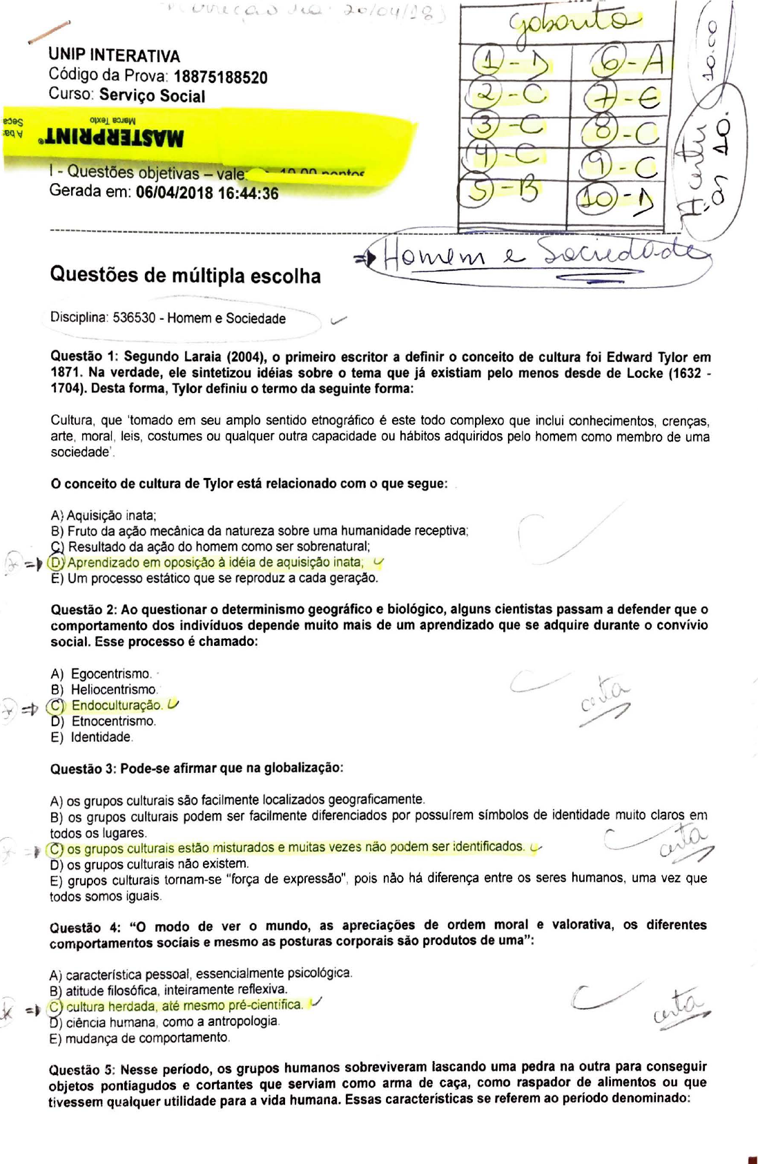 l. ' / l ( <-, ._ \ 1 \~ / UNIP INTERATIVA Código da Prova: 18875188520 Curso: Serviço Social 01)(•1~ • .LNlltlll!SYW 1 - Questões objetivas - vale:'"""" .u~ "" ...... "."" Gerada em: 06/04/2018 16:44:36 ------------------------------------------------------------------ Questões de múltipla escolha Disciplina: 536530 - Homem e Sociedade v ------- \tv\.Q \IV\ Questão 1: Segundo Laraia (2004), o primeiro escritor a definir o conceito de cultura foi Edward Tylor em 1871 . Na verdade, ele sintetizou idéias sobre o tema que já existiam pelo menos desde de Locke (1632 - 1704). Desta forma, Tylor definiu o termo da seguinte forma: Cultura, que 'tomado em seu amplo sentido etnográfico é este todo complexo que inclui conhecimentos, crenças, arte, moral, leis, costumes ou qualquer outra capacidade ou hábitos adquiridos pelo homem como membro de uma sociedade'. O conceito de cultura de Tylor está relacionado com o que segue: A) Aquisição inata; 8) Fruto da ação mecânica da natureza sobre uma humanidade receptiva; ,,-. _Q Resultado da ação do homem como ser sobrenatural; \.. -;:;.. ► @Aprendizado em oposição à idéia de aquisição inata, v E) Um processo estático que se reproduz a cada geração. Questão 2: Ao questionar o determinismo geográfico e biológico, alguns cientistas passam a defender que o comportamento dos indivíduos depende muito mais de um aprendizado que se adquire durante o convívio social. Esse processo é chamado: A) Egocentrismo. · 8) Heliocentrismo. :;- ::::p (é} Endoculturação. l/ J 1:5) Etnocentrismo. r E) Identidade. Questão 3: Pode-se afirmar que na globalização: A) os grupos culturais são facilmente localizados geograficamente. B) os grupos culturais podem ser facilmente diferenciados por possulrem símbolos de identidade muito claros em todos os lugares. r- / --r 0-, ► rc} os grupos culturais estão misturados e muitas vezes não podem ser identificados. v ___,--~ D) os grupos culturais não existem. E) grupos culturais tornam-se "força de expressão", pois não há diferença entre os seres humanos, uma vez que todos somos iguais. Questão 4: "O modo de ver o mundo, as apreciações de ordem moral e valorativa, os diferentes comportamentos sociais e mesmo as posturas corporais são produtos de uma": Aj caracterlstica pessoal, essencialmente psicológica. ~ atitude filosófica, inteiramente reflexiva. _k ~; cultura herdada, até mesmo pré-cie~tifica . .-/ ) ciência humana, como a antropologia. E) mudança de comportamento. Questão s: Nesse período, os grupos humanos sobreviveram lascando uma pedra na outra para conseguir objetos pontiagudos e cortantes que serviam como arma de caça, como raspador de alimentos ou que tivessem qualquer utilidade para a vida humana. Essas características se referem ao período denominado: • ~ Neolítico. t B) Paleolítico ./ C) Metalizaçao. O) Revoluçao agrícola. E) Pré-histórico Questão 6: Assinale a alternativa que melhor define o que é endoculturação. /.'). ~ PJ Processo por meio do qual se apreende a cultura. v . B) Processo por meio do qual se apreendem os instintos. G- C) Processo por meio do qual se apreendem a cultura e os instintos. D) Processo idêntico à socializaçao, a mesma coisa. E) Processo que permite o tratamento, basicamente, econômico da sociedade. Questão 7: Podemos observar que o contato com uma cultura diferente de seu grupo social de origem, pode ter alguns e!eitos sobre os indivíduos. Entre esses efeitos está o processo que é conhecido como ACULTURAÇAO. Esse conceito pode ser explicado como segue: .,.,, A) É a capacidade que uma cultura desenvolve no sentido de manter intactos seus próprios valores e saberes tradicionais, mesmo quando em contato com a diversidade cultural. B) Pode ser explicado como o processo de tornar os indivíduos membros de um grupo social; todos nós somos modelados de acordo com a expectativa do meio social em que crescemos. \.-- C) Esse conceito descreve a atual situaçao decorrente da globalizaçao, em que os países do mundo todo se ,t influenciam mutuamente e em igual medida em seus hábitos e valores culturais. 1} O) É o processo de reforço das tradições de uma cultura, quando todos os indivíduos se recusam a ser influenciados ./'J _p_Qr outros grupos soc1a1s, isolando-se culturalmente. - / ::f .__§) É o processo de perda das tradições dentro de um grupo social, quando seus indivíduos passam a adotar sistematicamente um modelo de comportamento e valores de uma cultura alheia, de fora. v Questão 8: Clifford Geertz, em 1973 definiu para a antropologia o conceito de cultura conforme a frase abaixo: ··cultura é um sistema simbólico, característica fundamental e comum da humanidade de atribuir, de forma sistemática, racional e estruturada, significados e sentidos às coisas do mundo". Assim sabemos que todas as culturas dependem da criação de simbolos para a nossa comunicação e compreensão do mundo que nos cerca. Sobre os símbolos, assinale a alternativa correta: A) Cada cultura tem um conjunto de símbolos que lhe é própria, e não é possível encontrarmos um mesmo símbolo em duas culturas diferentes. / B) A simbolização pode ser compreendida como uma forma de evolução cultural, assim, quanto mais símbolos tem "-:zr,v ' uma cultura, mais evoluída ela se encontra. (.,_,.-} -::\; C) Apesar dos símbolos serem próprios a cada cultura, alguns slmbolos atualmente são encontrados em muitas / ctílturas diferentes, isso é conseqüência principalmente da circulação de bens no mercado e das trocas culturais,, entre diferentes povos. V O) Apenas as religiões conseguem que seus símbolos se espalhem em diferentes culturas mantendo o mesmo significado; já o mercado consumidor de bens depende que cada cultura crie e divulgue seus próprios slmbolos. E) Os slmbolos das culturas dominantes economicamente são menos interessantes e originais que os slmbolos das culturas mais tradicionais e isoladas