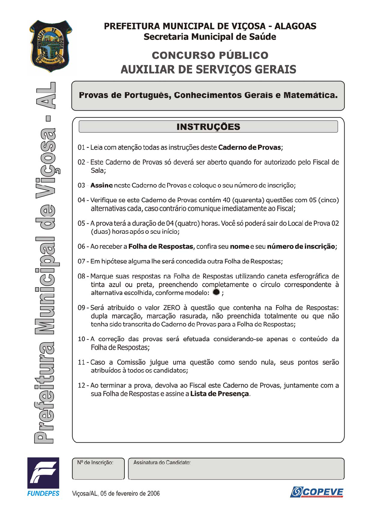 19/06/2005 Vestibular CESAMA 2005/2 1 www.pciconcursos.com.br 05/02/2006 PMV-2006 – Auxiliar de Serviços Gerais 2 PORTUGUÊS 01. Assinale a alternativa que completa corretamente as lacunas da construção a seguir. Ao término do ............... , os servidores se ............... com o chefe para ............... um aumento. A) expediente – reunirão – sugeri B) espediente – reuniram – sugerir C) expediente – reunirão – sugerir D) expediente – reunirão – sujerir E) espediente – reuniram – sugeri 02. Assinale a alternativa que completa corretamente as lacunas da construção a seguir. Se você não ....... com ......, será ...... . A) reagir – firmeza – tripudiado B) reagi – firmeza – tripudiado C) reagir – firmesa – tripudiado D) reagir – firmeza – tripudeado E) reajir – firmesa – tripudeado 03. Assinale a alternativa que completa corretamente as lacunas da construção a seguir. Coloque o ............... na ............... com ............... . A) cafezinho – chícara – açúcar B) cafezinho – xícara – açúcar C) cafesinho – xícara – açúcar D) cafezinho – xícara – açucar E) cafézinho – chícara – açucar 04. Qual das alternativas completa corretamente as lacunas das construções a seguir? I. Ele tem cara de ....... . II. Pratique o bem e evite o ....... . III. Ele sempre foi ....... pagador. IV. ....... saiu de casa, a chuva começou. A) mau – mau – mal – Mau B) mau – mal –mal – Mal C) mal – mau – mal – Mal D) mau – mal – mau – Mau E) mau – mal – mau – Mal 05. Preencha convenientemente as lacunas das construções seguintes e indique a seqüência obtida. I. O meu irmão agiu com muita ...... . II. Na ...... em que trabalho, não há muito o que fazer. III. Não calculei o ...... da sala. IV. Estou certa de que tais ...... devem acabar. A) descrição – seção – cumprimento – previlégios B) discrição – cessão – comprimento – privilégios C) descrição – sessão – cumprimento – privilégios D) discrição – seção – comprimento – privilégios E) discrição – seção – comprimento – previlégios 06. Em que alternativa todas as palavras são escritas com X? A) __u__u, e__plicar, e__terminar B) bre__a, be__iga, en__ergar C) en__aguar, en__ada, trou__a D) pi__e, li__o, abaca__i E) en__uto, gan__o, ro__edo 07. A palavra porém é acentuada porque é A) oxítona terminada em -m. B) paroxítona terminada em -em. C) proparoxítona. D) oxítona terminada em -em. E) um monossílabo tônico. 08. Indique a alternativa cujas palavras estão acentuadas corretamente. A) jacaré – saída – ruído B) moinho – saida – geléia C) insônia – traído –sanduiche D) gratuito – môsca – amendoím E) melância – também – saúde 09. Indique a alternativa cujas palavras estão acentuadas corretamente. A) régua – pastéis – caráter B) gratuíto – régua – juíz C) caráter – jóvem – hífens D) ítem – ânsia – lâmpada E) juíza – ítem – pastéis 10. Qual o sinal de pontuação que está faltando no período seguinte? A maioria se desculpou, dizendo: “Cansei de ajudar os outros.” A) vírgula B) interrogação C) dois pontos D) travessão E) exclamação 11. Quantos substantivos há no período “Um anjo de asas azuis, todo vestido de luz, sussurrou-lhe num segredo os mistérios de outra vida.”? A) seis B) cinco C) quatro D) sete E) três www.pciconcursos.com.br 05/02/2006 PMV-2006 – Auxiliar de Serviços Gerais 3 12. Assinale a alternativa que contém os 3 sinais de pontuação que foram retirados do seguinte período. “Desejo uma fotografia como esta ( ) que o senhor vê ( ) como esta ( )” A) vírgula – travessão – ponto final B) travessão – travessão – ponto final C) travessão – vírgula – exclamação D) dois pontos – reticências – interrogação E) dois pontos – travessão – ponto final 13. Assinale a alternativa que completa corretamente as informações a seguir. I. Para introduzir a fala de uma personagem, usa(m)-se II. Para indicar admiração e satisfação, usa(m)-se III. Para introduzir uma pergunta no discurso direto, usa(m)-se IV. Para indicar que o pensamento terminou, usa(m)-se V. Para anunciar um esclarecimento ou conseqüência, usa(m) A) travessão – exclamação – interrogação – reticências – exclamação B) reticências – exclamação – aspas – aspas – dois pontos C) travessão – exclamação – travessão – aspas – dois pontos D) aspas – exclamação – interrogação – ponto final – exclamação E) dois pontos – exclamação – travessão – ponto final – dois pontos 14. Com relação ao período “O César, diretor da Xerox, no Rio, contou-me uma bela história de problema corporativo.”, pode-se afirmar que: I. a letra inicial de Xerox deveria ser minúscula, pois se trata de um substantivo comum. II. há 7 substantivos: 3 próprios e 4 comuns. III. há 2 adjetivos. Qual a alternativa correta? A) Apenas a afirmação III está correta. B) As afirmações II e III estão corretas. C) As afirmações I e III estão erradas. D) todas as afirmações estão incorretas. E) Todas as afirmações estão corretas. 15. Quantos adjetivos há nos períodos a seguir? I. Eu deveria conseguir um misterioso equilíbrio entre o meu peso e o peso do ar. II. Seu filho era normal e feliz. III. No meu pequeno jardim florescem violetas perfumadas. A) três B) cinco C) quatro D) seis E) sete 16. Assinale a alternativa em que todas as palavras são do gênero masculino. A) vítima – cônjuge – eclipse – pijama B) alface – análise – grama – guaraná C) rádio – cal – tomate – hélice D) eclipse – tomate – guaraná – trauma E) grama – vítima – acarajé – alface 17. Dadas as afirmações de que o plural de I. cidadão é cidadãos. II. escrivão é escrivães. III. álcool é álcoois. IV. guarda-roupa é guarda-roupas. veri