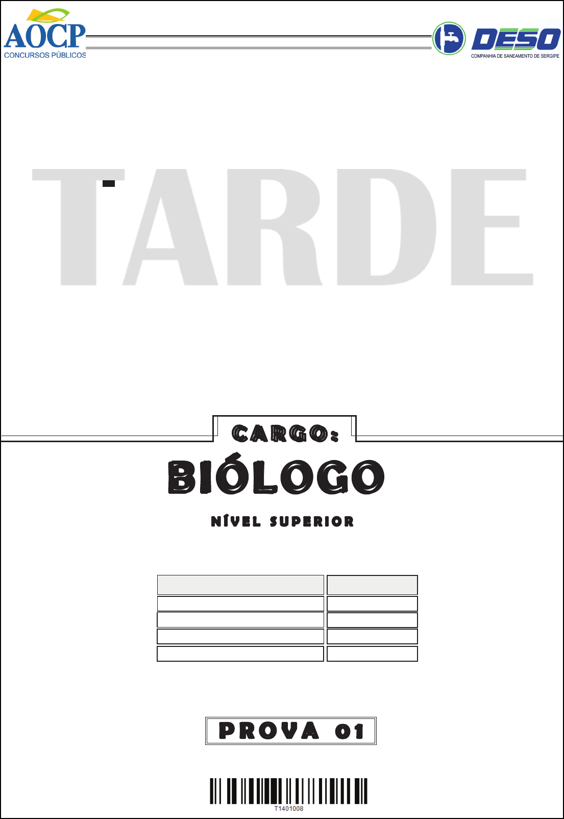 B I Ó L O G OB I Ó L O G O INSTRUÇÕES 1. Este Caderno de Questões não deve ser folheado antes da autorização do fiscal. 2. Na Folha de Respostas, realize a conferência de seu nome completo, do número de seu documento e do número de sua inscrição. As divergências devem ser comunicadas ao fiscal para as devidas providências. 3. Após ser autorizado pelo fiscal, verifique se o Caderno de Questões está completo, sem falhas de impressão e se a numeração está correta. Não esqueça de conferir se sua prova corresponde ao cargo para o qual você se inscreveu. Caso note alguma divergência, comunique ao fiscal imediatamente. 4. O único documento válido para a correção das provas é a Folha de Respostas, por isso tenha a máxima atenção no seu preenchimento, visto que a marcação da Folha de Respostas é de sua inteira responsabilidade. 5. Deverá ser utilizada caneta esferográfica transparente, com tinta de cor azul ou preta na marcação da Folha de Respostas. 6. Leia atentamente cada questão da prova e assinale, na Folha de Respostas, a opção que a responda corretamente. Exemplo correto da marcação da Folha de Respostas: 7. O limite dos campos de marcação da Folha de Respostas deverá ser respeitado, não podendo essa ser dobrada, amassada ou rasurada. 8. O candidato deverá marcar na Folha de Respostas o número que corresponde à sua prova. 9. Será atribuída nota 0 (zero), na correção da Folha de Respostas, às questões não assinaladas, que apresentarem mais de uma alternativa assinalada, emenda ou rasura, ainda que legível. 10. A prova deverá ser realizada no prazo de 4h (quatro horas), incluindo a marcação da Folha de Respostas, é importante controlar seu tempo. O candidato poderá anotar o gabarito no verso da capa da prova e levar consigo. 11. Você somente poderá deixar definitivamente a sala de prova após 60 (sessenta) minutos de seu início. Somente será possível levar o caderno de questões após decorridas 4h (quatro horas) do início da prova, sendo necessário, obrigatoriamente, devolver ao fiscal a Folha de Respostas assinada. As provas estarão disponibilizadas no site da AOCP (www.aocp.com.br), a partir da divulgação do Gabarito Preliminar. 12. A retirada da sala de prova dos 03 (três) últimos candidatos só ocorrerá conjuntamente e após a conferência de todos os documentos da sala, além da assinatura do termo de fechamento. 13. Durante a prova, não será permitida qualquer espécie de consulta ou comunicação entre os candidatos, nem a utilização de máquinas calculadoras e/ou similares, livros, anotações, réguas de cálculo, impressos ou qualquer outro material de consulta, inclusive códigos e/ou legislação. 14. Será eliminado do concurso público o candidato que, durante a realização das provas, for surpreendido utilizando: a) aparelhos eletrônicos, máquinas calculadoras, MP3, MP4, telefone celular, tablets, notebook, gravador, máquina fotográfica, controle de alarme de carro e/ou qualquer aparelho similar; b) livros, anotações, réguas de cálculo, dicionários, códigos e/ou legislação, impressos que não sejam expressamente permitidos ou qualquer outro material de consulta; c) relógio de qualquer espécie, óculos escuros ou quaisquer acessórios de chapelaria, tais como chapéu, boné, gorro, etc. 15. Incorrerá, também, na eliminação do candidato, caso, durante a realização das provas, qualquer equipamento eletrônico venha a emitir ruídos, mesmo que devidamente acondicionado no envelope de guarda de pertences. 16. Qualquer tentativa de fraude, se descoberta, implicará em imediata denúncia à autoridade competente, que tomará as medidas cabíveis, inclusive com prisão em flagrante dos envolvidos. GOVERNO DO ESTADO DE SERGIPE COMPANHIA DE SANEAMENTO DE SERGIPE - DESO R E F . E D I T A L N º 0 1 / 2 0 1 3 - C O N C U R S O P Ú B L I C O ATENÇÃO ● O Caderno de questões possui 50 (cinquenta) questões objetivas numeradas sequencialmente, de acordo com o exposto no quadro a seguir: ● Será entregue, pelo fiscal, a Folha de Respostas personalizada, na qual deverão ser transcritas as respostas das questões da prova objetiva. P R O V A 0 1 P R O V A 0 1 ATENÇÃO CANDIDATO! MARQUE NA FOLHA DE RESPOSTAS O NÚMERO CORRESPONDENTE À SUA PROVA NÚMERO DE QUESTÕES MATÉRIA Língua Portuguesa Informática Conhecimentos Gerais 01 a 10 11 a 15 16 a 20 Conhecimentos Específicos 21 a 50 C A R G O :C A R G O : N Í V E L S U P E R I O R www.pciconcursos.com.br O gabarito oficial preliminar e o caderno de questões da prova objetiva estarão disponíveis no endereço eletrônico www.aocp.com.br no dia seguinte à aplicação da prova. ------------------------------------------------------------------------------------(destaque aqui)-------------------------------------------------------------------------- FOLHA PARA ANOTAÇÃO DAS RESPOSTAS DO CANDIDATO Questão Resp. 01 02 03 04 05 06 07 08 09 10 11 12 13 14 15 16 17 18 19 20 Questão Resp. 26 27 28 29 30 31 32 33 34 35 36 37 38 39 40 41 42 43 44 45 21 22 23 24 25 46 47 48 49 50 P R O V A 0 1 P R O V A 0 1 www.pciconcursos.com.br PROVA 013Cargo: Biólogo limitação das meias-entradas tende a ser convertido em lucro empresarial – foi o que aconteceu com a isenção de PIS/Cofins concedida ao setor editorial em 2004: as editoras prometeram redução dos preços dos livros, mas os preços permaneceram os mesmos, e o valor da isenção foi incorporado pelas empresas. Além de provavelmente não baratear os ingressos, a limitação das meias-entradas substituiria um mecanismo coerente e justo de subsídio cruzado pelo princípio de que os últimos subsidiam os primeiros. 6.§ Se é verdade que em alguns eventos juvenis o percentual de meias-entradas chega a 80% dos ingressos, então, com a cota, os primeiros 40% que teriam direito ao benefício seriam subsidiados não pelos adultos que têm mais renda, mas por outros jovens, nas mesmas co