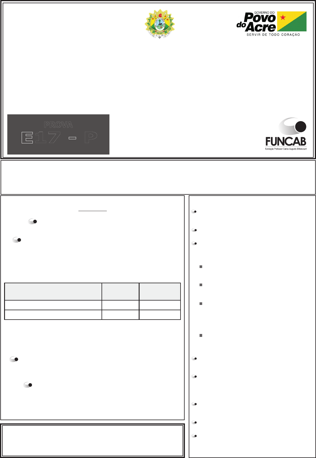 TRANSCREVA, EM ESPAÇO DETERMINADO NO SEU CARTÃO DE RESPOSTAS, A FRASE DO POETA MÁRIO QUINTANA PARA EXAME GRAFOTÉCNICO “Os verdadeiros analfabetos são os que aprenderam a ler e não leem.” BOA PROVA! www.funcab.org VERIFIQUE SE ESTE MATERIAL ESTÁ EM ORDEM, CASO CONTRÁRIO, NOTIFIQUE IMEDIATAMENTE O FISCAL. RESERVE OS 30 (TRINTA) MINUTOS FINAIS PARA MARCAR SEU CARTÃO DE RESPOSTAS. ATENÇÃO DURAÇÃO DA PROVA: 6 horas. ESTE CADERNO CONTÉM 80 (OITENTA) QUESTÕES DE MÚLTIPLA ESCOLHA, CADA UMA COM 5 ALTERNATIVAS DE RESPOSTA – A, B, C, D e E – CONFORME DISPOSIÇÃO ABAIXO, e PROVA DISCURSIVA: Professor Nível 2: Sociologia CONCURSO PÚBLICO para o cargo de ESTADO DO ACRE SECRETARIA DE ESTADO DA GESTÃO ADMINISTRATIVA SECRETARIA DE ESTADO DE EDUCAÇÃO E ESPORTE PROVA E17 - P Verifique se o tipo de prova deste caderno de questões confere com o seu cartão de respostas. ATENÇÃO: Após identificado e instalado na sala, você não poderá consultar qualquer material enquanto aguarda o horário de início da prova. Siga, atentamente, a forma correta de preenchimento do Cartão de Respostas, conforme estabelecido no próprio. Não haverá substituição do Cartão de Respostas por erro do candidato. O candidato só poderá retirar-se definitivamente da sala após 1 (uma) hora do início efetivo da prova; Somente faltando 1 (uma) hora para o término da prova, o candidato poderá retirar-se levando o seu Caderno de Questões; O candidato que optar por se retirar sem levar o seu Caderno de Questões não poderá copiar s u a s r e s p o s t a s p o r q u a l q u e r m e i o . O d e s c u m p r i m e n t o d e s s a d e t e r m i n a ç ã o s e r á registrado em ata e acarretará a eliminação do candidato; e Ao terminar a prova, o candidato deverá se retirar imediatamente do local, não sendo possível nem m e s m o a u t i l i z a ç ã o d o s b a n h e i r o s e / o u bebedouros. Ao terminar a prova, é de sua responsabilidade entregar ao fiscal o Cartão de Respostas assinado e Folha de Resposta da Prova Discursiva. Não se esqueça dos seus pertences. A Prova Discursiva deverá ser desenvolvida na Folha de Respostas, personalizada e desidentificada pelo candidato, que deverá destacar o canhoto que contém seus dados cadastrais. A Folha de Respostas da Prova Discursiva é o único documento válido para a correção. O preenchimento da Folha de Respostas será de sua inteira responsabilidade. Não haverá substituição da Folha de Respostas por erro do candidato. Os três últimos candidatos deverão permanecer na sala até que o último candidato entregue o Cartão de Respostas. O fiscal de sala não está autorizado a alterar qualquer dessas instruções. Em caso de dúvida, solicite a presença do coordenador local. Por motivo de segurança: LEIA AS INSTRUÇÕES ABAIXO Disciplinas Quantidade de questões Valor de cada questão Conhecimentos Didático-Pedagógicos 40 1,25 Conhecimentos Específicos 40 1,25 02 CONHECIMENTOS DIDÁTICO-PEDAGÓGICOS FUNCAB - Fundação Professor Carlos Augusto Bittencourt Questão 01 Segundo o art. 21 da LDB nº 9.394/1996, a educação escolar é composta de: A) Educação Infantil e Ensino Fundamental. B) Ensino Médio e Educação Superior. C) Educação Básica e Educação Superior. D) Educação Básica. E) Ensino Fundamental e Ensino Médio. Questão 02 De acordo com o § 1º do art. 5º da LDB nº 9.394/1996, o poder público, na esfera de sua competência federativa, deverá: I. recensear anua lmente as cr ianças e adolescentes em idade escolar, bem como os jovens e adultos que não concluíram a Educação Básica. II. fazer a chamada pública das crianças e adolescentes em idade escolar. III. oferecer destaque aos alunos assíduos. IV. zelar, junto aos pais ou responsáveis, pela frequência à escola dos alunos matriculados. V. exigir a frequência mínima de 80% para os alunos da Educação Infantil. Marque a opção que assinala as afirmações corretas. A) Somente I, II e IV. B) Somente II, III e V. C) Somente I e V. D) Somente III, IV e V. E) Somente II, III e IV. Questão 04 Segundo o art. 56 da Lei nº 8.069/1990, os dirigentes de estabelecimentos de Ensino Fundamental deverão comunicar ao Conselho Tutelar quando houver a incidência de: A) alunos sem uniforme. B) alunos sem material didático-escolar. C) alunos sem professor. D) reiteração de faltas injustificadas de pais dos alunos nas reuniões da escola. E) elevados níveis de repetência. Questão 05 A Educação Ambiental, de acordo com a Lei nº 9.795/1999, deve ser entendida como: A) uma disciplina específica a ser implantada no currículo do Ensino Fundamental. B) uma prática educativa a ser desenvolvida de forma integrada, contínua e permanente nas modalidades de ensino. C) um meio pelo qual o indivíduo e a coletividade padronizam valores sociais, conhecimentos, habilidades, atitudes e competências voltadas para a manutenção das relações já estabelecidas com o meio ambiente. D) componente exclusivo da educação formal. E) processo societário independente e autônomo dos programas educativos desenvolvidos pelas instituições escolares. Questão 06 São conteúdos programáticos para a implementação da temática História e Cultura afro-brasileira na rede de ensino: I. História da África e dos africanos. II. A valorização social do negro e de sua contribuição para a história brasileira, sobretudo no que tange à utilização de sua força de trabalho. III. A contribuição do povo negro nas áreas social, econômica e política pertinente à História do Brasil. IV. Aluta dos negros no Brasil. Assinale a alternativa que apresenta os conteúdos corretos. A) Somente I, III e IV. B) Somente I e III. C) Somente II, III e IV. D) Somente III e IV. E) Somente II e IV. Questão 03 O Inciso I do art. 5° da Lei nº 9.795/1999 prevê que o desenvolvimento de uma compreensão integrada do meio ambiente, em suas múltiplas e complexas relações, est
