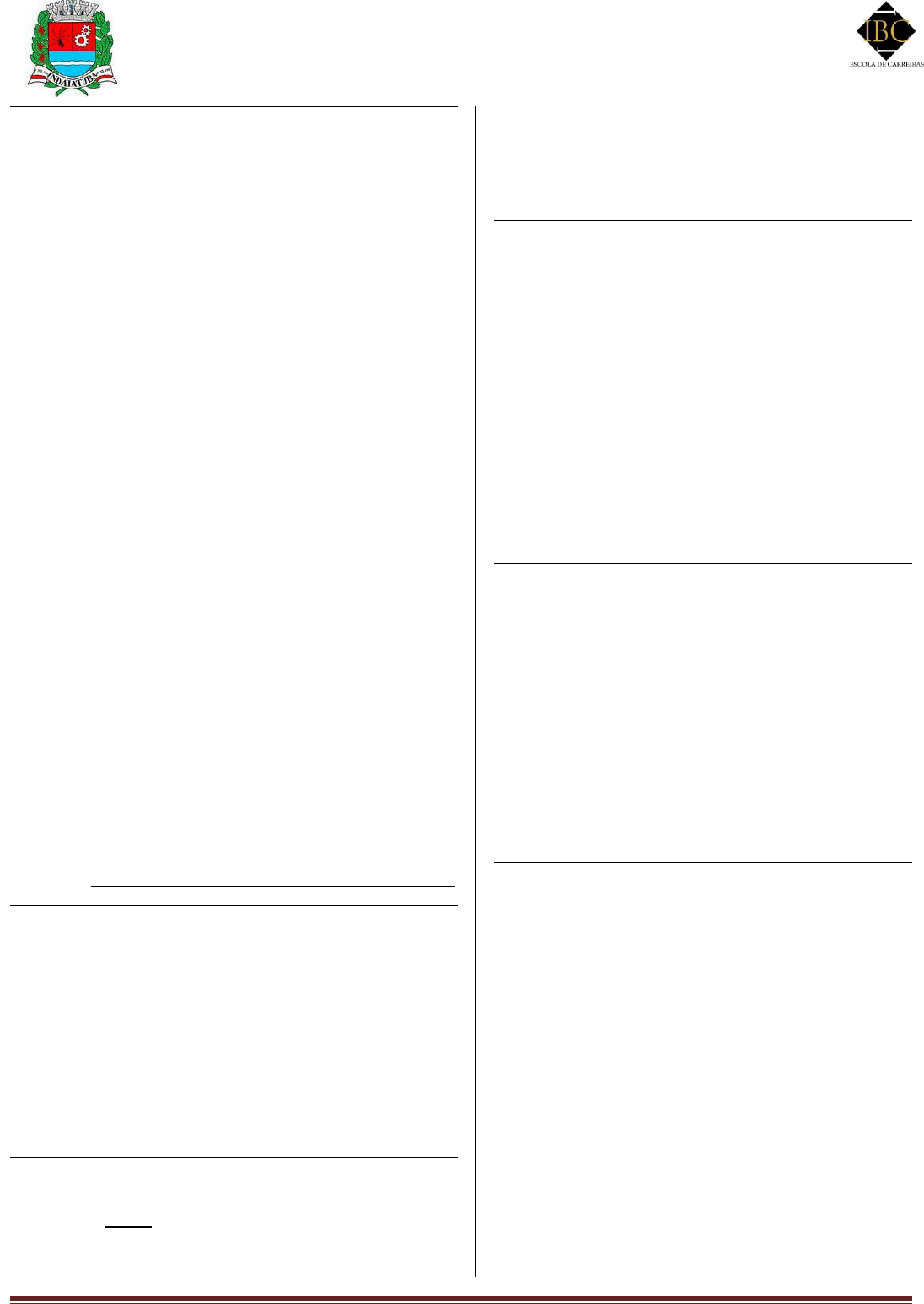 PREFEITURA DO MUNICÍPIO DE INDAIATUBA – SP CONCURSO PÚBLICO DE PROVAS Nº 01 /2013 PROVA OBJETIVA – CARGO: 2.02 – AGENTE FISCAL MUNICIPAL IBC- Página 1 Leia o texto abaixo para responder as questões de nº 01 à 02. Manter corpo hidratado no inverno é essencial, alerta especialista da USP. Apesar de as pessoas costumarem sentir menos sede no inverno, manter o corpo bem hidratado nessa época do ano é fundamental para seu bom funcionamento e evitar doenças típicas da estação, alerta o professor e pesquisador Antonio Herbert Lancha Júnior, especialista em educação física e nutrição da Universidade de São Paulo (USP). Em entrevista à Agência Efe, Lancha, que também foi professor visitante do HumanNutritionResearch Center onAging da Universidade Tufts, em Massachusetts (EUA), disse que no inverno as pessoas se esquecem de redobrar a atenção para a ingestão de líquidos - algo essencial, já que o corpo é composto por 60% de água e esse conteúdo tem que ser renovado permanentemente. "A hidratação é muito mais do que tomar um copo de água. A reposição tem que ser permanente e variada. Quanto mais diversificada a fonte de hidratação, maior a possibilidade do indivíduo se manter hidratado", disse Lancha, que recomenda atenção especial para lactantes e crianças, cujos corpos têm uma porcentagem de água ainda maior.(....) http://noticias.uol.com.br/saude/ultimas- noticias/efe/2013/05/07/manter-corpo-hidratado-no-inverno-e- essencial-alerta-especialista-da-usp.htm em 07/05/2013 QUESTÃO 01 De acordo com o texto acima todas as alternativas estão corretas exceto: a) O corpo é composto por 60% de água. b) Lactantes e crianças não devem tomar muita água durante o inverno. c) É muito importante hidratar o corpo no inverno para evitar doenças. d) As pessoas precisam redobrar a atenção para a ingestão de líquidos durante o inverno. QUESTÃO 02 No trecho “...atenção especial para lactantes e crianças, cujos corpos têm uma porcentagem de água ainda maior.” O termo destacado trata-se de um: a) pronome demonstrativo b) pronome possessivo c) pronome relativo d) pronome pessoal QUESTÃO 03 Observe as seguintes orações: I) O operário feriu-se no trabalho. II) Mandaram buscá-lo em casa. III) Fizeram-nos esperar. IV) Não há nada entre eu e ti. Quanto à colocação dos pronomes em destaque podemos afirmar que: a) As orações dos quatro itens apresentam colocação pronominal correta. b) As orações I, II e III estão corretas. c) As orações dos quatro itens apresentam colocação pronominal incorreta. d) As orações I, III e IV estão corretas. QUESTÃO 04 Lendo atentamente as orações dos períodos a seguir, indique a única alternativa que apresenta erro quanto à pontuação: a) Enquanto o marido pescava, Ana preparava o jantar. b) O vento assoprou tão forte que arrancou mais de uma árvore. c) “ Dali eu via sem ser visto a sala de visitas.” (Lúcio de Mendonça) d) “ –Que tem isso? perguntava-lhe eu.” (Machado de Assis) QUESTÃO 05 Assinale a alternativa que apresenta oração com sujeito oculto. a) Viajarei amanhã. b) Paulo e Ricardo nadavam ao lado da canoa. c) Regina comprou um livro. d) Come-se bem naquele restaurante. QUESTÃO 06 Na frase: “ Estive na cidade maravilhosa a duas semanas atrás.” A expressão em destaque trata-se de uma: a)Paráfrase b) Ideia central c) Perífrase d) Síntese www.pciconcursos.com.br PREFEITURA DO MUNICÍPIO DE INDAIATUBA – SP CONCURSO PÚBLICO DE PROVAS Nº 01 /2013 PROVA OBJETIVA – CARGO: 2.02 – AGENTE FISCAL MUNICIPAL IBC- Página 2 QUESTÃO 07 Examinando a grafia das seguintes palavras: I) enxaqueca II) analisar III)contrareforma IV) ansioso Podemos afirmar que: a) As palavras I, II e IV estão corretas b) Todas as palavras estão incorretas c) Apenas a palavra IV está incorreta d) Todas as palavras estão corretas QUESTÃO 08 Nas frases: “ A Helena estuda à noite.” “ Ambas as mãos estavam feridas.” “ A opinião dela era importante para nós.” As palavras destacadas classificam-se respectivamente como: a)artigo indefinido / numeral / pronome demonstrativo b)numeral / numeral / pronome possessivo c)artigo definido / numeral / pronome possessivo d)artigo definido / numeral / pronome demonstrativo QUESTÃO 09 Assinale a opção que apresenta a regência imprópria. a) Não a via desde o mês passado. b) Fomos à cidade pela manhã. c) Informou ao cliente que o produto chegara. d) Avisou-lhe de que o cheque foi pago. QUESTÃO 10 Assinale a opção que completa corretamente as lacunas da frase: “A......................de um ataque terrorista provoca uma grande...............na humanidade.” a) expectativa / tenção b) expectativa / tensão c) espectativa / tensão d) espectativa / tenção QUESTÃO 11 Ao chegar em casa João resolveu fazer uma vitamina. Em sua geladeira tinha 12 maças, 3 mamões e 12 morangos. Ao fazer a vitamina ele usou 1/4 das maçãs, 1/3 dos mamões e 3/4 dos morangos. Quantas frutas João utilizou para fazer a sua vitamina? a) 27 b) 12 c) 24 d) 13 QUESTÃO 12 Qual a solução para a seguinte expressão aritmética: a) 11/12 b) 12/15 c) 4/15 d) 13/12 QUESTÃO 13 Uma vendedora de aviamentos vendou 3/7 de um rolo de fita de cetim e ainda lhe restaram 12 metros. Qual o comprimento total da fita de cetim contida no rolo? a) 37 m b) 12 m c) 21 m d) 36 m QUESTÃO 14 Uma corrida de moto deveria ter início às 10h 13min 49s, no entanto devido a péssimas condições climática teve início apenas Às 11h 42min 59s. O primeiro colocado cruzou a linha de chegada às 12h 37 min 15s. Em quanto tempo o primeiro colocado cumpriu a prova? a) 00h 54min 16s b) 01h 05min 44s c) 00h 54min 16s d) 01h 54min 16s QUESTÃO 15 Um corpo descreveu uma dada trajetória ao percorrer uma distância de 133 m e 42 cm, como podemos exprimir essa distância em quilômetros? a) 0,13342 b) 1,4233 c) 1,3342 d) 0,175 QUESTÃO 16 Segundo os cálculos de um engenheiro, para 