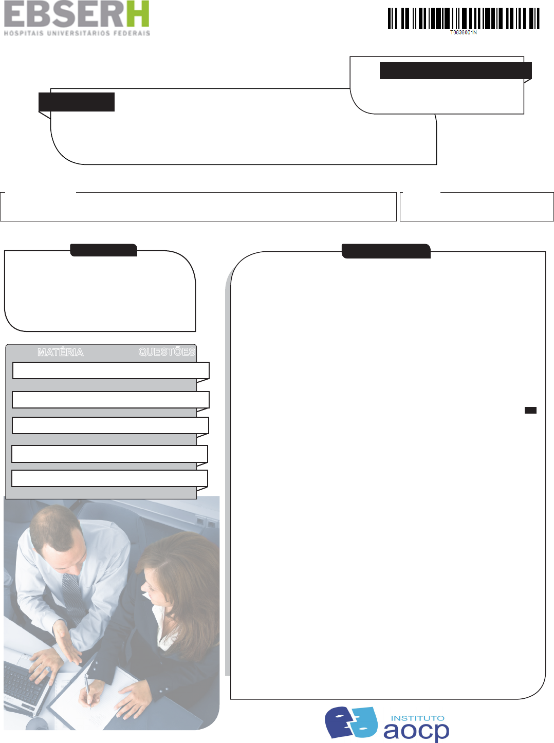 Cargo Concurso Público REF. EDITAL N° 04 NÍVEL SUPERIOR - TARDE QUESTÕESMATÉRIA Raciocínio Lógico e Matemático 11 a 15 Língua Portuguesa 01 a 10 Legislação Aplicada à EBSERH 16 a 20 Legislação Aplicada ao SUS 21 a 25 ATENÇÃO ADVOGADO INSTRUÇÕES Conhecimentos Específicos 26 a 50 HDT-UFT - HOSPITAL DE DOENÇAS TROPICAIS DA UNIVERSIDADE FEDERAL DO TOCANTINS CONCURSO PÚBLICO 07/2015-EBSERH/HDT-UFT EDITAL Nº 04 – EBSERH – ÁREA ADMINISTRATIVA Nome do Candidato Inscrição O Caderno de questões possui 50 (cinquenta) questões objetivas, numeradas sequencialmente, de acordo com o exposto no quadro a seguir: 1. Na sua Folha de Respostas, confira seu nome, o número do seu documento e o número de sua inscrição. Além disso, não se esqueça de conferir seu Caderno de Questões quanto a falhas de impressão e de numeração, e se o cargo corresponde àquele para o qual você se inscreveu. Preencha os campos destinados à assinatura e ao número de inscrição. Qualquer divergência comunique ao fiscal. 2. O único documento válido para avaliação da prova é a Folha de Respostas. Só é permitido o uso de caneta esferográfica transparente de cor azul ou preta para o preenchimento da Folha de Respostas, que deve ser realizado da seguinte maneira: 3. O prazo de realização da prova é de 4 (quatro) horas, incluindo a marcação da Folha de Respostas. Após 60 (sessenta) minutos do início da prova, o candidato estará liberado para utilizar o sanitário ou deixar definitivamente o local de aplicação. A retirada da sala de prova dos 3 (três) últimos candidatos só ocorrerá conjuntamente. 4. Ao término de sua prova, comunique ao fiscal, devolvendo-lhe a Folha de Respostas devidamente preenchida e assinada. O candidato poderá levar consigo o Caderno de Questões, desde que aguarde em sala o término da aplicação. 5. As provas e os gabaritos preliminares estarão disponíveis no site do Instituto AOCP - www.institutoaocp.org.br - no dia posterior à aplicação da prova. 6. Implicará na eliminação do candidato, caso, durante a realização das provas, qualquer equipamento eletrônico venha emitir ruídos, mesmo que devidamente acondicionado no envelope de guarda de pertences. O NÃO cumprimento a qualquer uma das determinações constantes em Edital, no presente Caderno ou na Folha de Respostas, incorrerá na eliminação do candidato. O gabarito oficial preliminar e o caderno de questões da prova objetiva estarão disponíveis no endereço eletrônico www.institutoaocp.org.br no dia seguinte à aplicação da prova. ------------------------------------------------------------------------------------(destaque aqui)-------------------------------------------------------------------------------- FOLHA PARA ANOTAÇÃO DAS RESPOSTAS DO CANDIDATO Questão Resp. 01 02 03 04 05 06 07 08 09 10 11 12 13 14 15 16 17 18 19 20 21 22 23 24 25 26 27 28 29 30 31 32 33 34 35Questão Resp. 36 37 38 39 40 41 42 43 44 45 46 47 48 49 50 3 Cargo: Advogado L Í N G U A P O R T U G U E S A Terapeuta junta quase 40 livros de colorir e coleção vira objeto de estudo Os livros de colorir para adultos se tornaram um fenômeno de vendas, mas enquanto alguns não se tornam fãs tão adeptos, a terapeuta Simone Mascarenhas aproveitou a sua coleção pessoal para usá-la como objeto de estudo. Após ganhar o primeiro exemplar em abril deste ano, a moradora de Sorocaba (SP) já possui 40 livros do tipo. “Achei interessante. Fui comprando outros para colorir e estudar esse movimento com um foco mais sociológico.” Simone tem 46 anos e conta que dedica até duas horas diárias, geralmente à noite, para a atividade. Ela também busca por vídeos na internet que trazem ideias e inspiração para colorir. A mesa espaçosa com dezenas de lápis de cor organizados em potes mostram um gosto antigo que voltou a integrar a rotina da terapeuta. “Já fiz cursos de desenho e pintura, mas já faz uns 30 anos que estudei isso. Agora que retomei o hobby, estou relembrando as técnicas e até estudando de novo.” A febre dos livros de colorir chamou a atenção de Simone, não só pela retomada de uma atividade que lhe dava prazer, mas também pela mudança de comportamento que tem observado nas pessoas. “A partir do momento em que adotam esses livros de colorir como um hobby, as pessoas deixam um pouco de lado as redes sociais e param de se preocupar com a vida dos outros para prestar mais atenção em si mesmas, conhecer gente nova, desenvolver a criatividade e até despertar um lado artístico”, explica. Segundo a terapeuta, a atividade contribuiu para melhorar a qualidade das relações. “Melhorou a interação familiar porque os pais estão sentando com os filhos para pintar o livro. Tenho visto idosos pintando, se divertindo e achei isso muito bacana. Os temas dos desenhos tendem a despertar a vontade de pesquisar, aprender, conhecer e até viajar”, ressalta Simone. Os benefícios também puderam ser percebidos na rotina dela. “Na correria do dia a dia, a gente se esquece de prestar atenção em coisas novas. Agora eu sempre passo na livraria para ver e comprar as novidades que me agradam. Pintar me distrai e estimula minha curiosidade porque eu quero saber que flor é aquela, que lugar é aquele do desenho e ‘quebro a cabeça’ até achar os nomes para saber mais a respeito”. Perfeccionismo Os livros, lançados no Brasil no final de 2014, têm temas que vão desde a natureza até histórias em quadrinhos, mas são os que reproduzem mandalas que ficam entre os preferidos da terapeuta. Os materiais utilizados para pintar são os mais variados: lápis de cor, canetinhas, tintas e o que mais a criatividade permitir. “Já vi pessoas usando vários [materiais], como glitter e até maquiagem, algo que nunca pensei em usar para pintar. Sempre estou experimentando coisas novas também e misturo materiais no mesmo desenho. Mas sou perfeccionista, se erro uma parte, fico irritada”, 